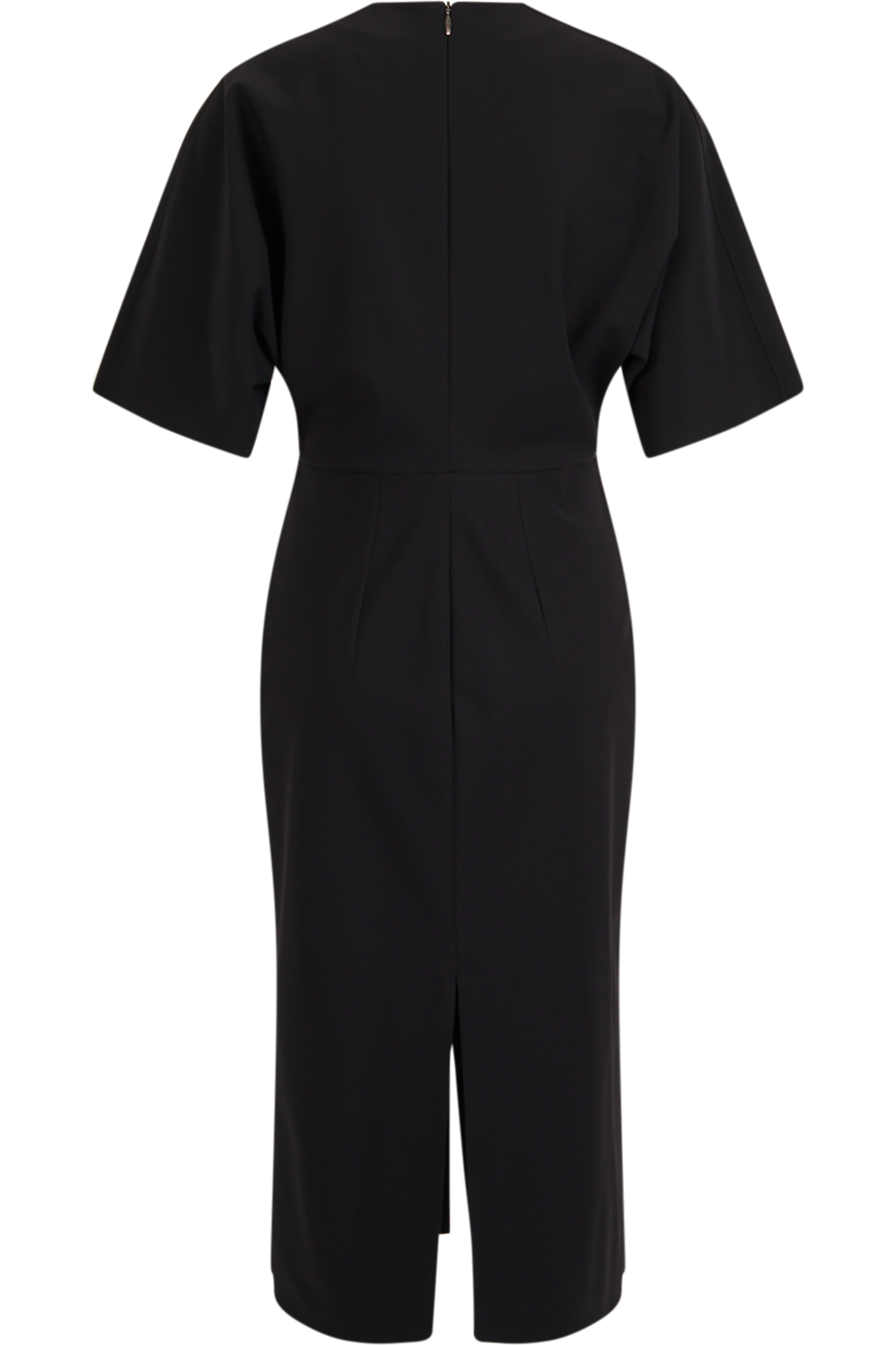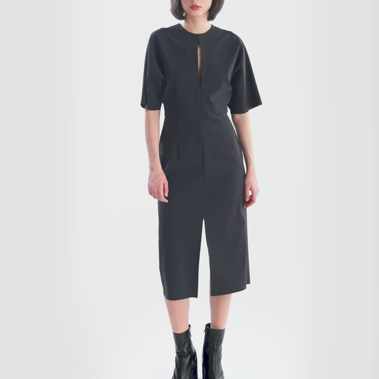 This fashionable, sporty dress made of technical stretch stands out with its elegant silhouette, which is characterised by a narrow, calf-skimming skirt and a wide-cut top. With cropped short sleeves and a sophisticated slit cut-out at the neckline, the dress has a modern touch. The skirt has a slit at both the front and back. A concealed zip at the centre back makes it easy to put on, while the logo transfer at the front hem rounds off the design.