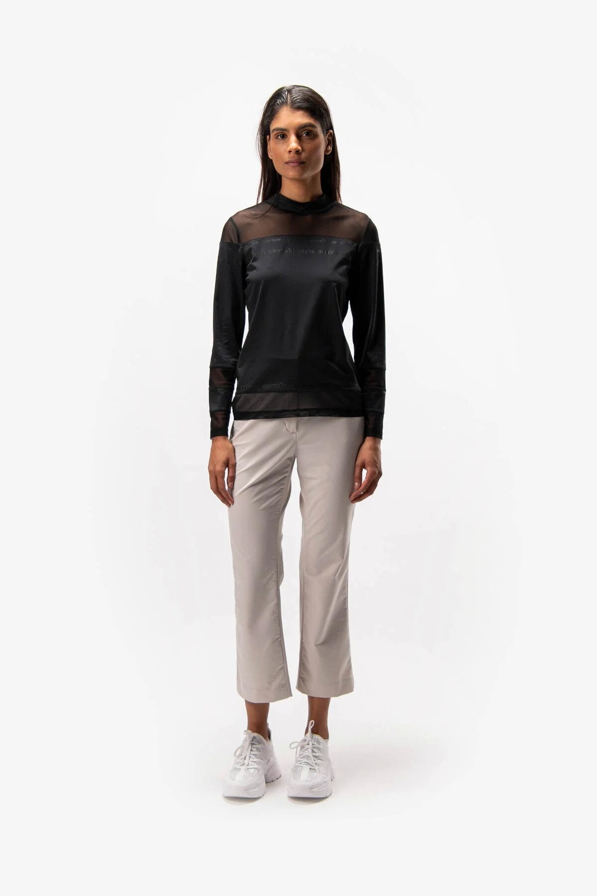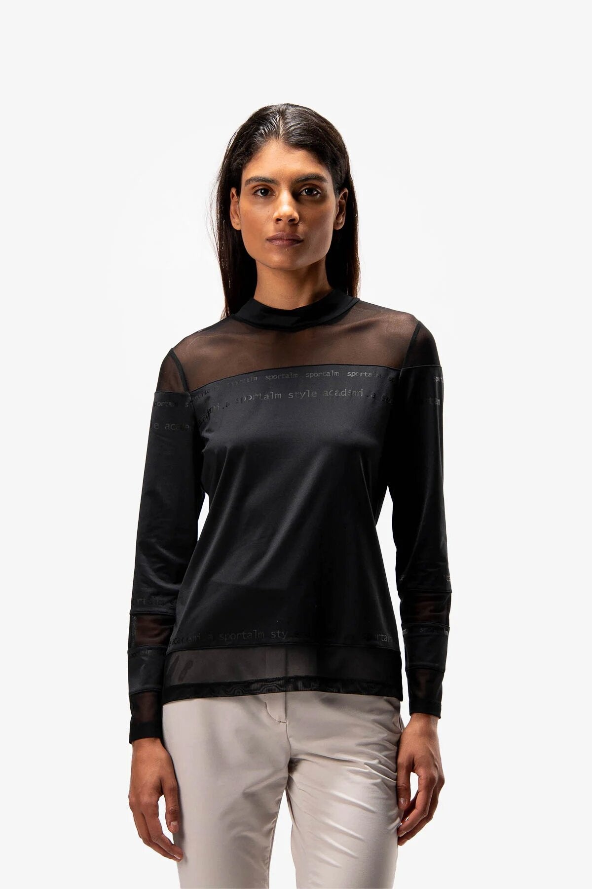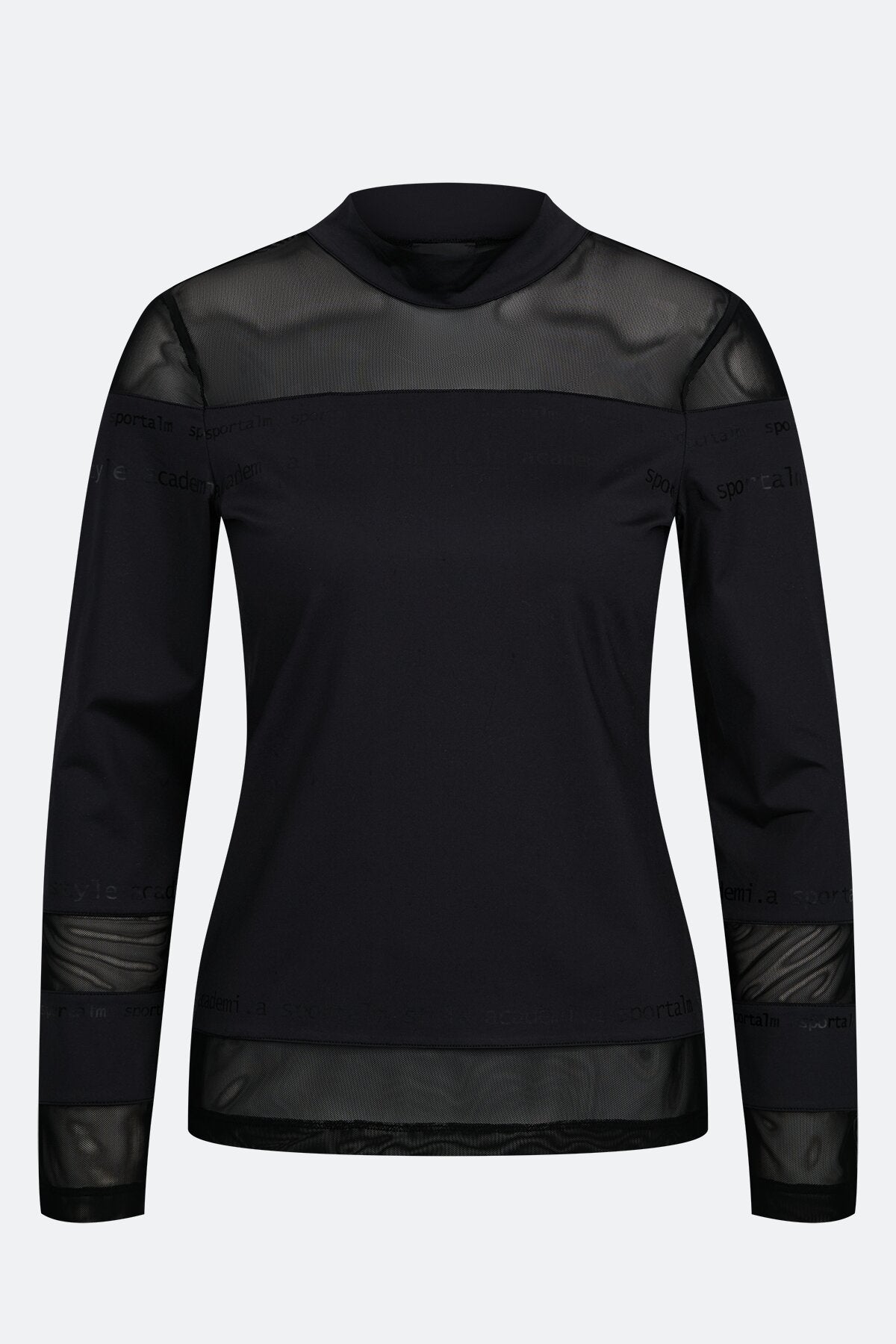 This body-hugging, long-sleeve shirt with a stand-up collar is a comfortable and stylish piece, thanks to the high-quality jersey and sheer mesh fabric blend.