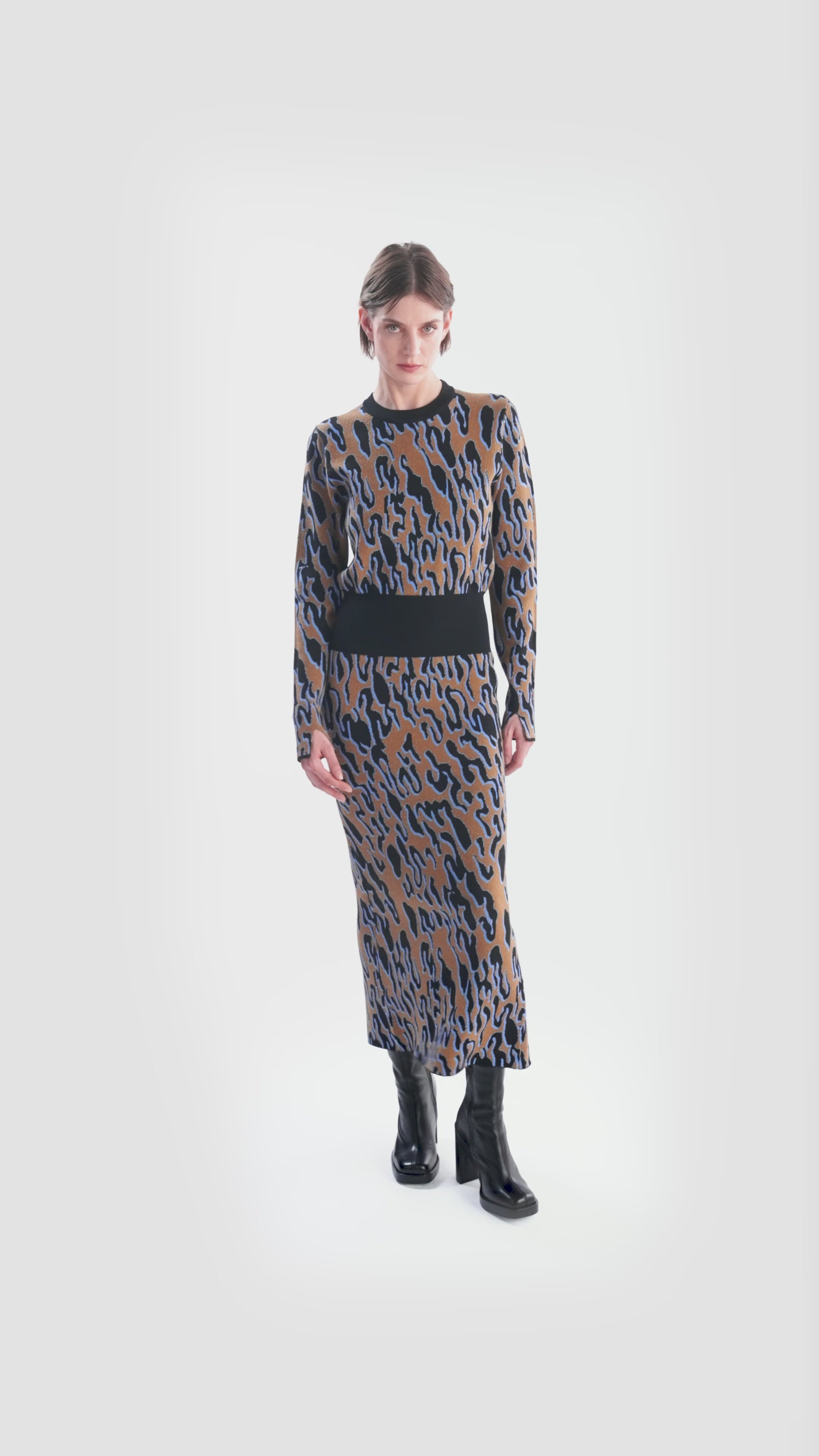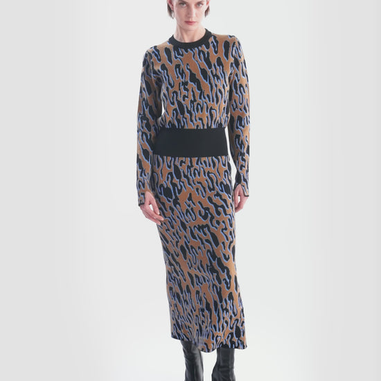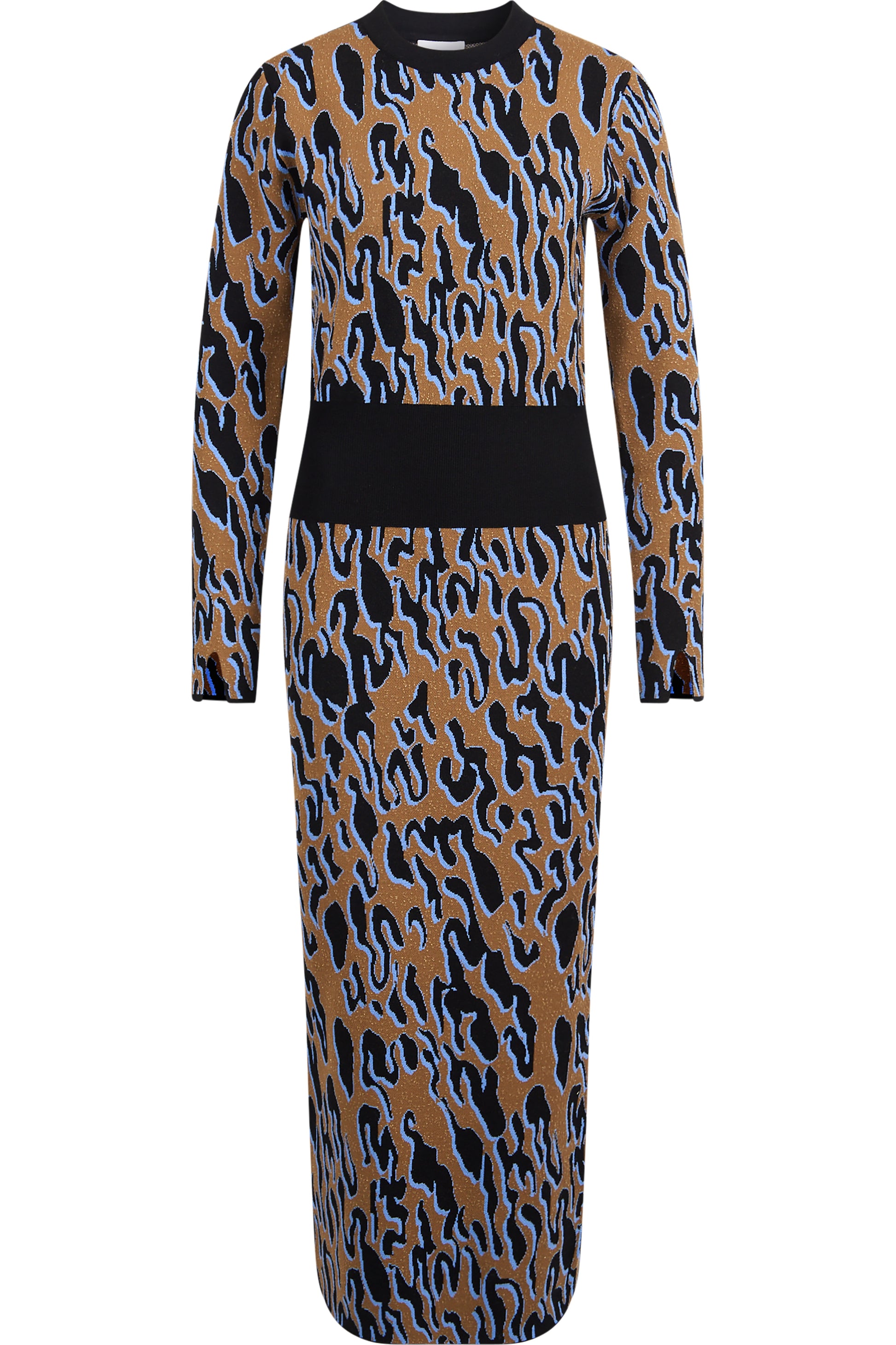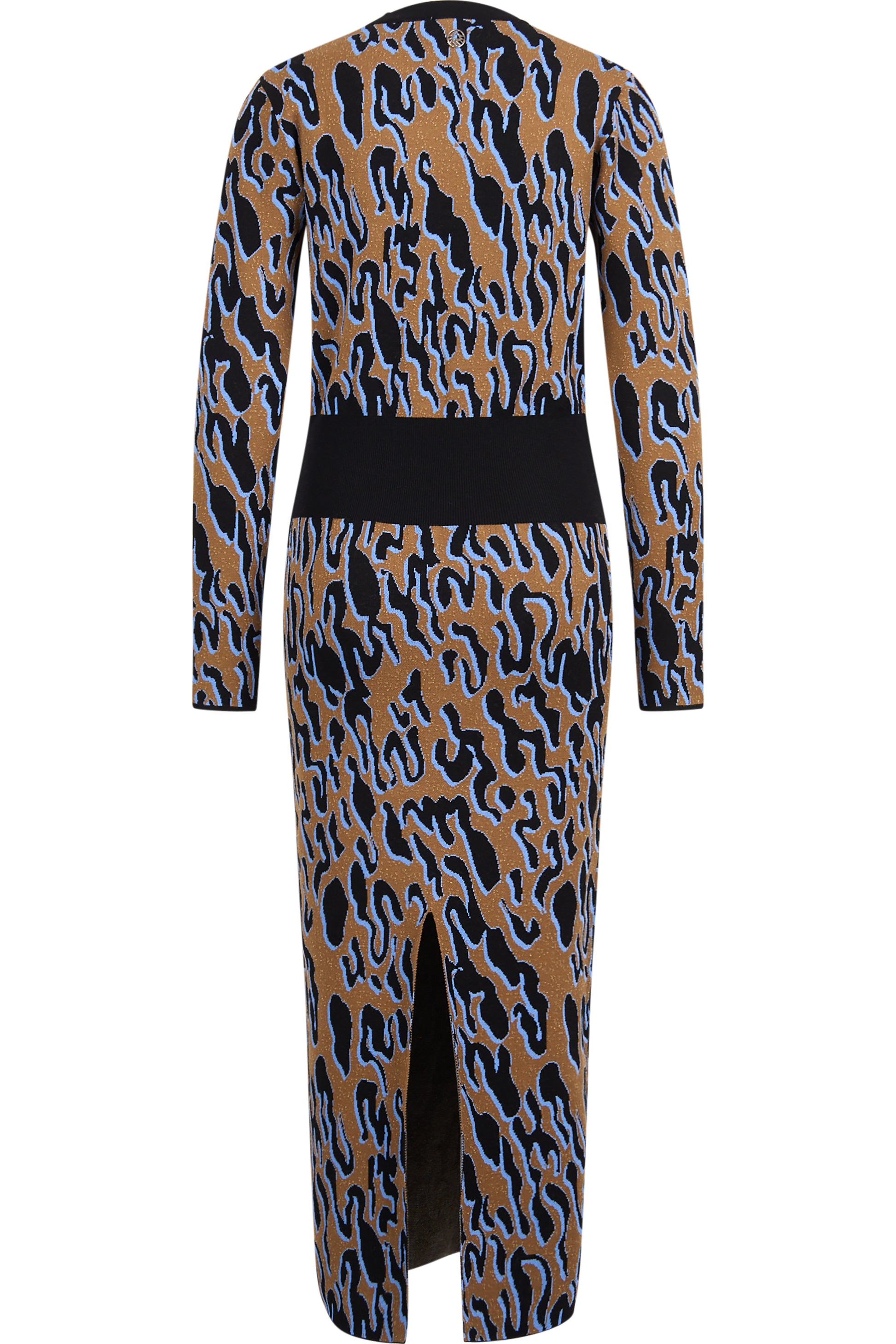 Crafted from a matte viscose-elastane blend, shiny viscose-elastane and gold lurex, this knitted dress features a three-tone leopard jacquard with partial lurex effects for a glamorous look.