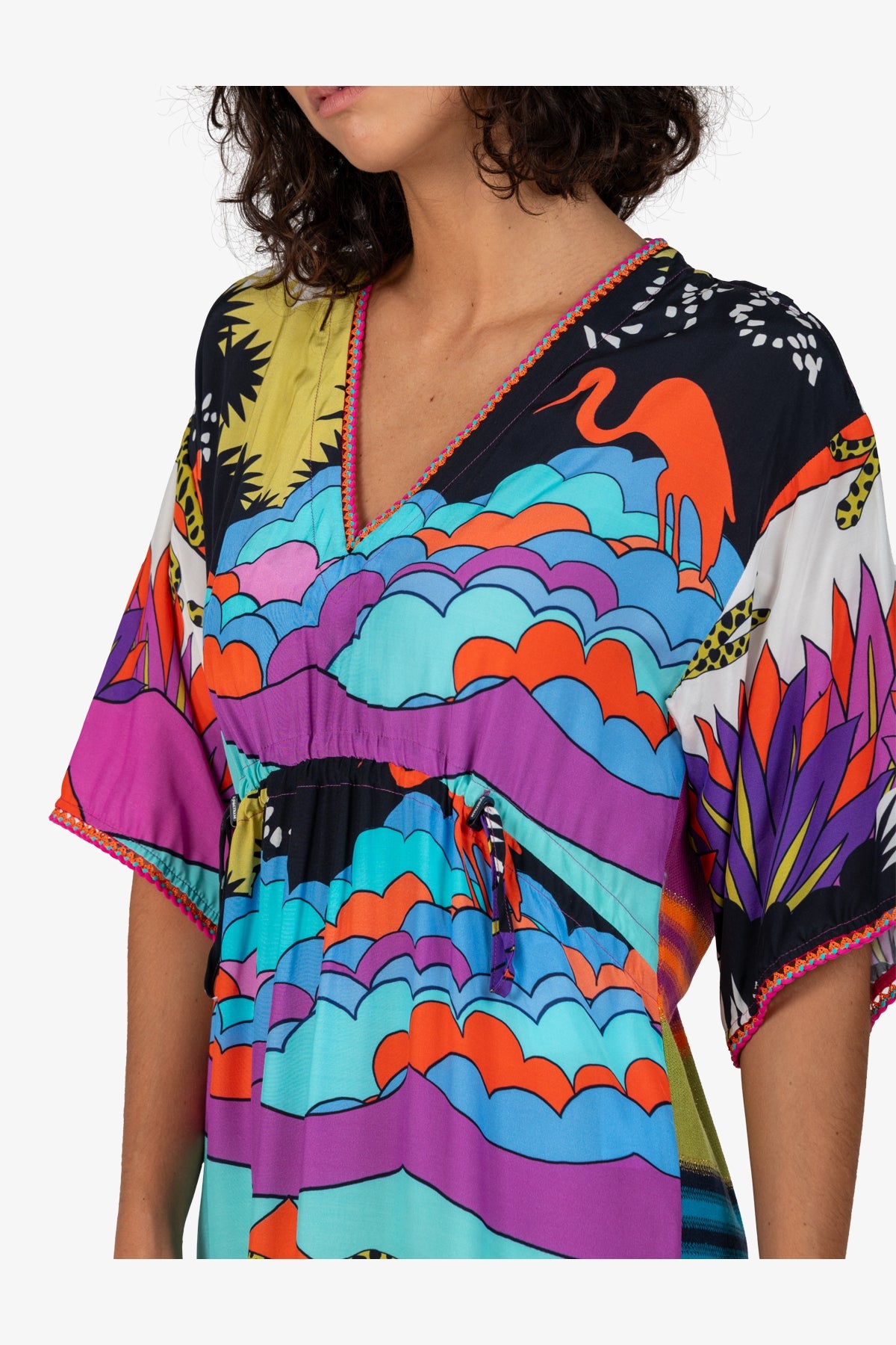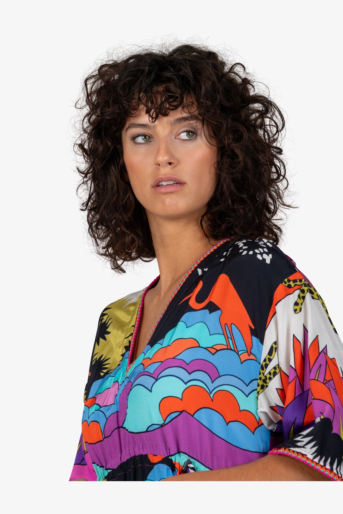 This short tunic dress impresses with a sophisticated gathering at the waist and a colourful print. It combines stylish elegance with summery lightness and is ideal for a variety of occasions.