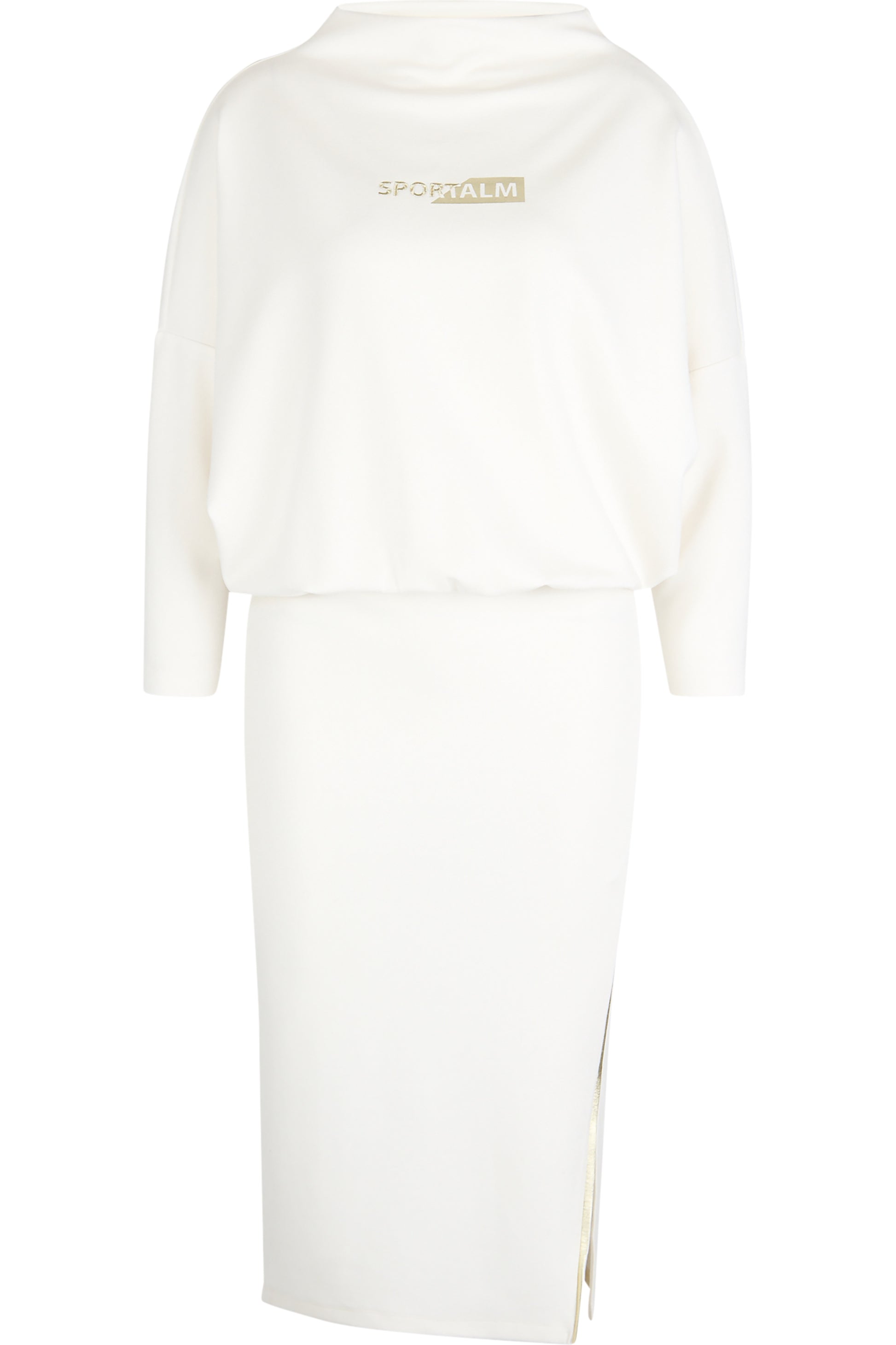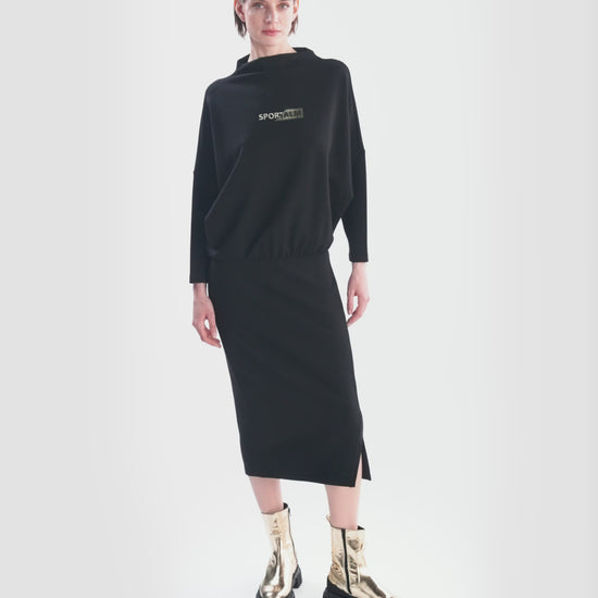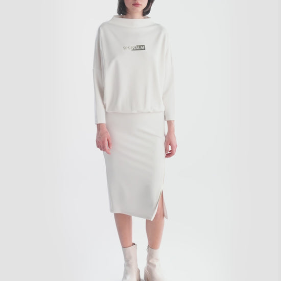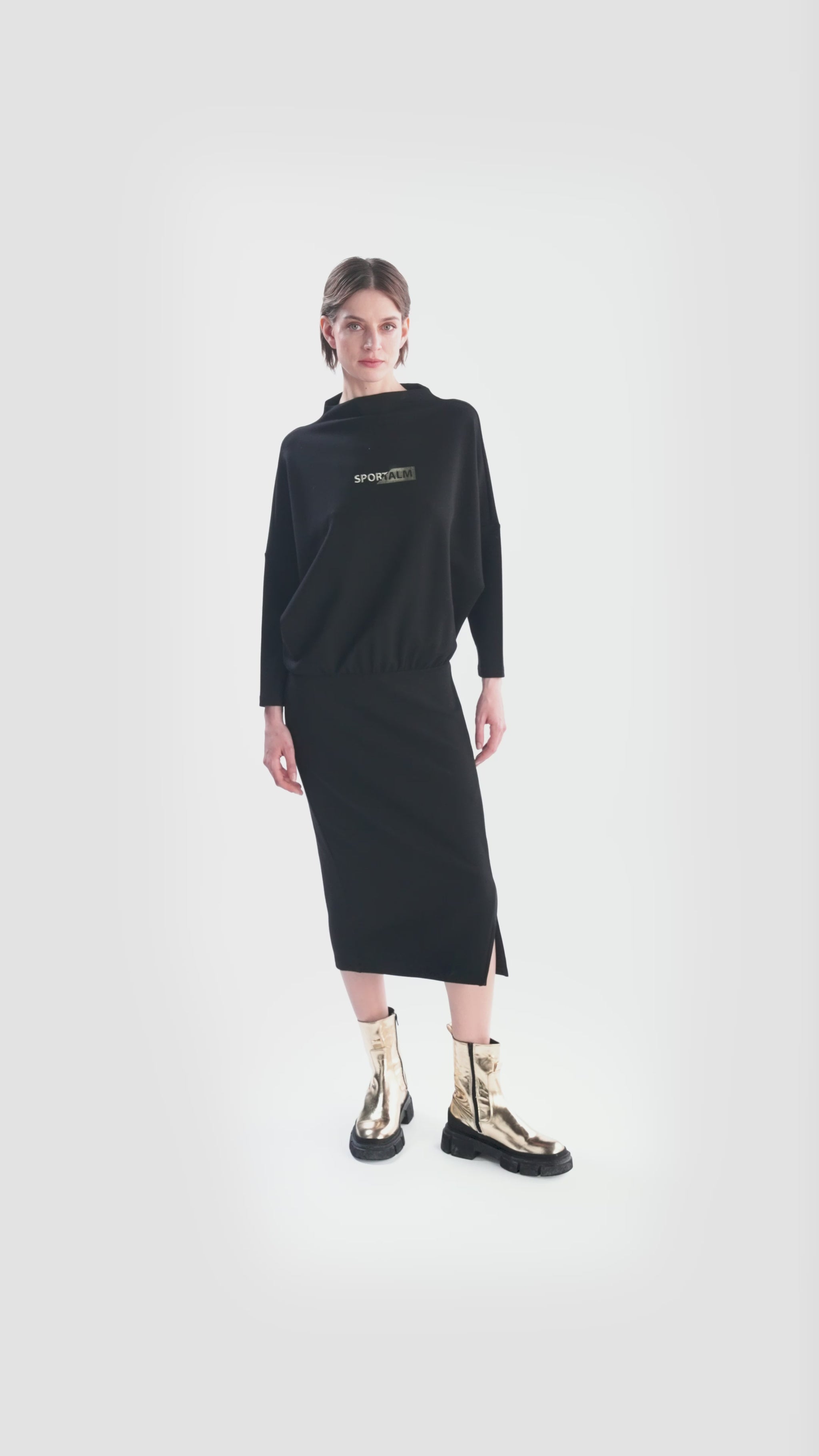 Made from soft modal fabric, this sweat dress combines comfort and style. The oversized top meets a tight pencil skirt with slanted dividing seam and a side slit with tonal tape print.The chalice collar, slightly dropped shoulders and the 7/8-arm give the dress a casual elegance.