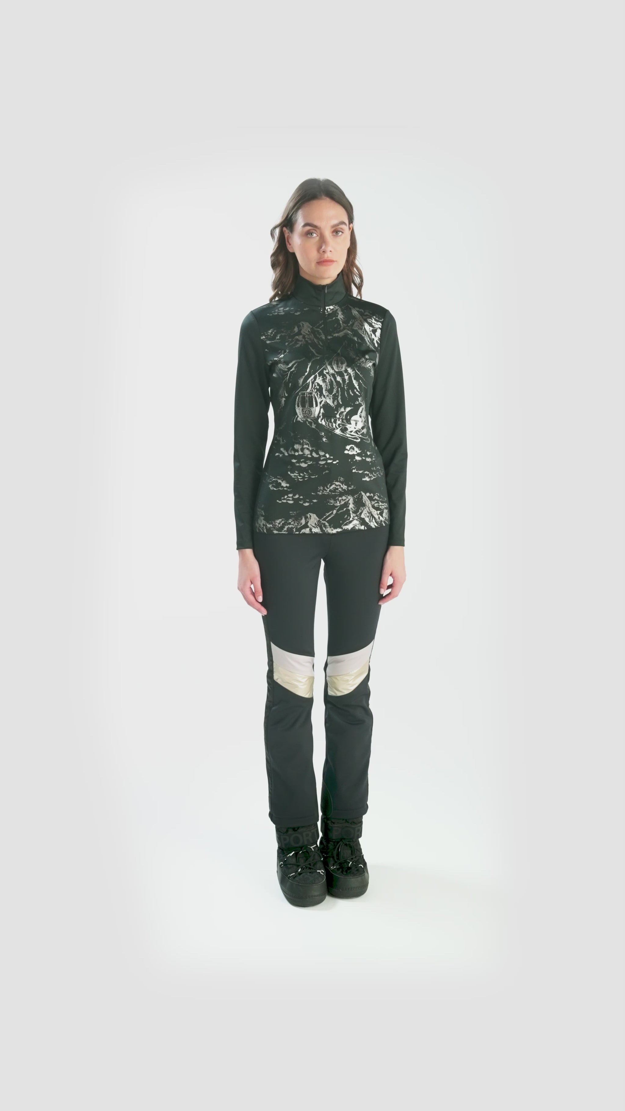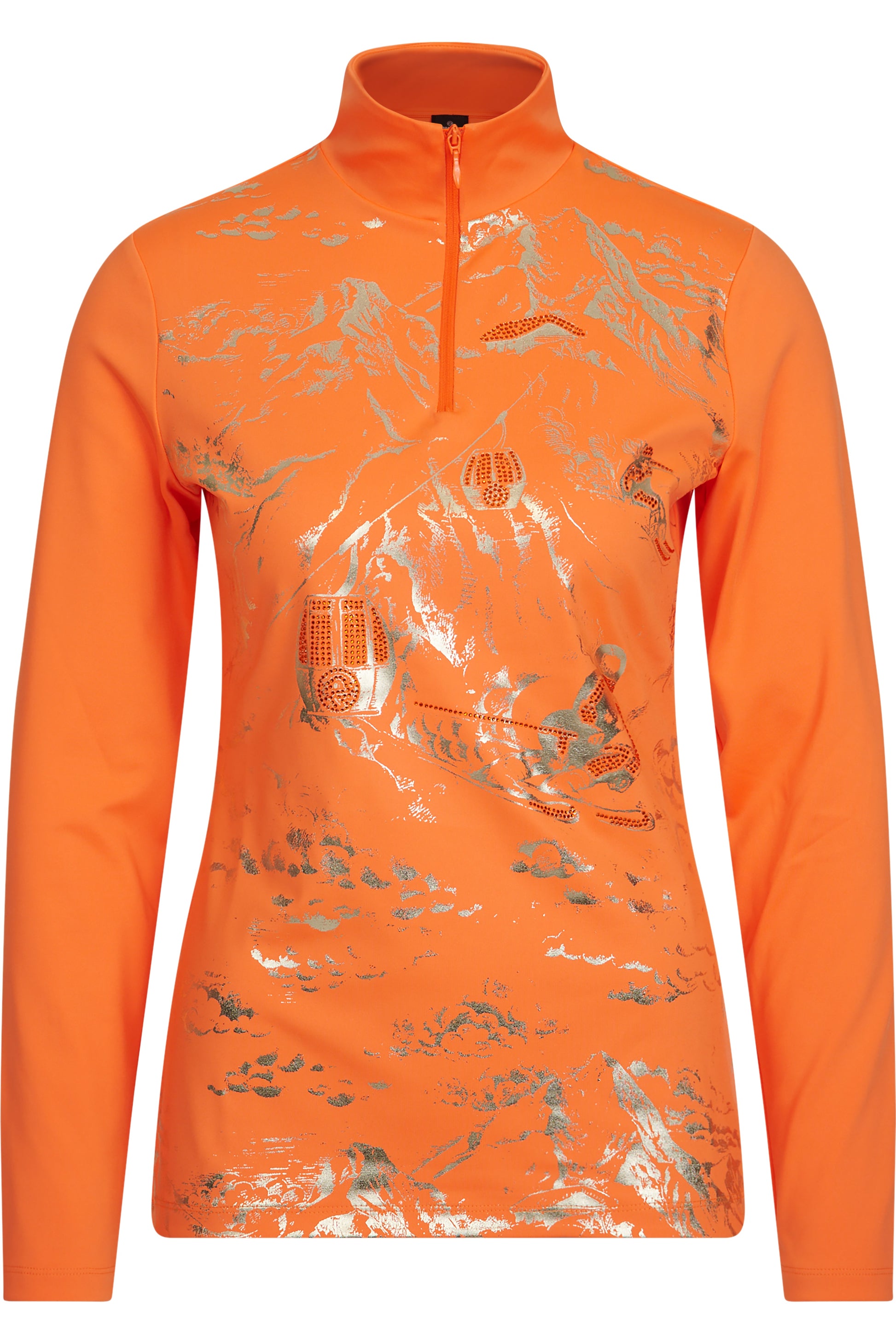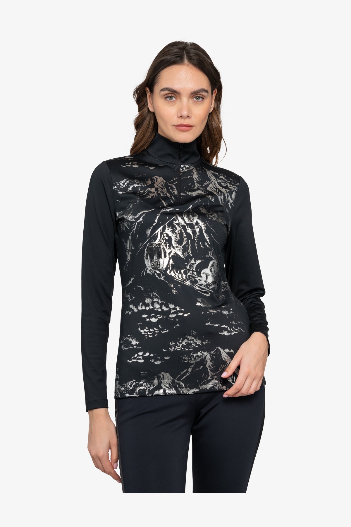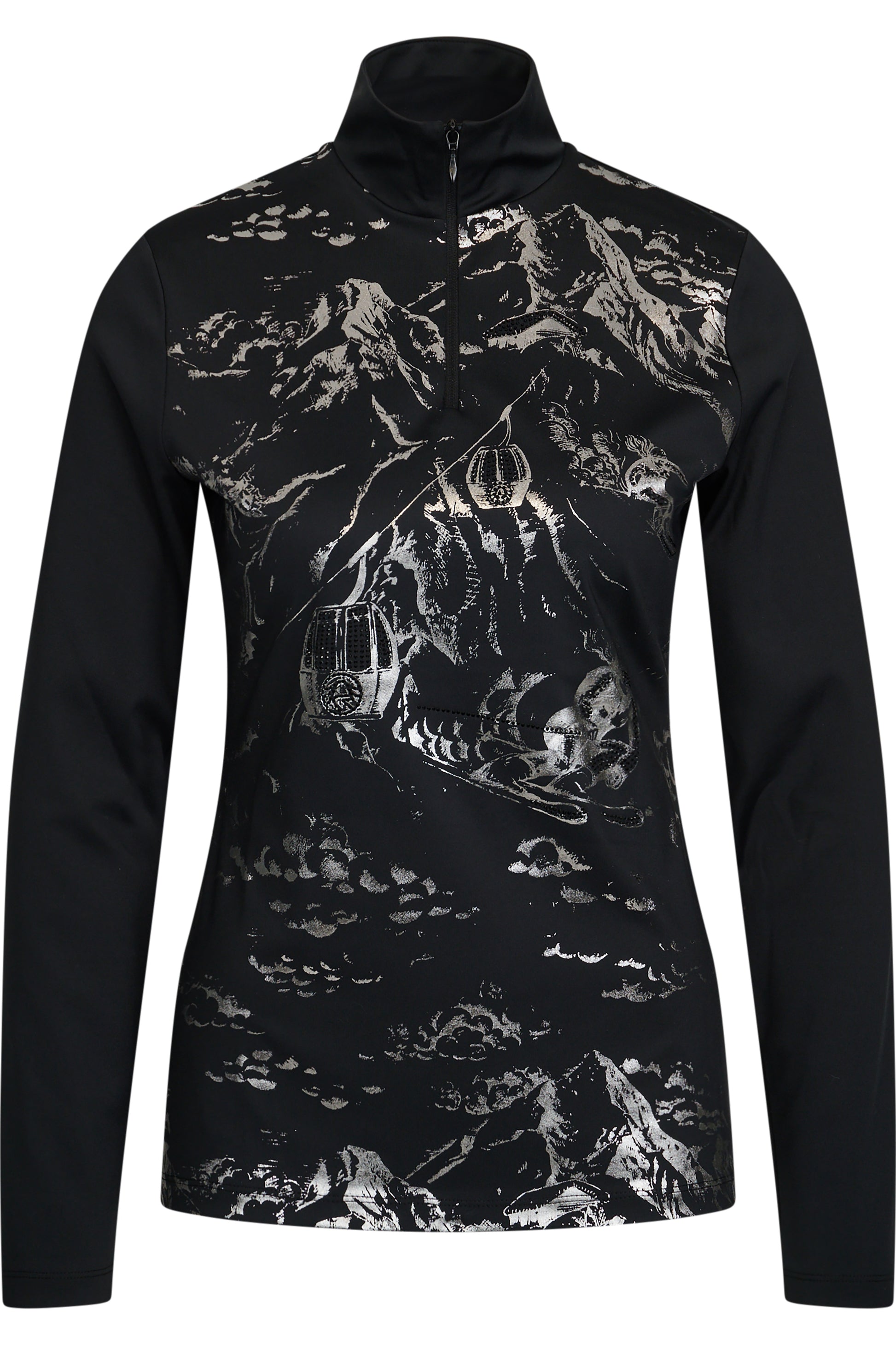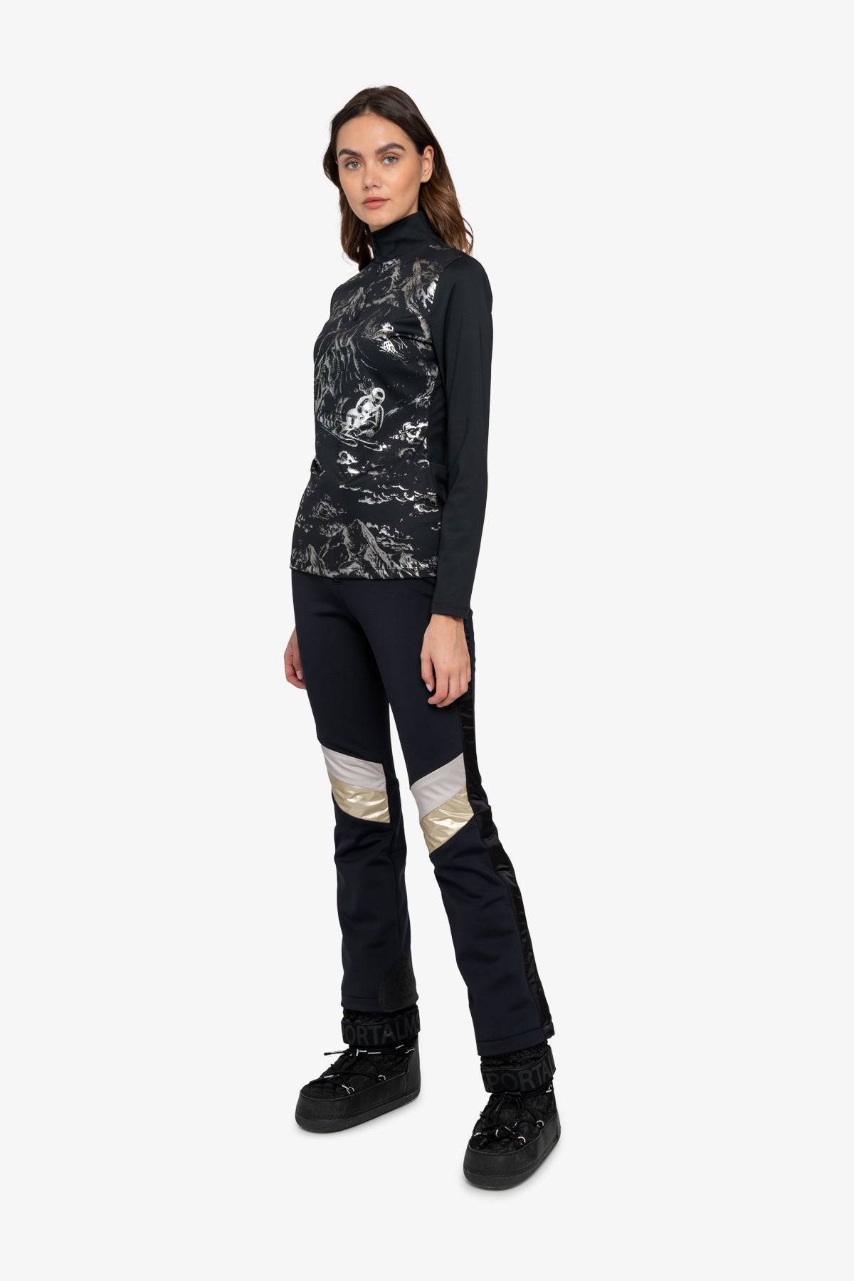 The glamorous undershirt features a fascinating front with a mountain landscape and ski motifs in a metallic foil print. Individual rhinestones are integrated into the motif to create a sparkling effect. The back is adorned with a metallic Sportalm wording print for a distinctive look.