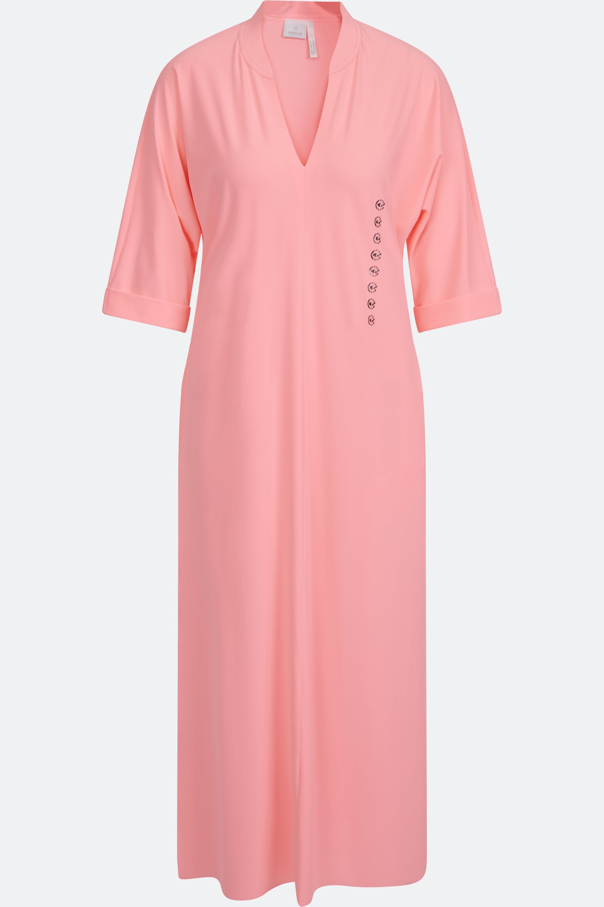 The dress is made of technical jersey with short, fitted sleeves and a V-neck with a small stand-up collar.
