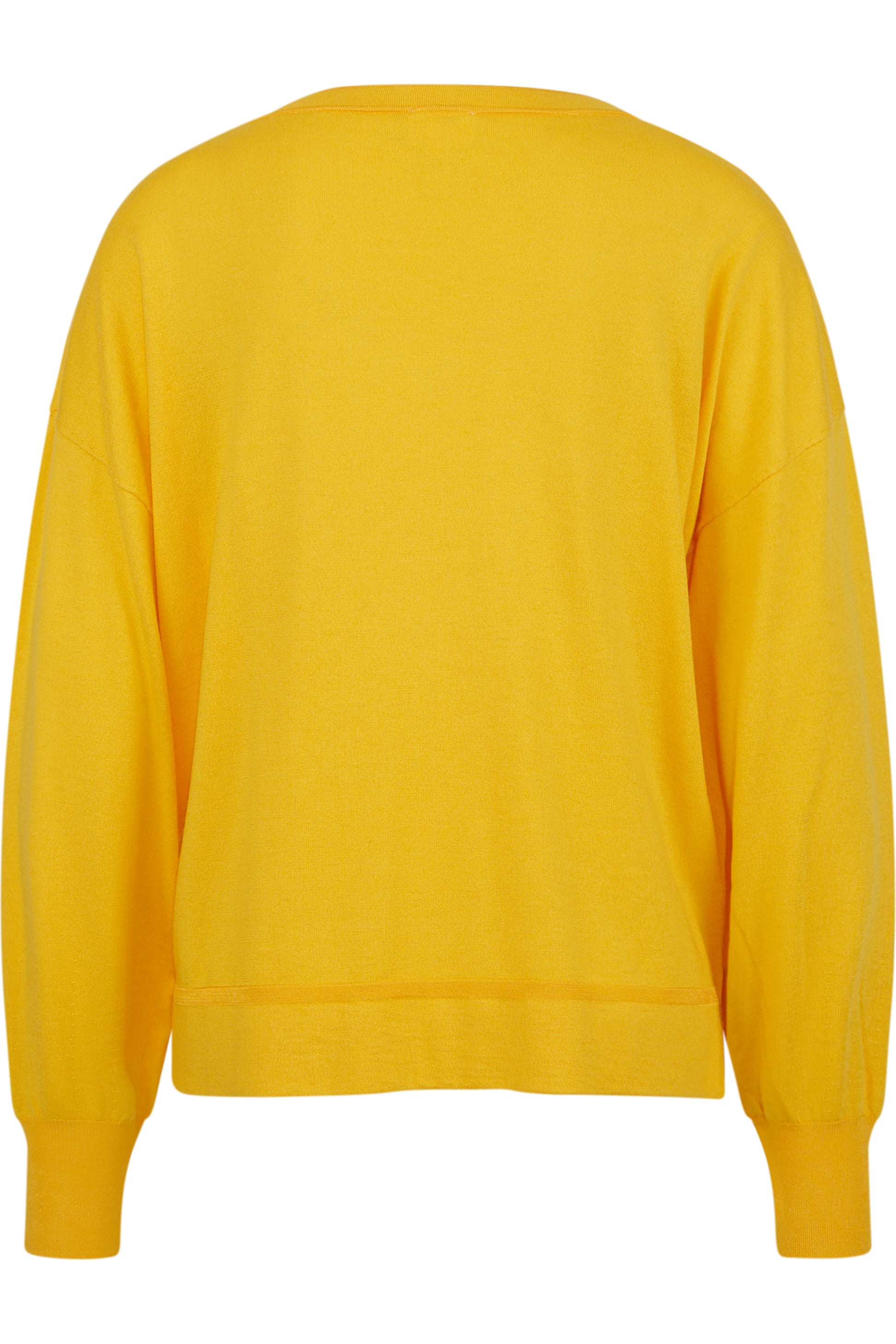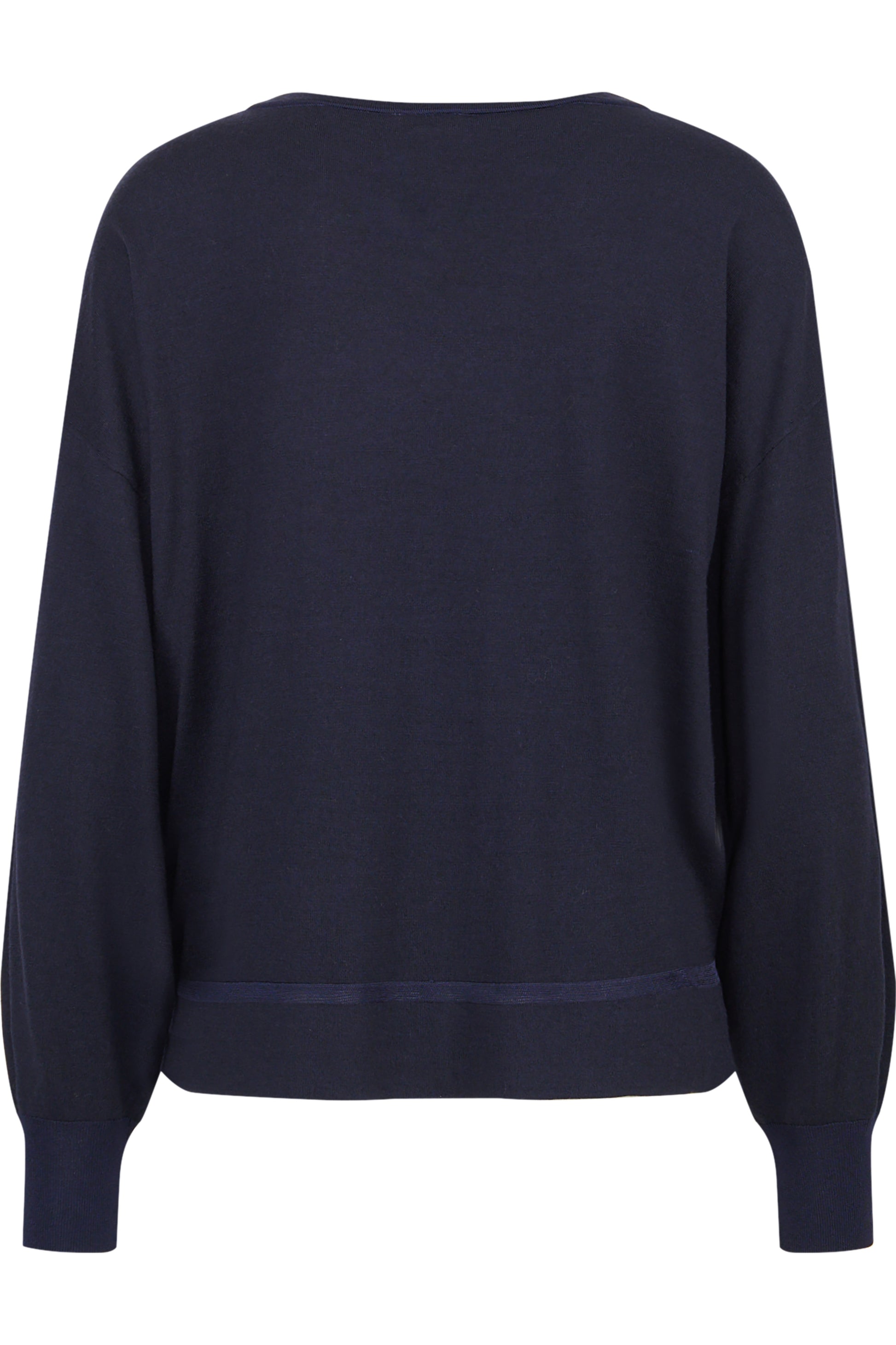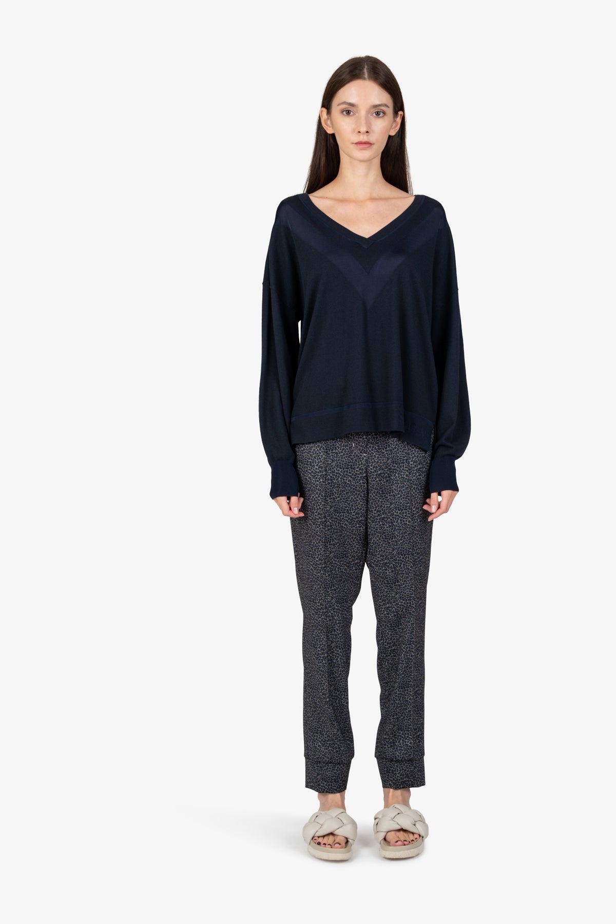 This jumper with a V-neck and shimmering intarsia knit can be easily combined with tight-fitting skirts or trousers. A stylish garment that combines elegance and versatility.
