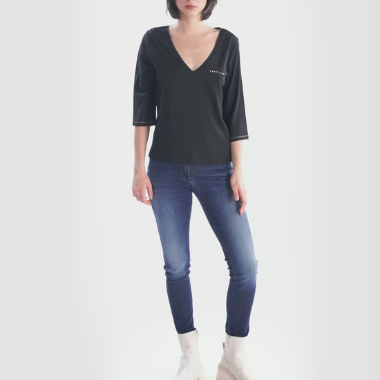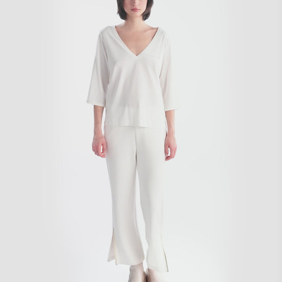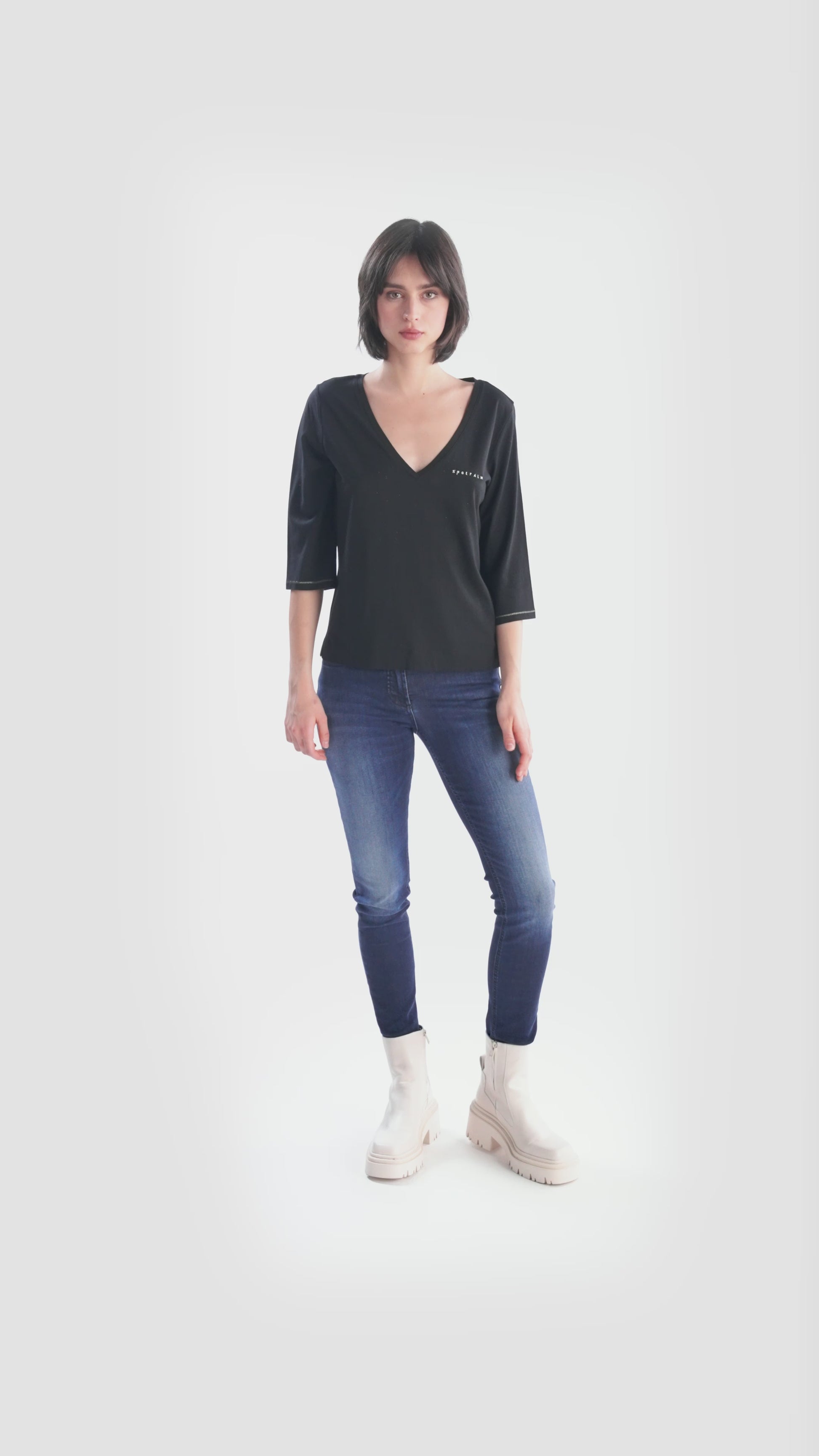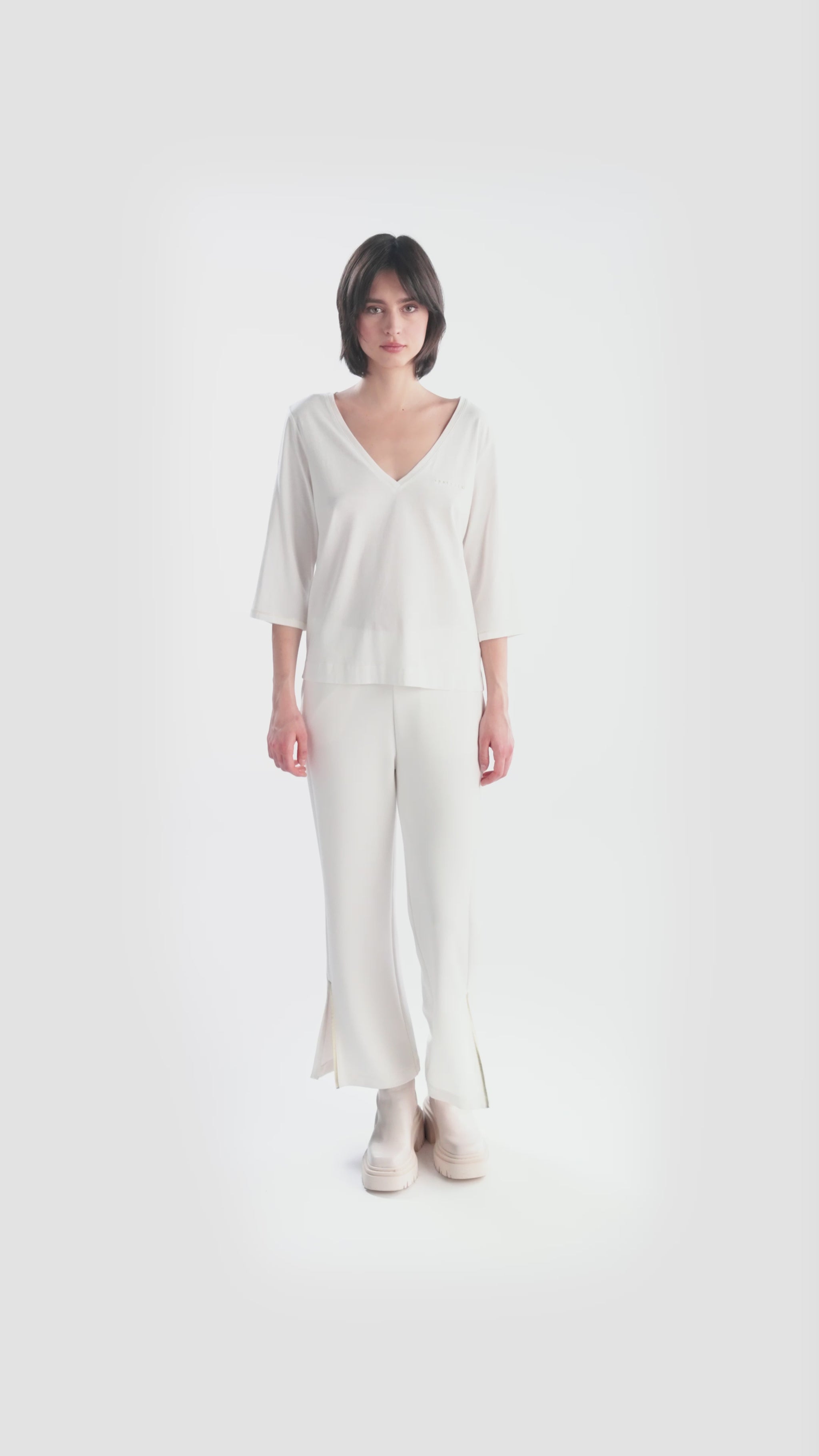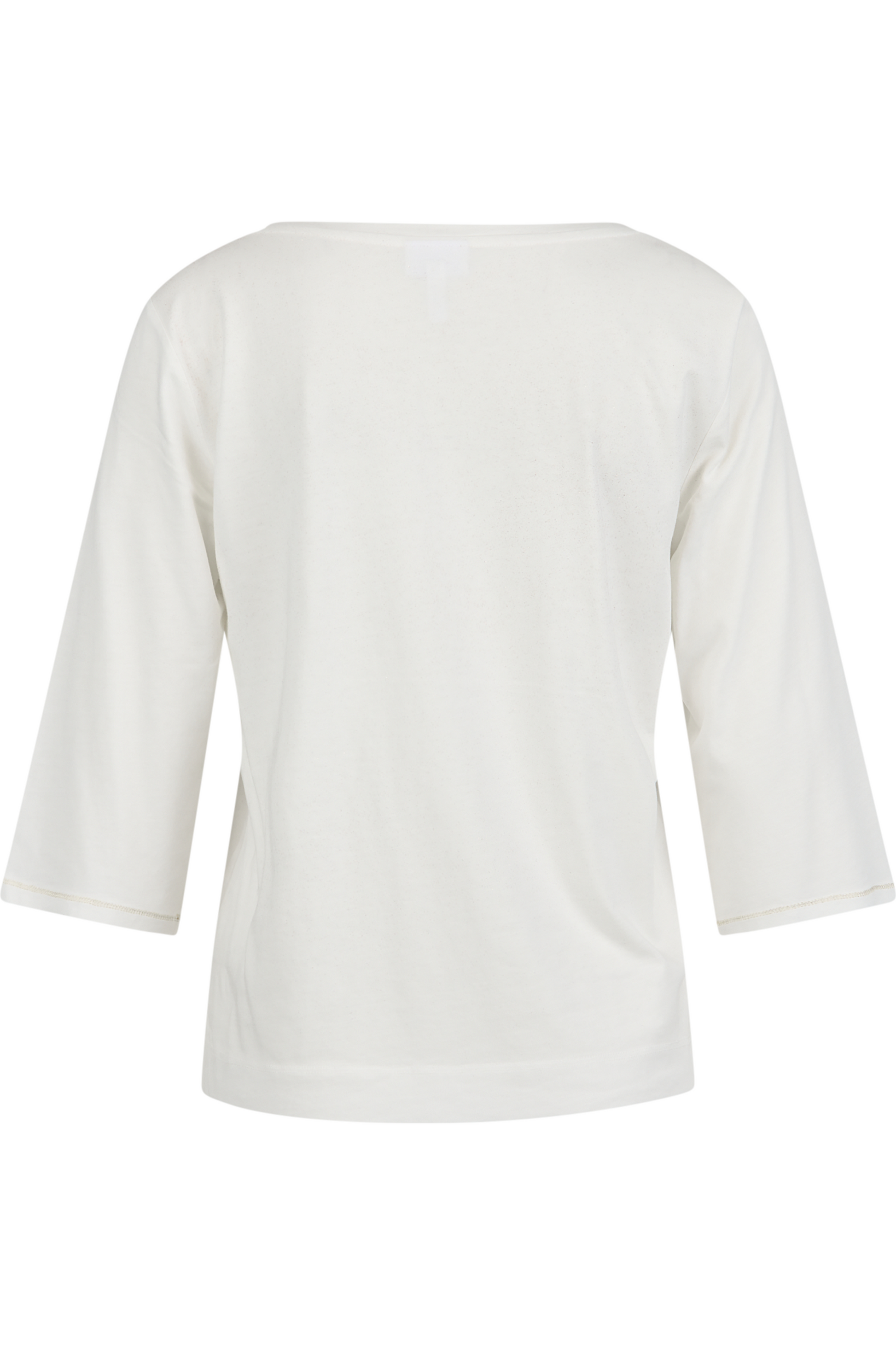 The shirt gives an elegant touch with its subtle all-over glitter in ice gold. The deep V-neck, slightly dropped shoulder with 3/4 sleeves and the straight shape create a modern silhouette. Small slits on the sides give the shirt a casual touch.