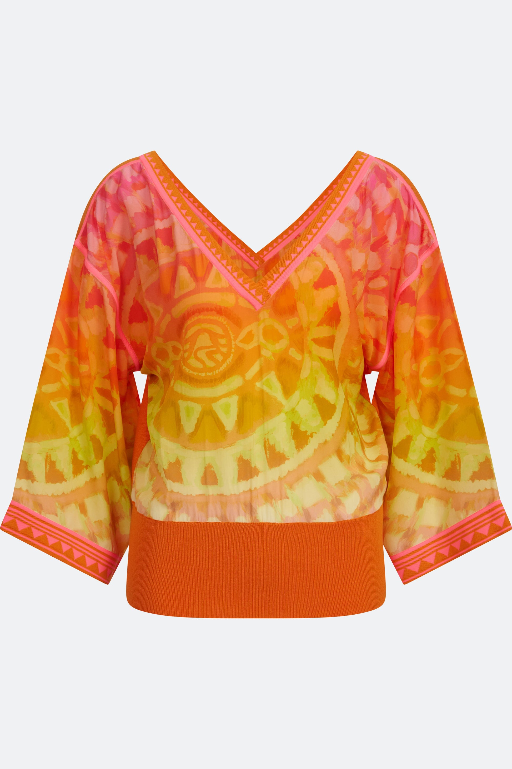 This sweater blends fine cotton-silk with a printed viscose front panel.