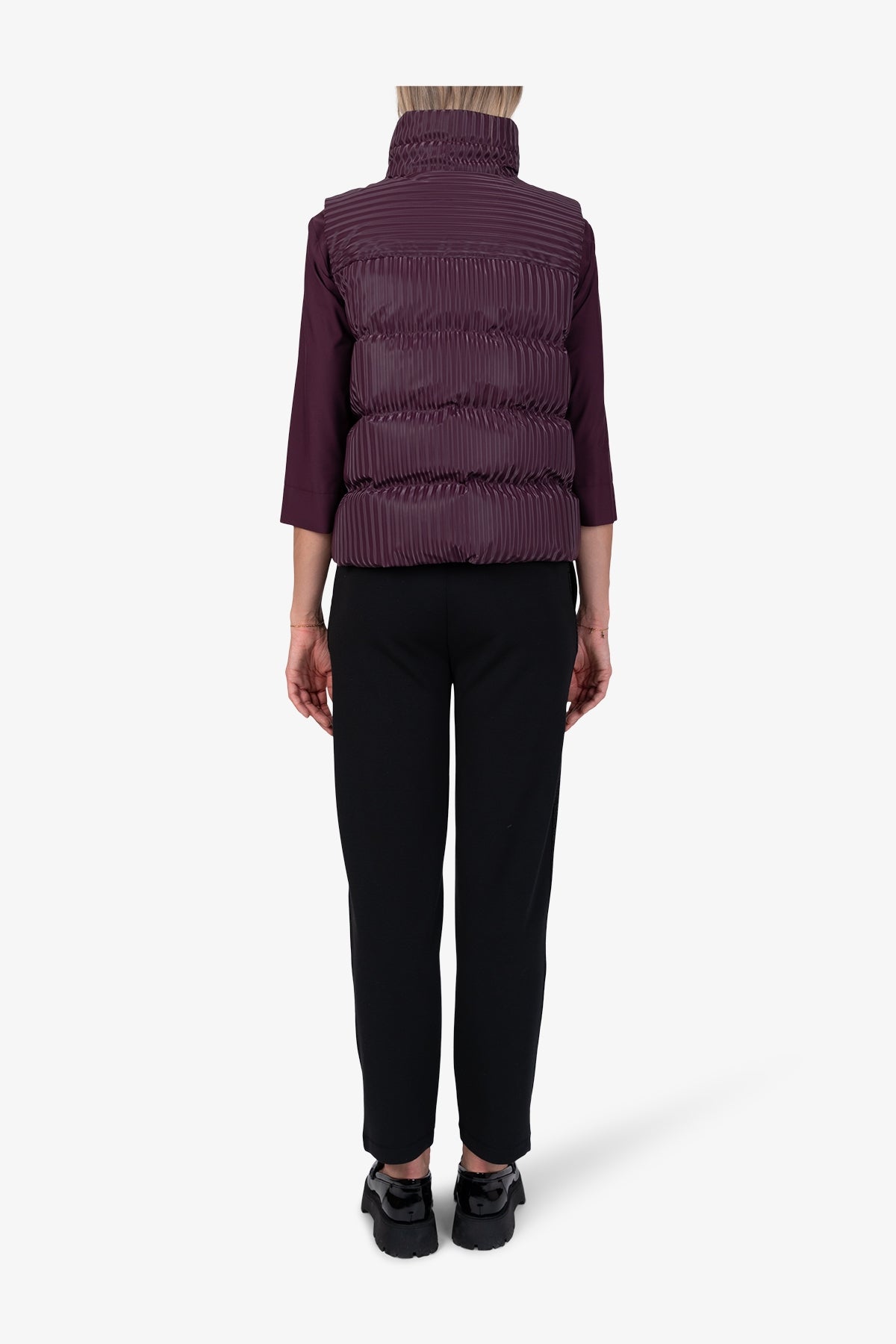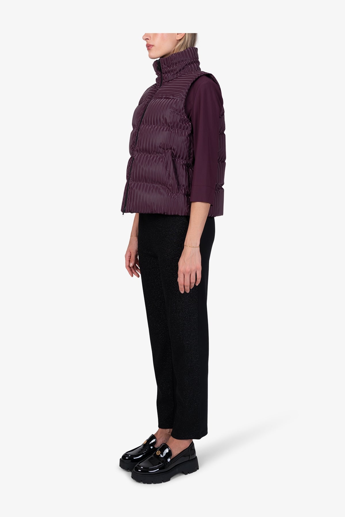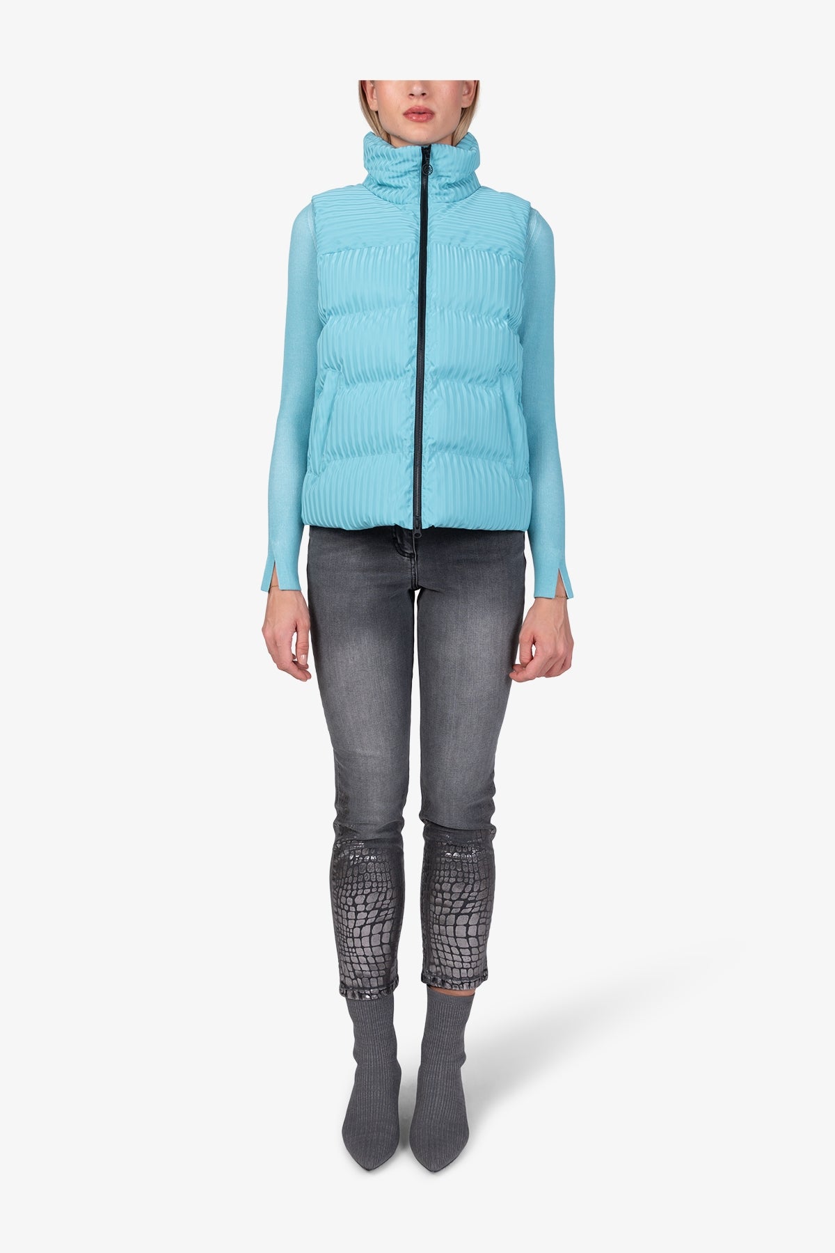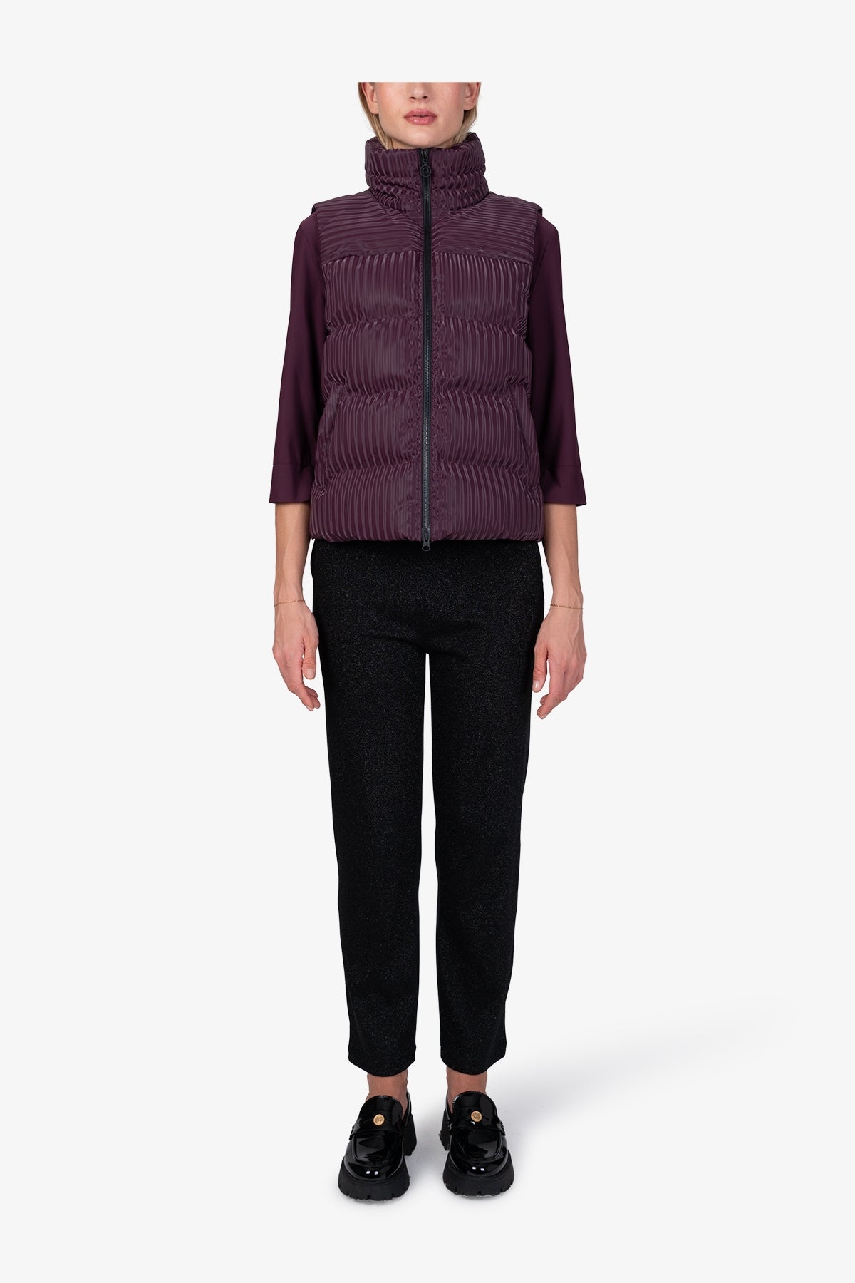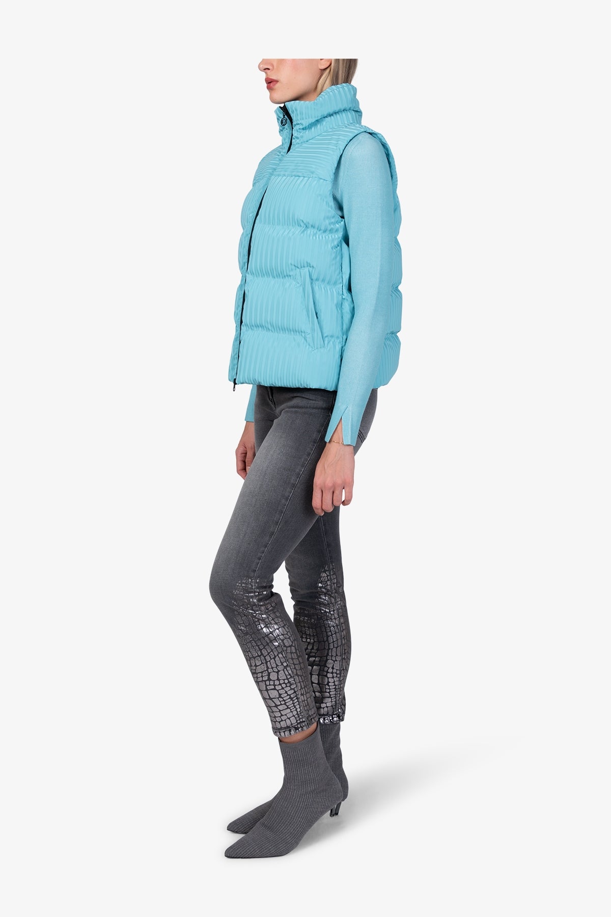 The gilet with recycled down filling and stand-up collar not only offers warmth, but also a feminine silhouette. It combines sustainability with style and is ideal for fashionable outdoor looks.