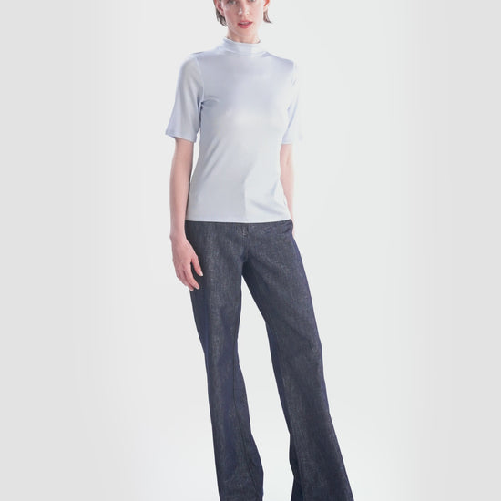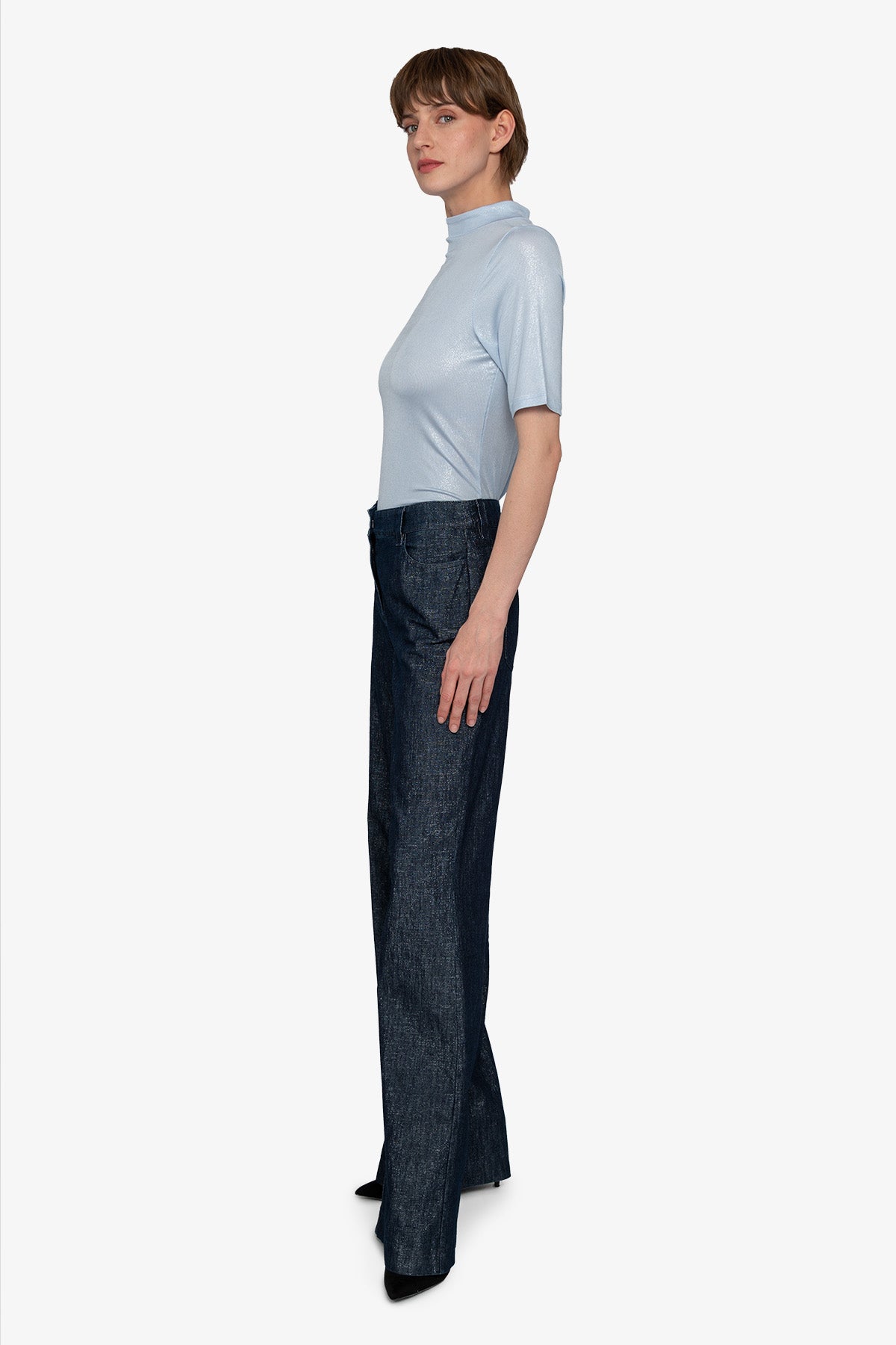 A highlight is the light indigo-dyed denim material with silver lurex yarn, which gives them an elegant touch.