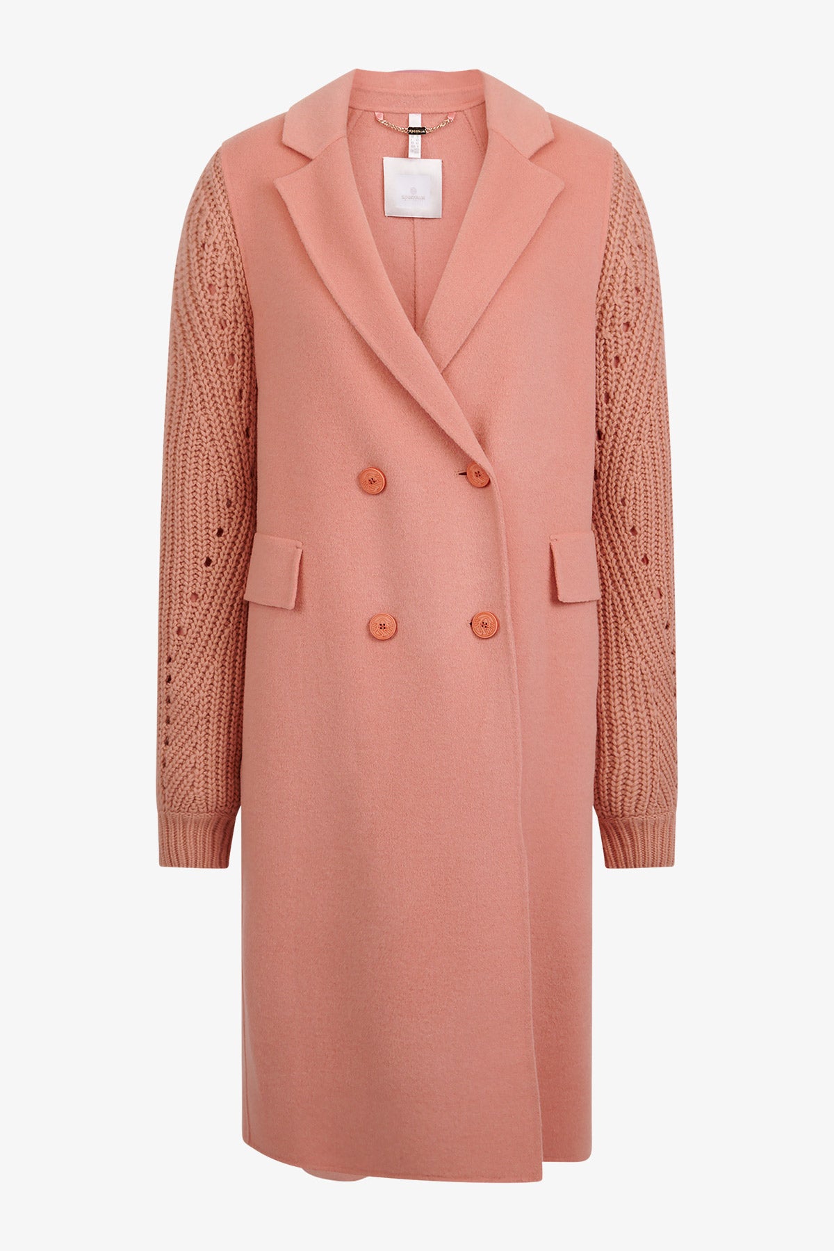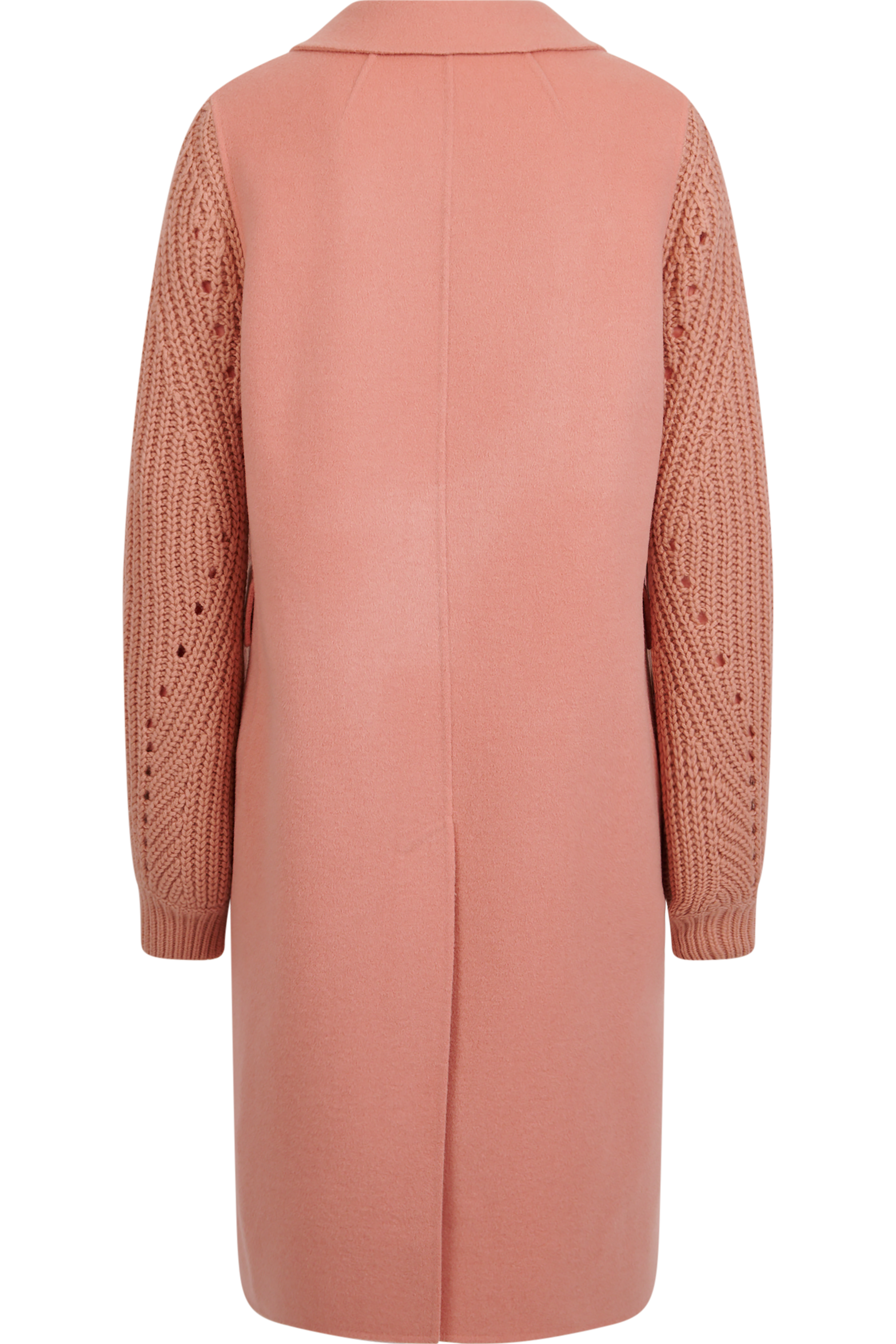 The elegant wool coat with a 2-breasted design and knitted sleeves give the model a modern silhouette. The slit in the middle back ensures an elegant look.
