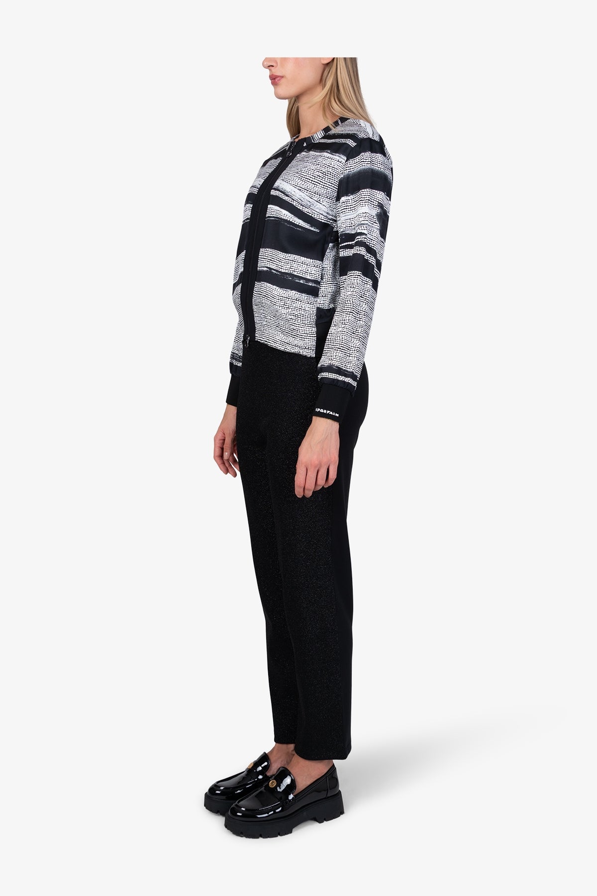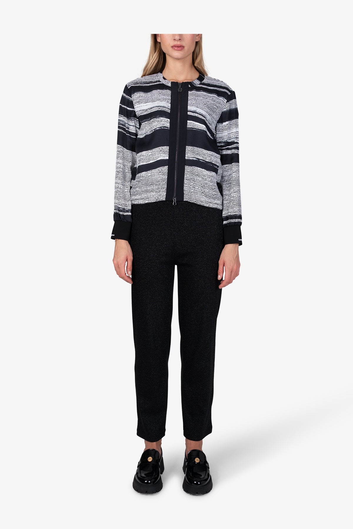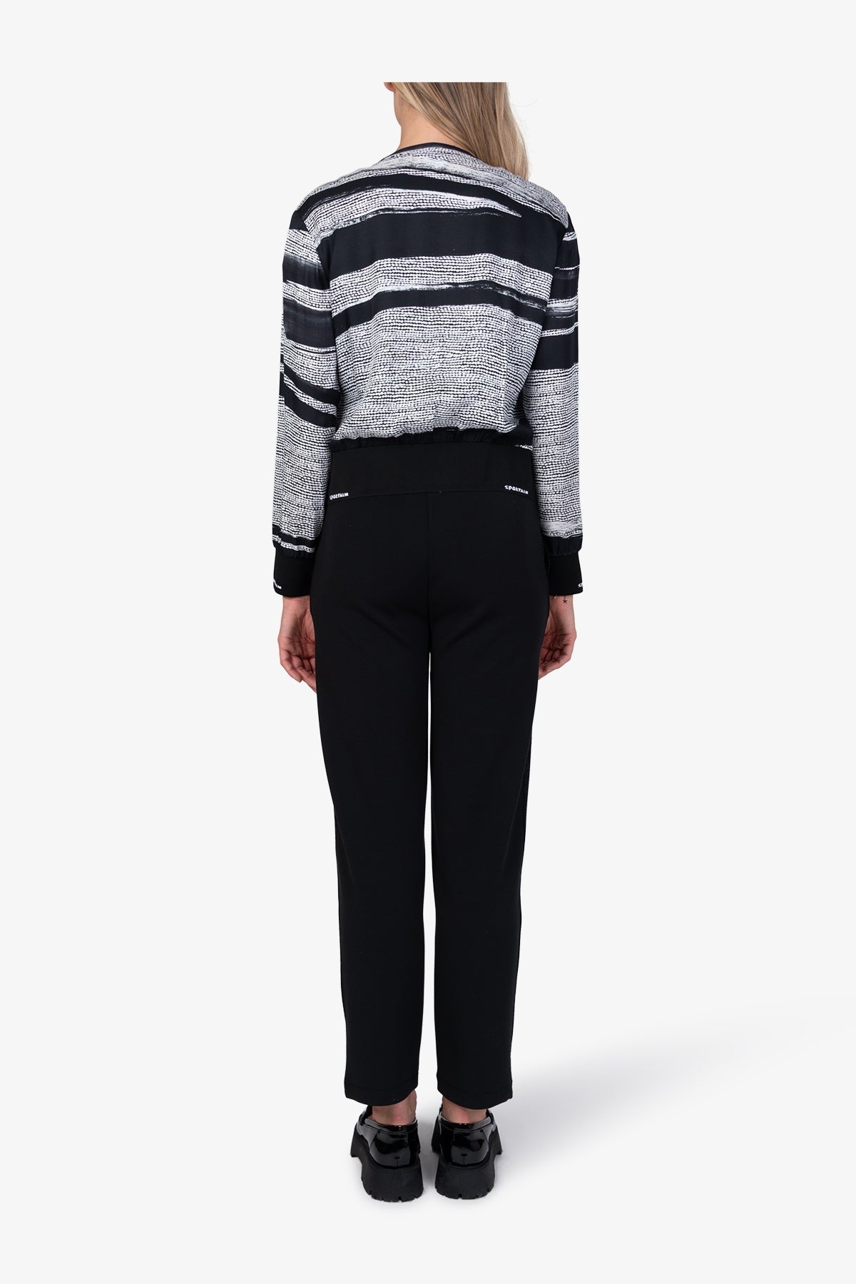 亮点:圆领,针织饰边,下摆带有松紧绳,可改变前部下摆宽度,后摆带有针织袖口36 码后长:54.9 厘米