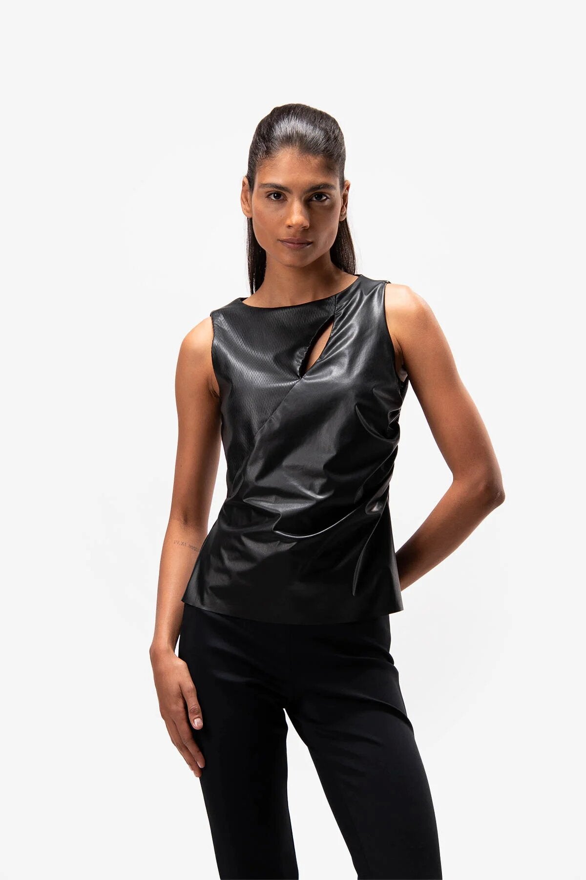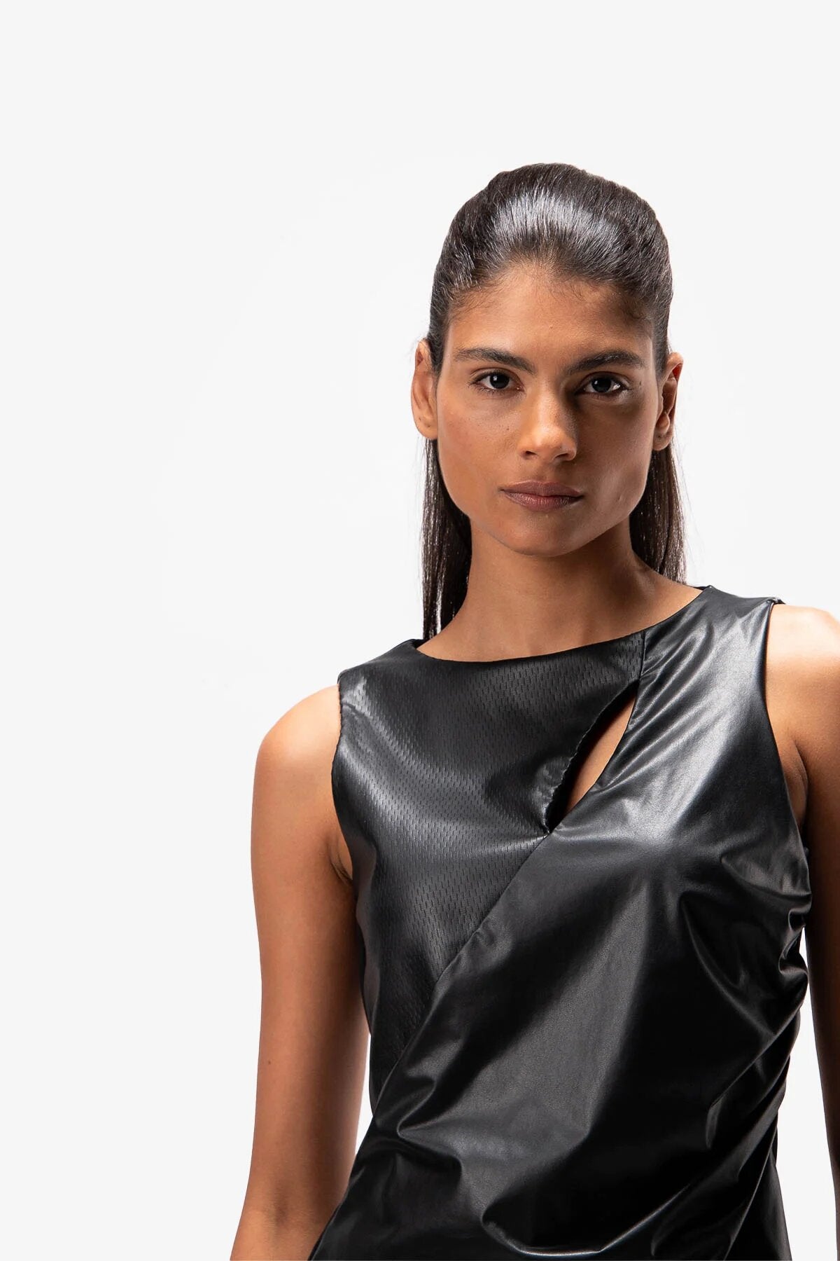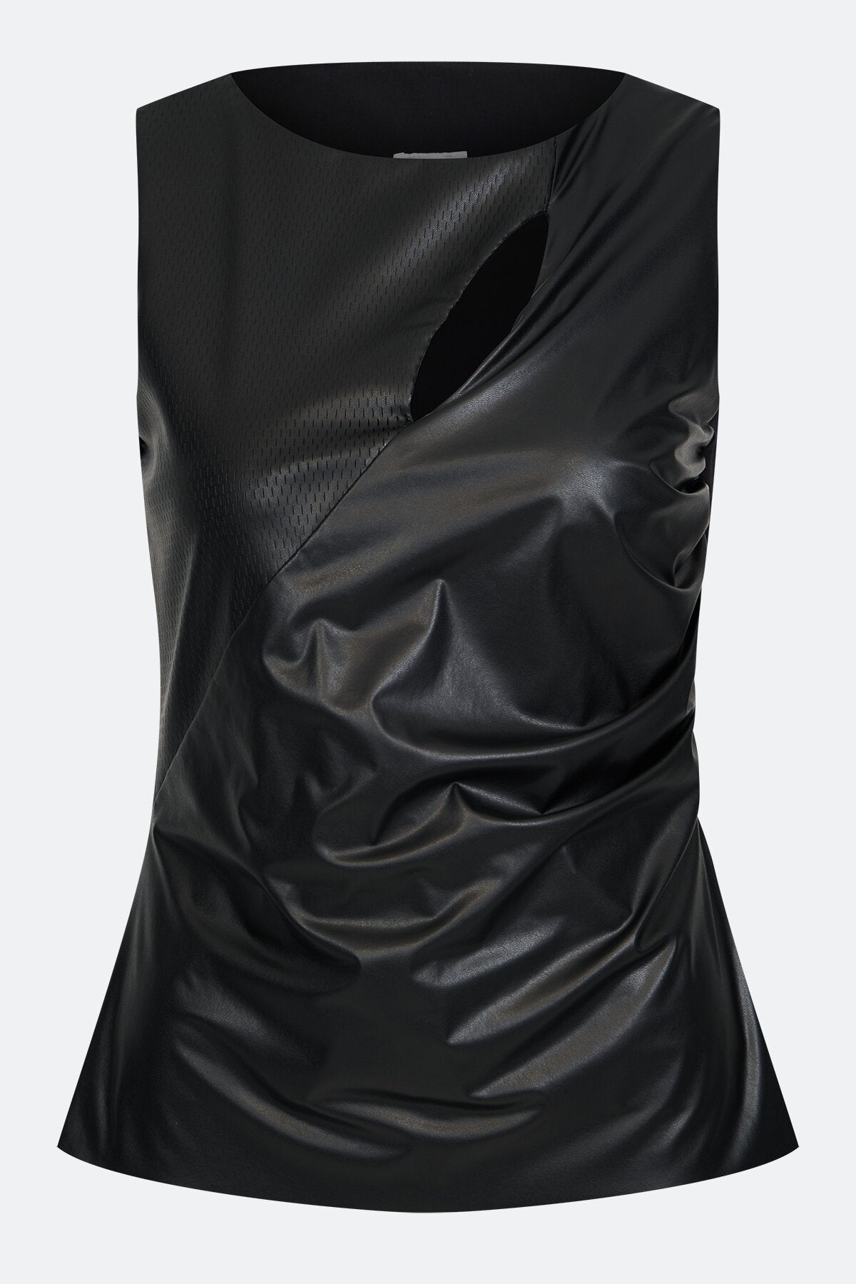 这款无袖上衣将垂坠的仿皮革前面与柔软的潜水布后背结合在一起。
