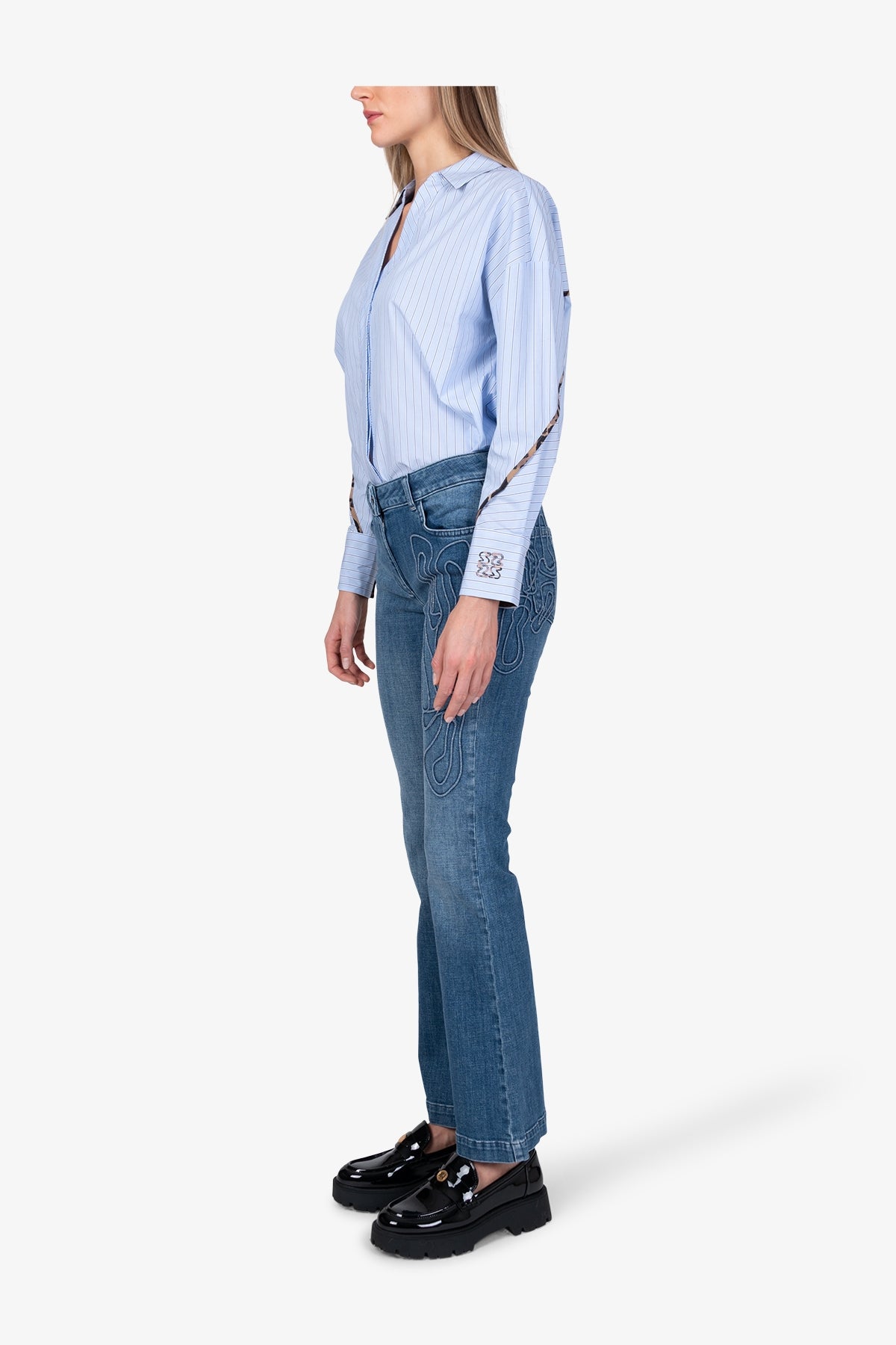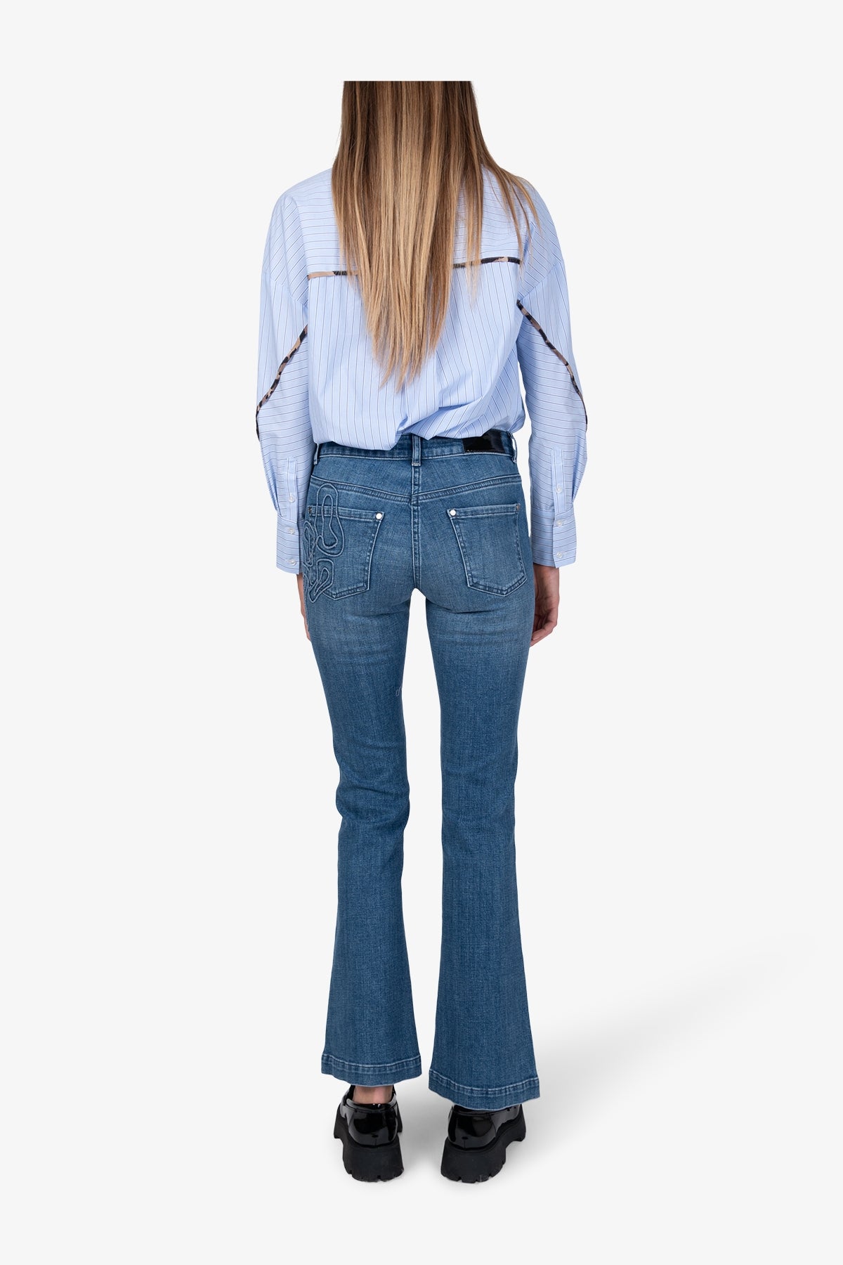 这款时尚的喇叭裤牛仔裤,饰有醒目的3D立体狮子图案贴花,令人眼前一亮。这一细节赋予牛仔裤独特的现代感,又不失一丝狂野气息。