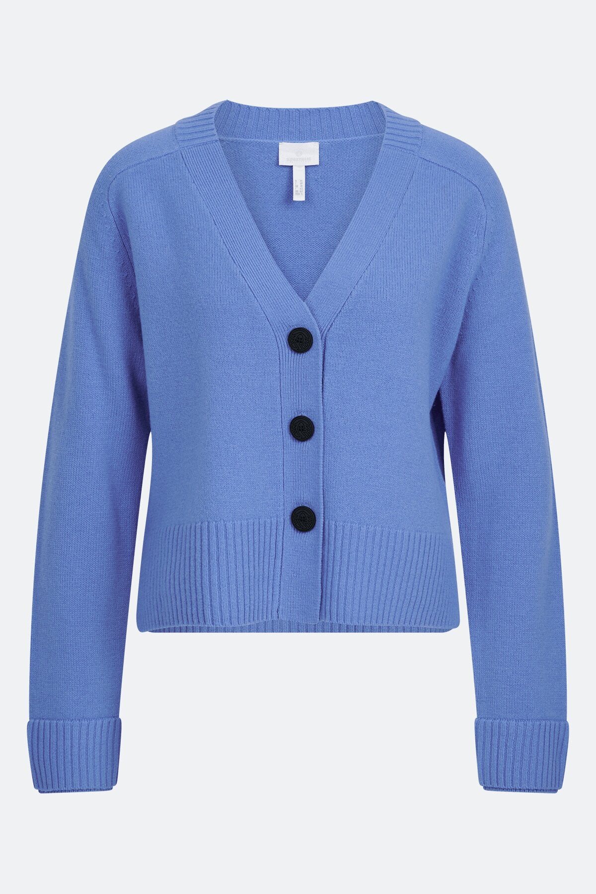 它具有V领,双层针织袖口和前扣闭合。