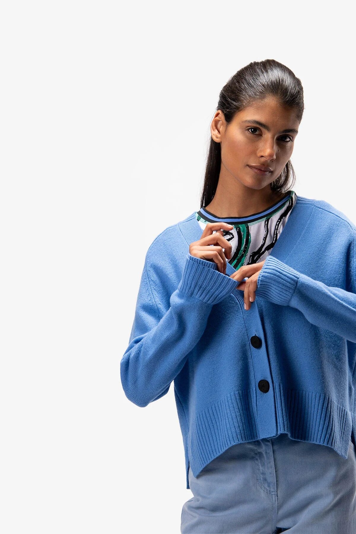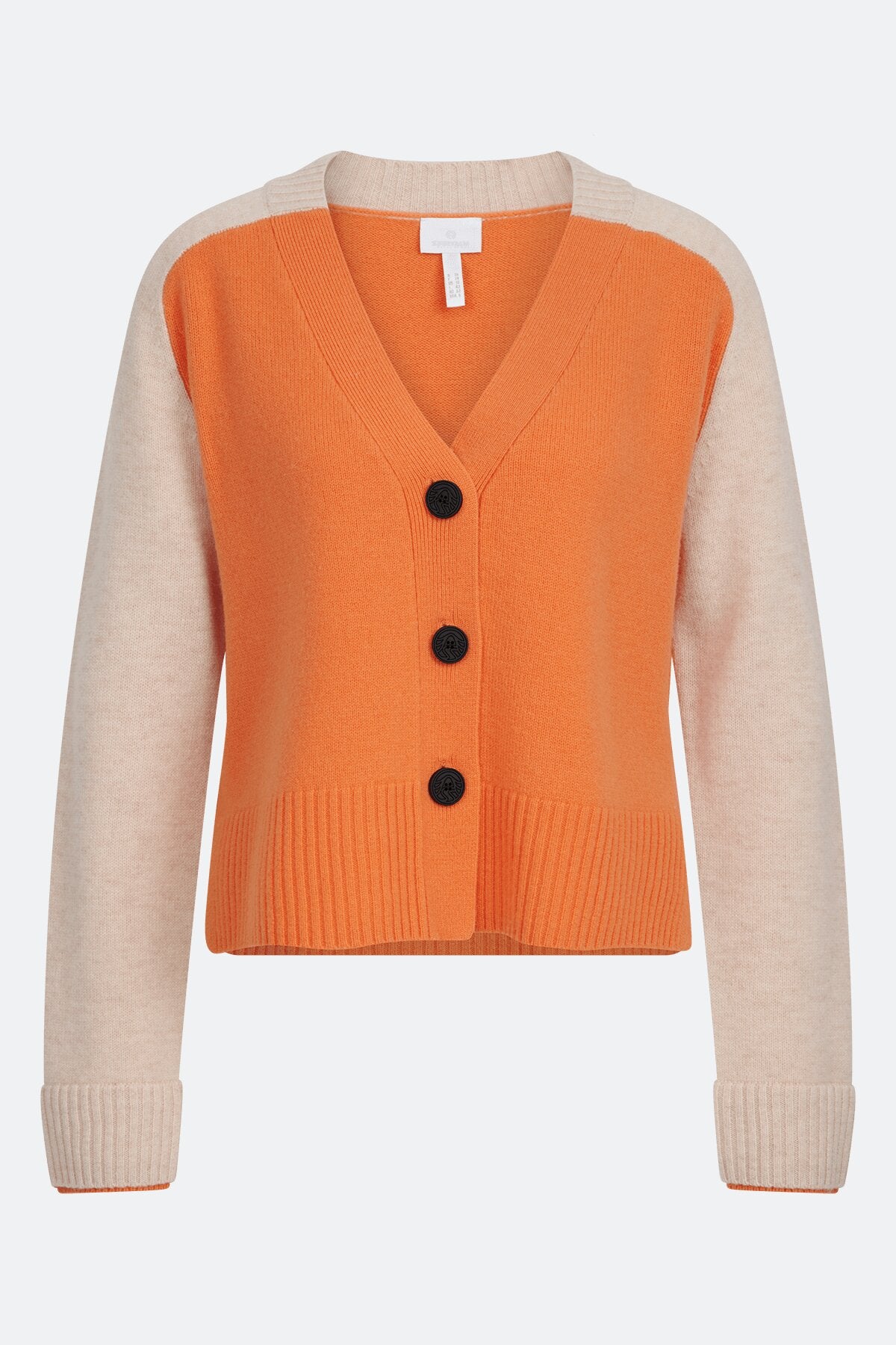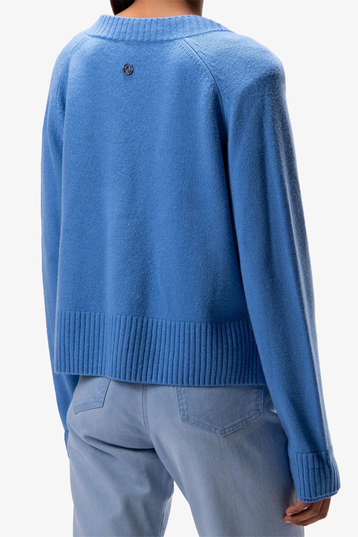 这件开襟羊毛混纺羊绒针织衫,采用柔软的羊毛混纺羊绒纤维制成,配有肩膀斜线袖。