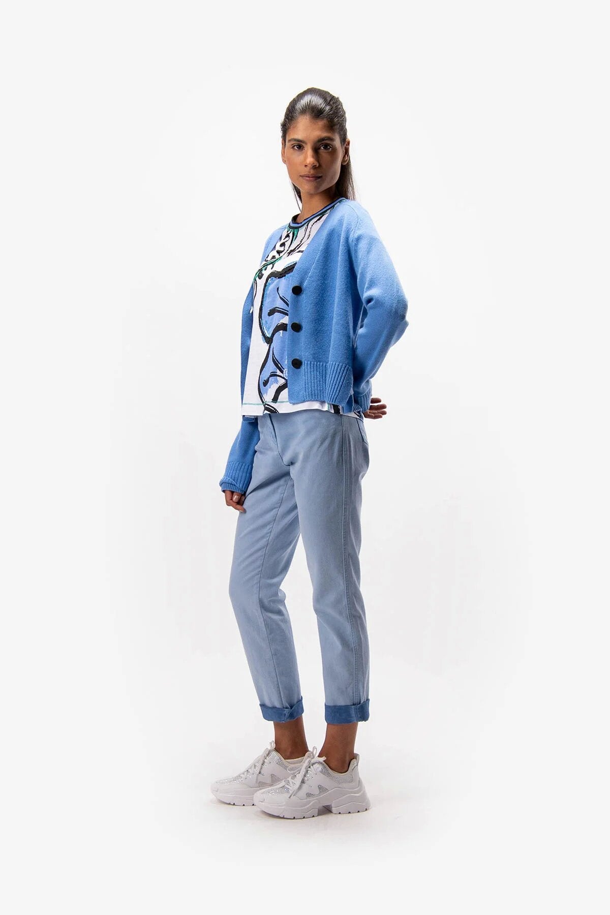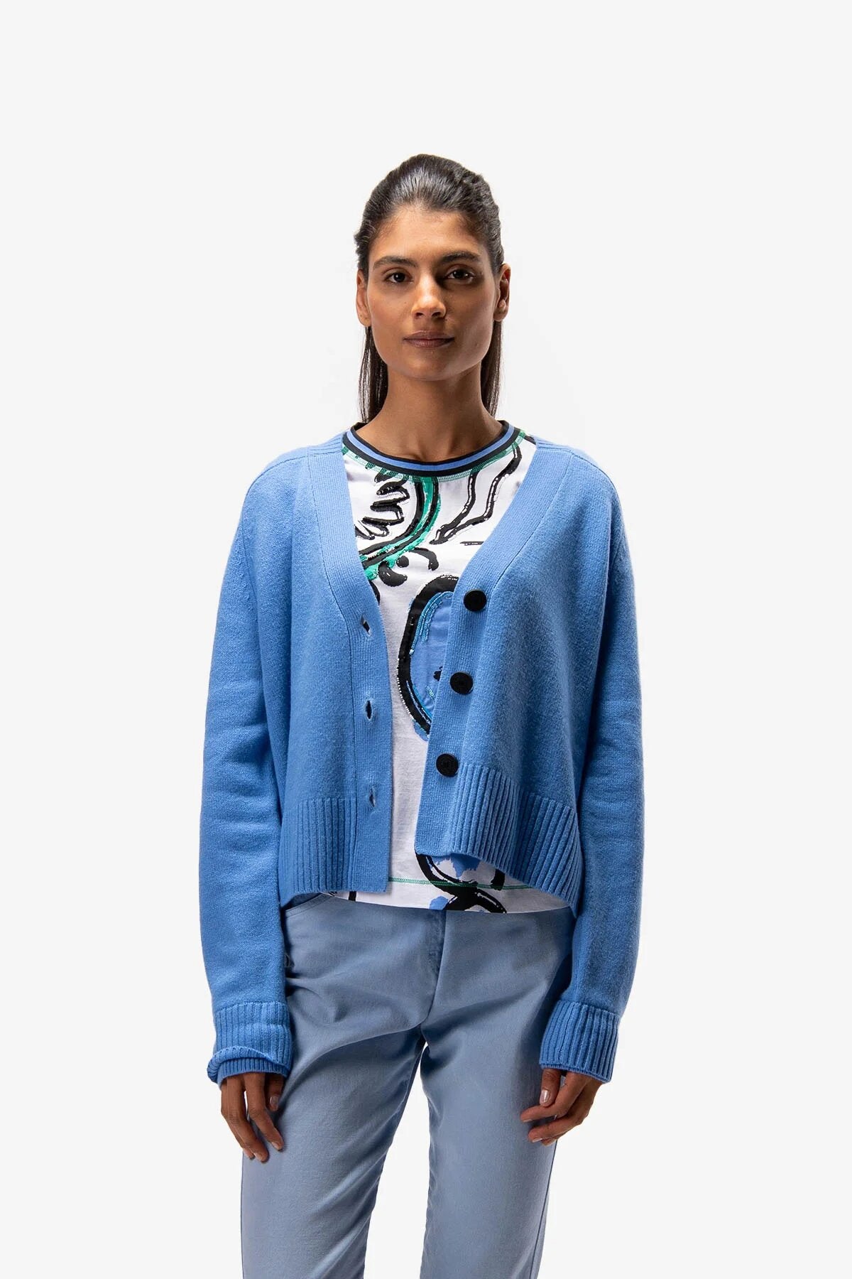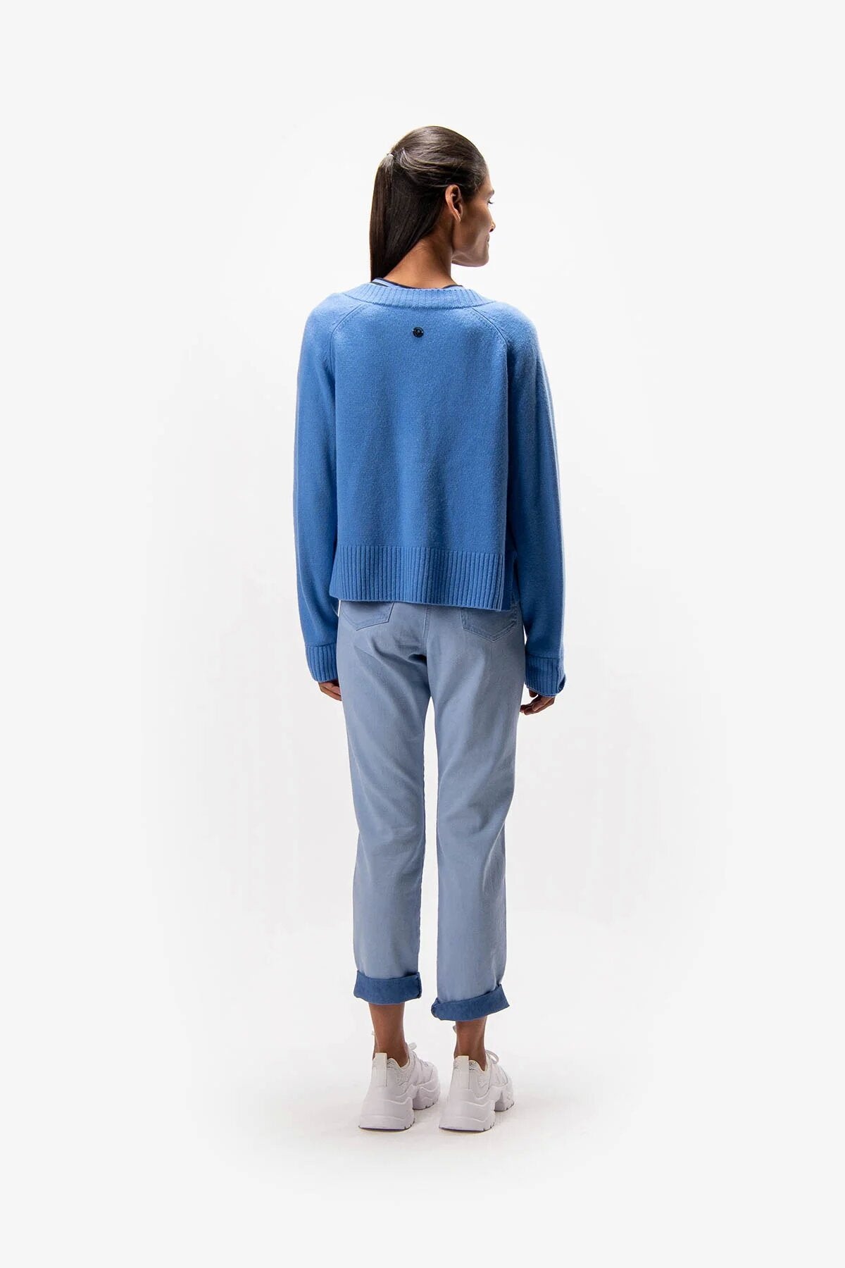 这件开襟羊毛混纺羊绒针织衫,采用柔软的羊毛混纺羊绒纤维制成,配有肩膀斜线袖。