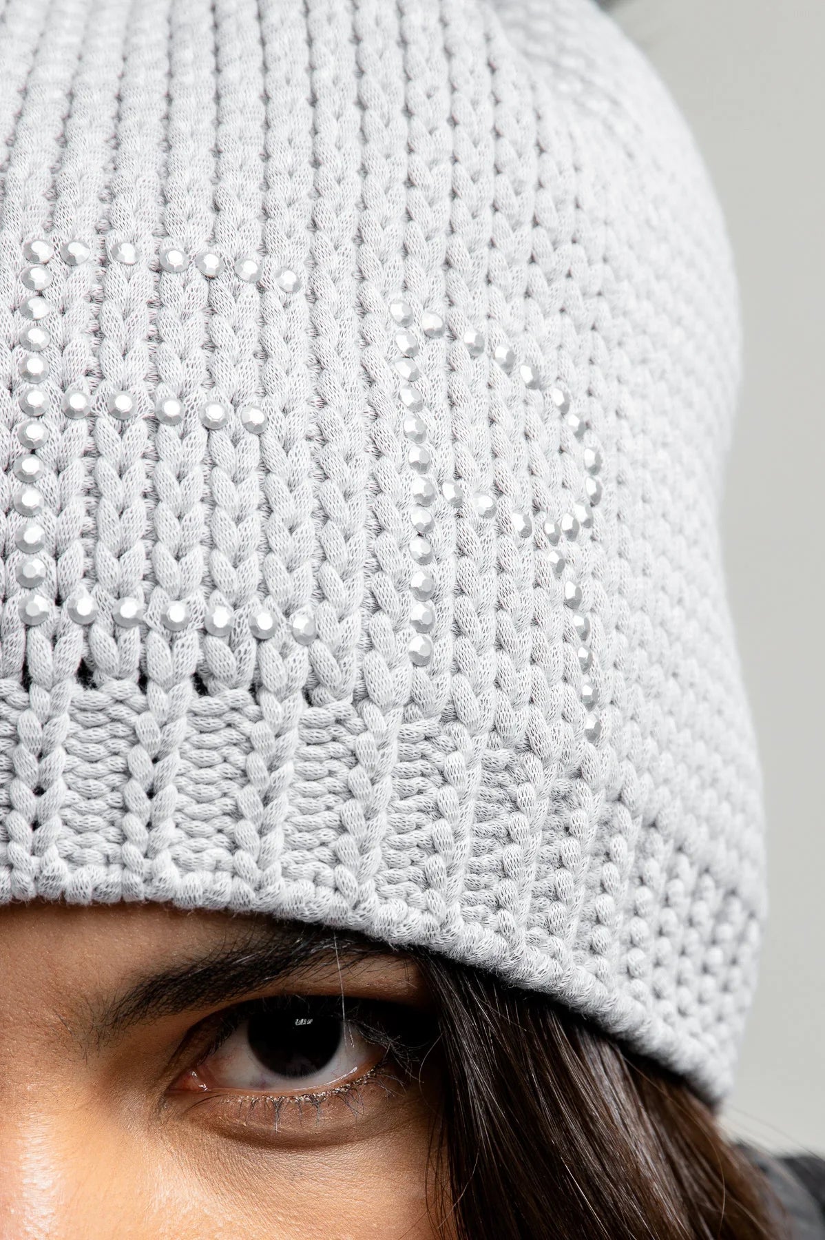 这款粗针织帽的亮点是水钻字母,增添了迷人的气息。