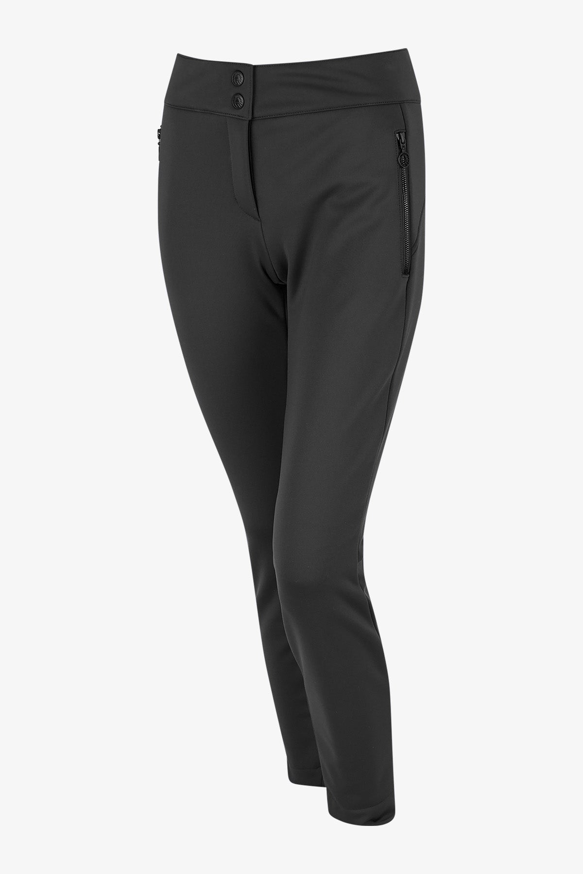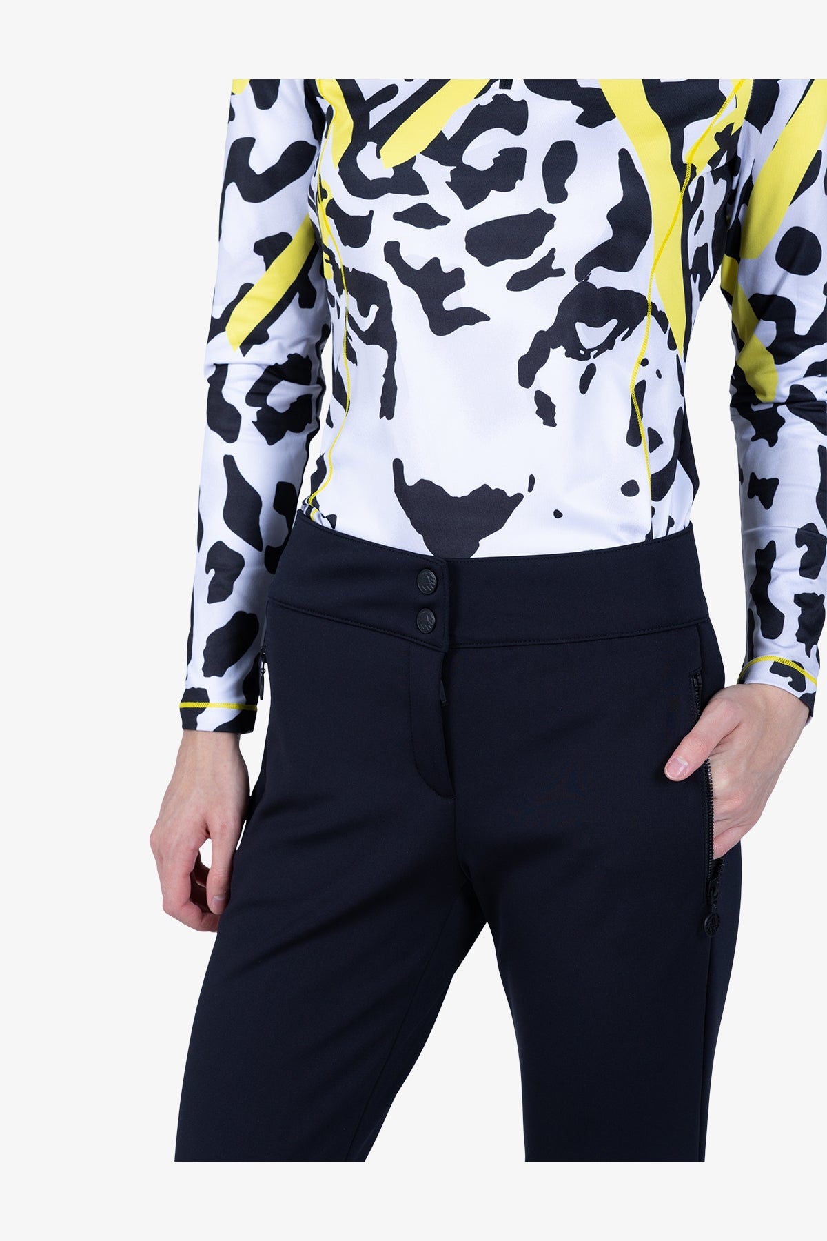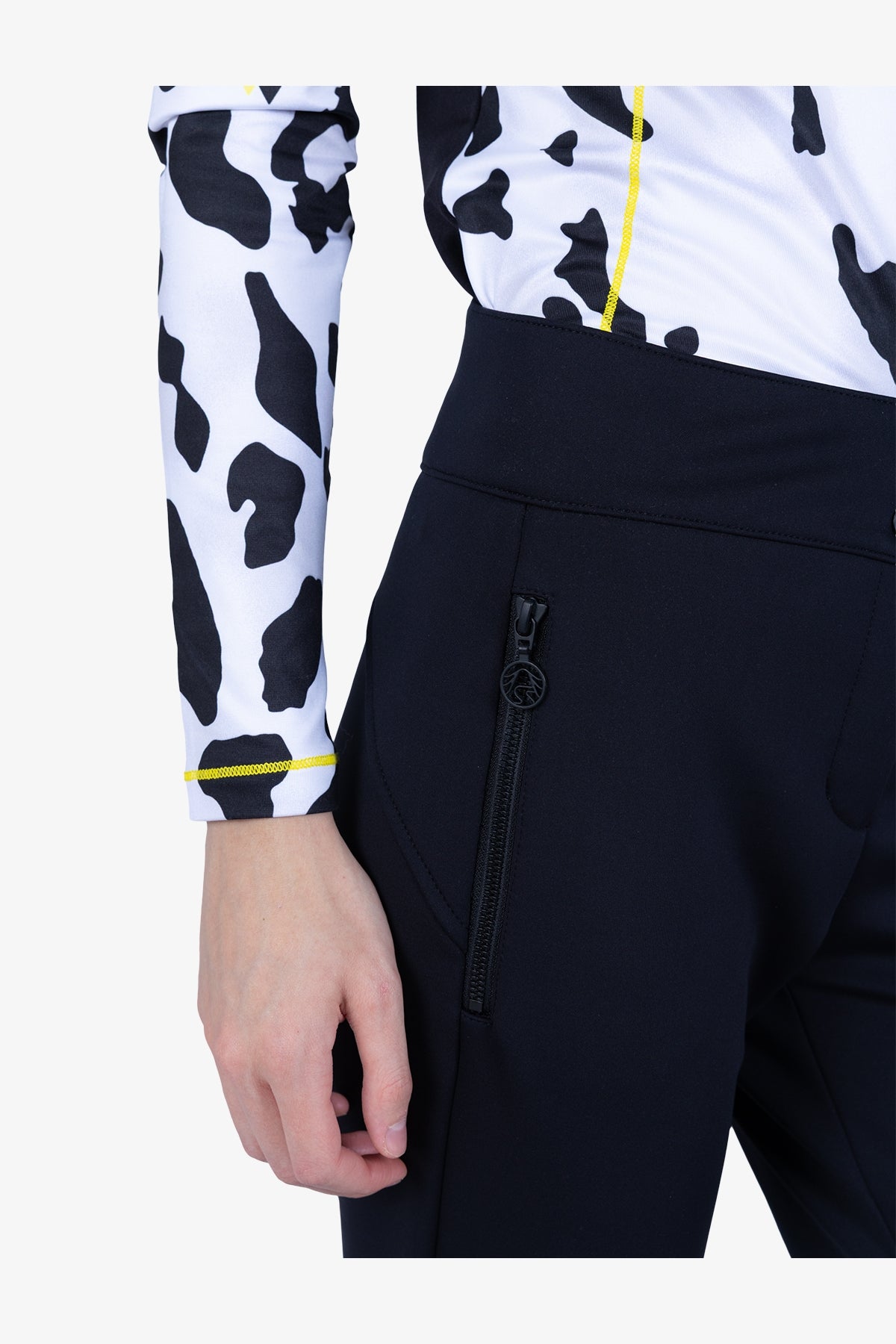 腰带:前中部采用隐形拉链、按扣和腰带钩,后部为高腰设计。裤型:修身裤型,裤脚处有松紧带。内缝长(36 码):74.0 厘米