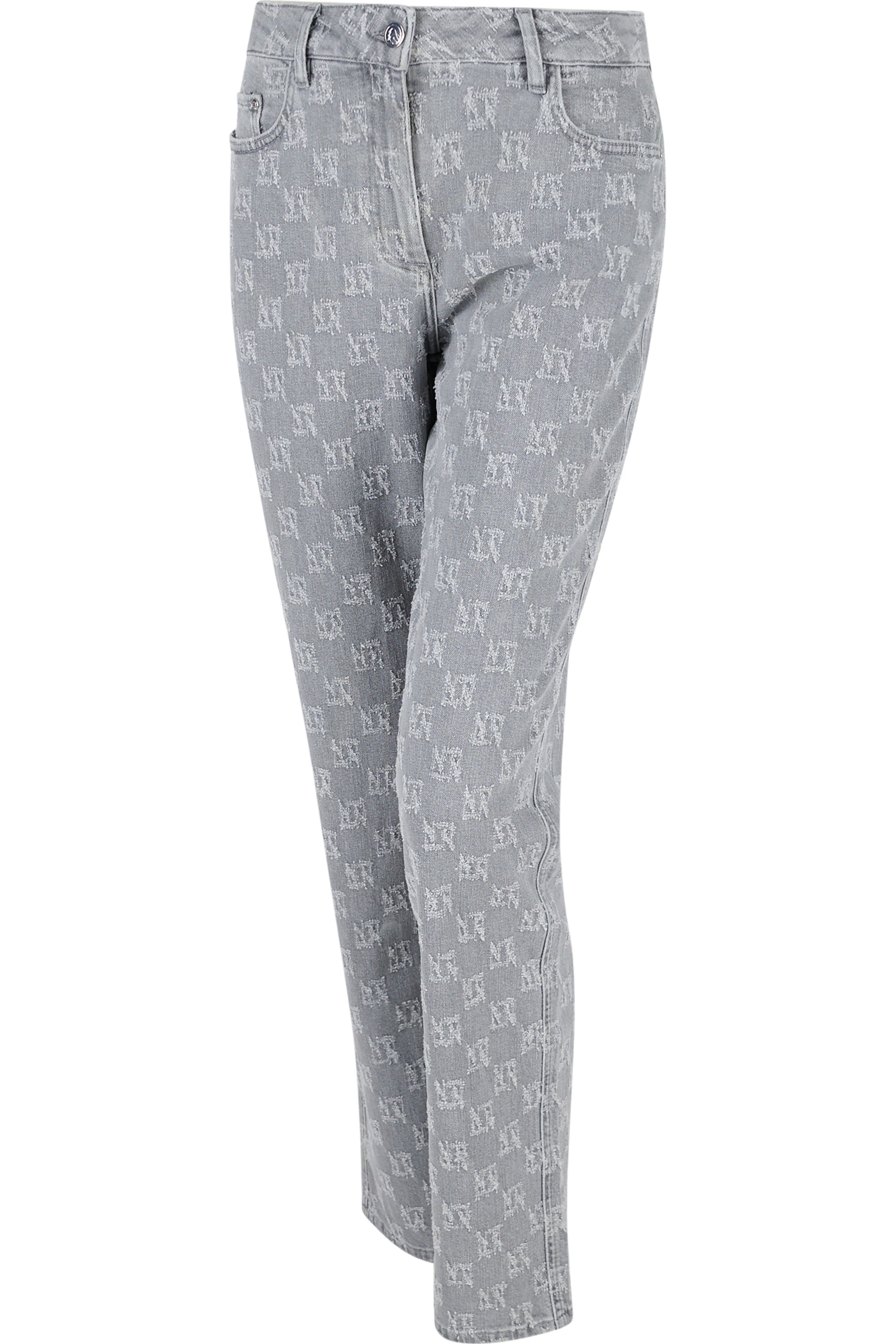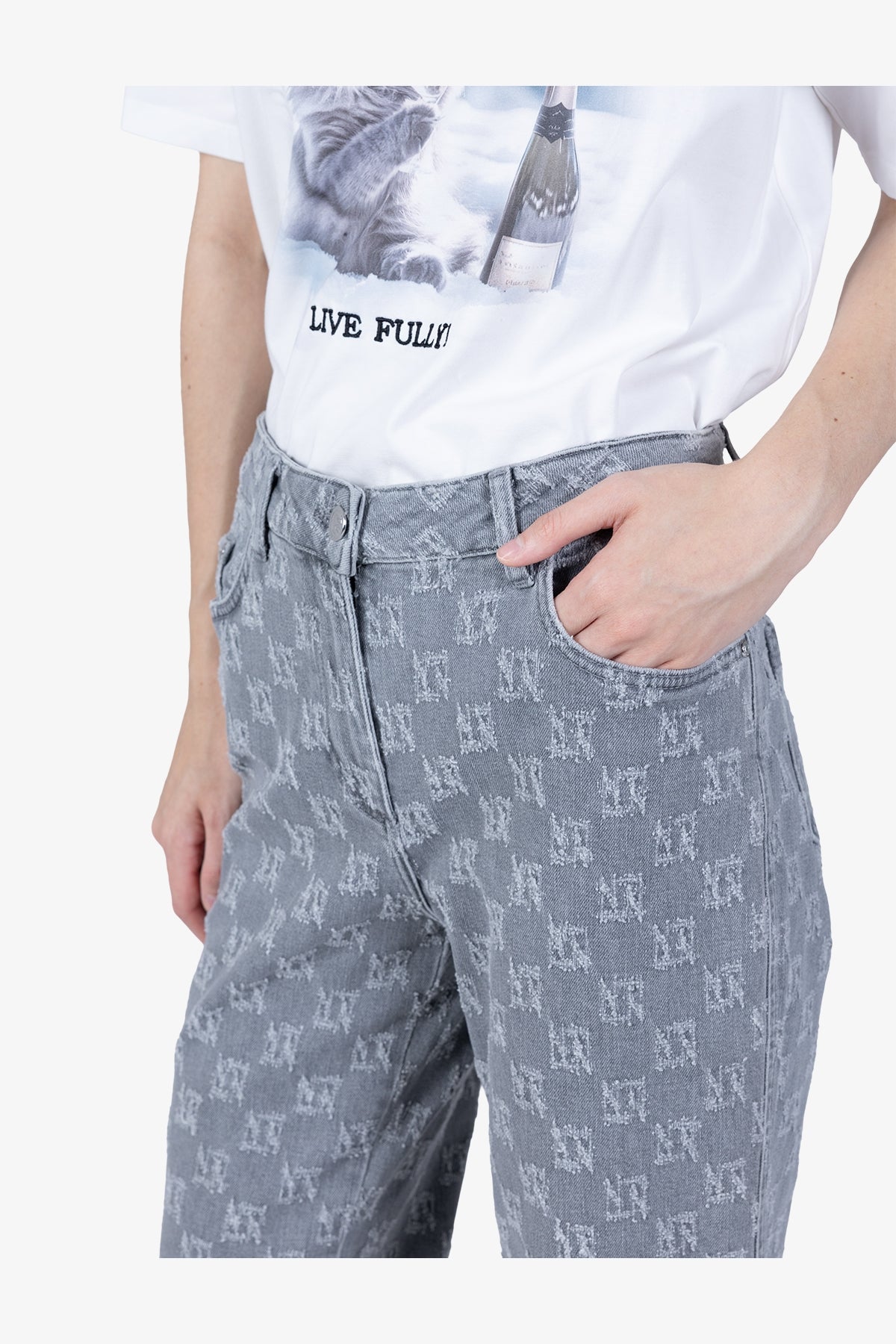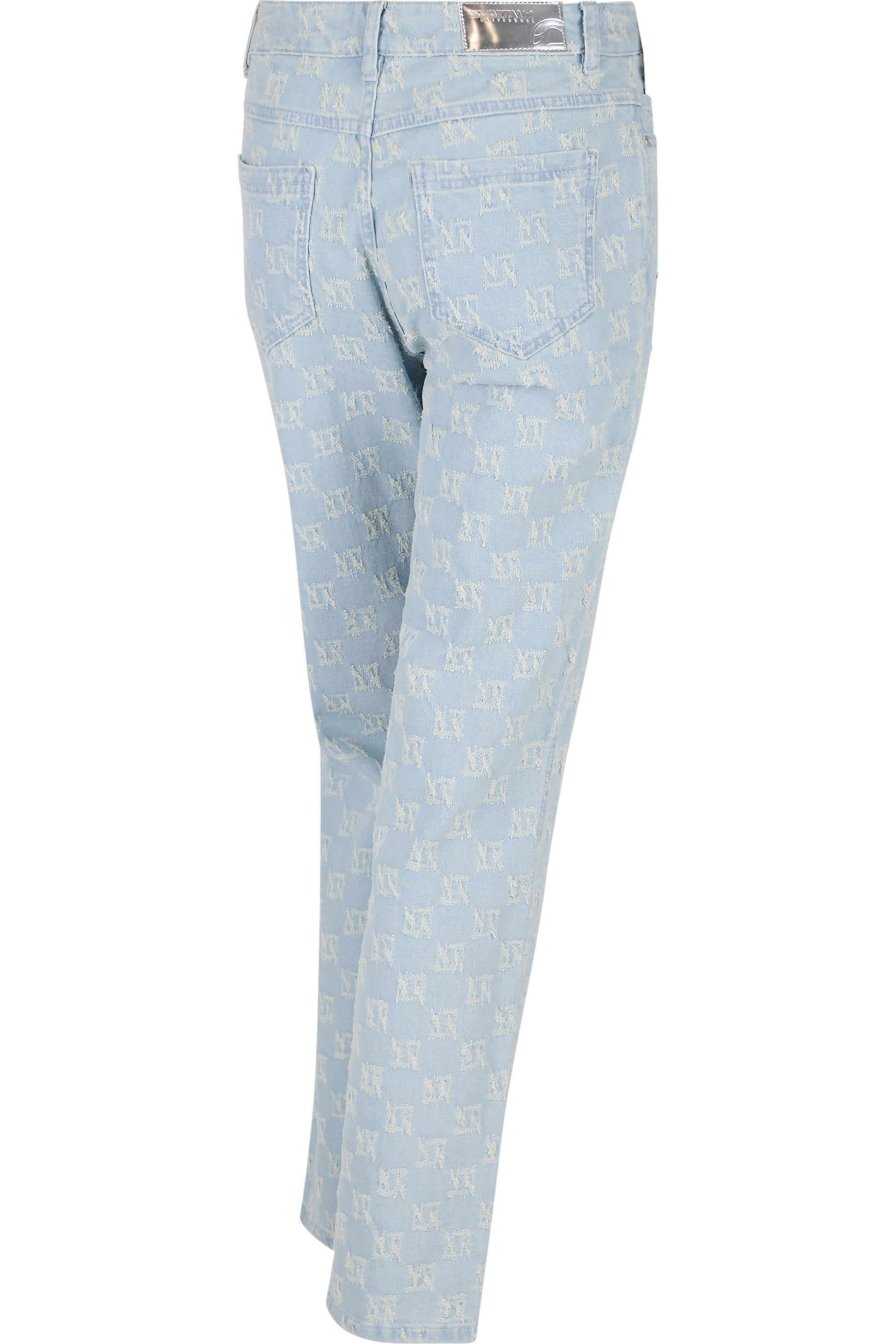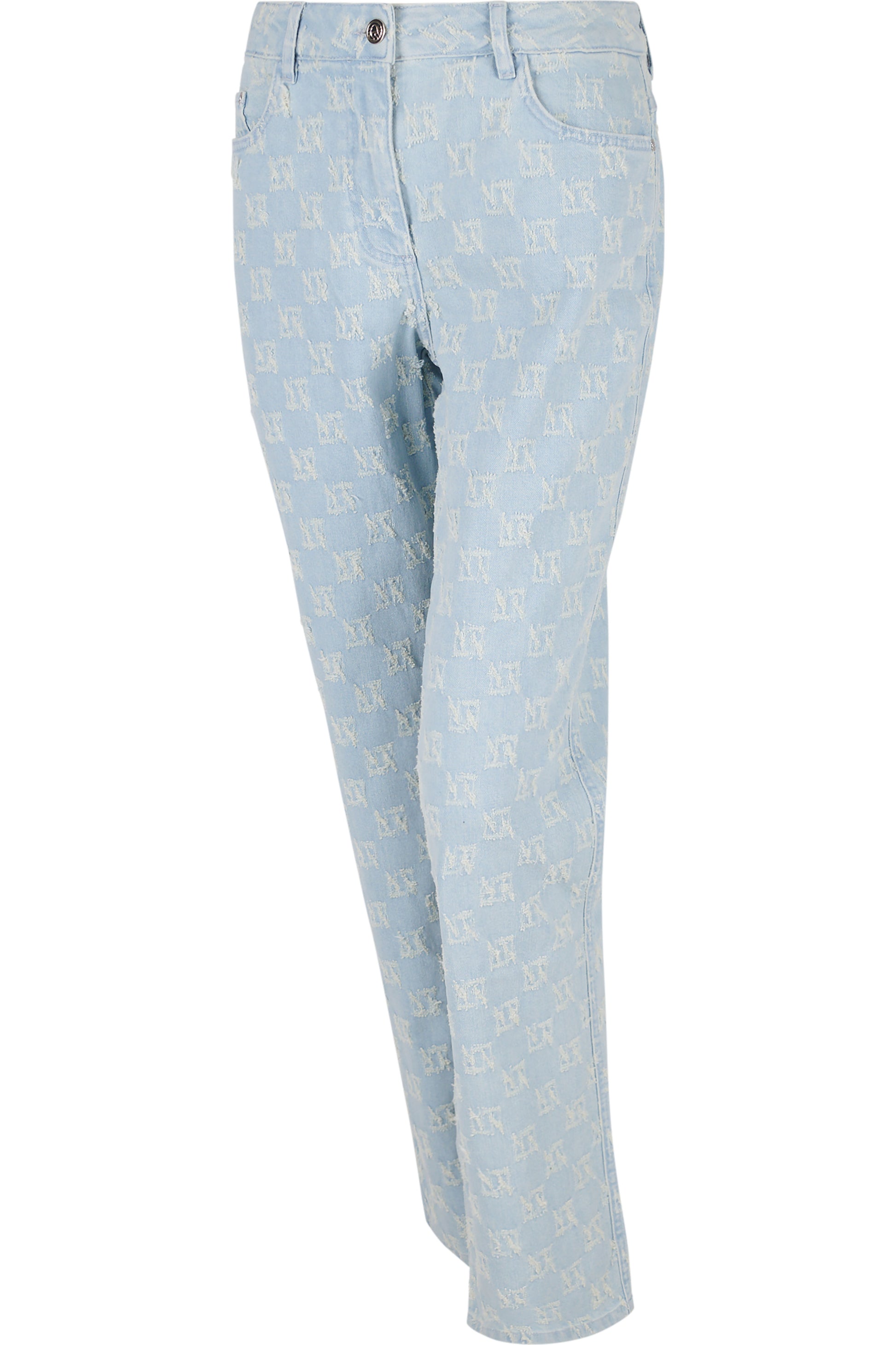 这款休闲直筒牛仔裤采用夺目的奢华激光切割棋盘格图案和时尚水洗工艺。这种设计赋予牛仔裤时尚外观,彰显现代都市风格。