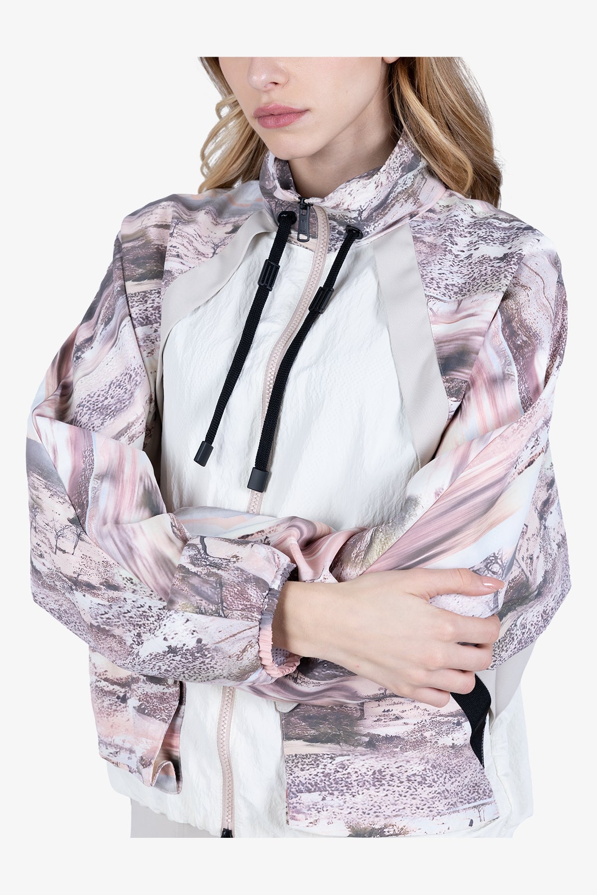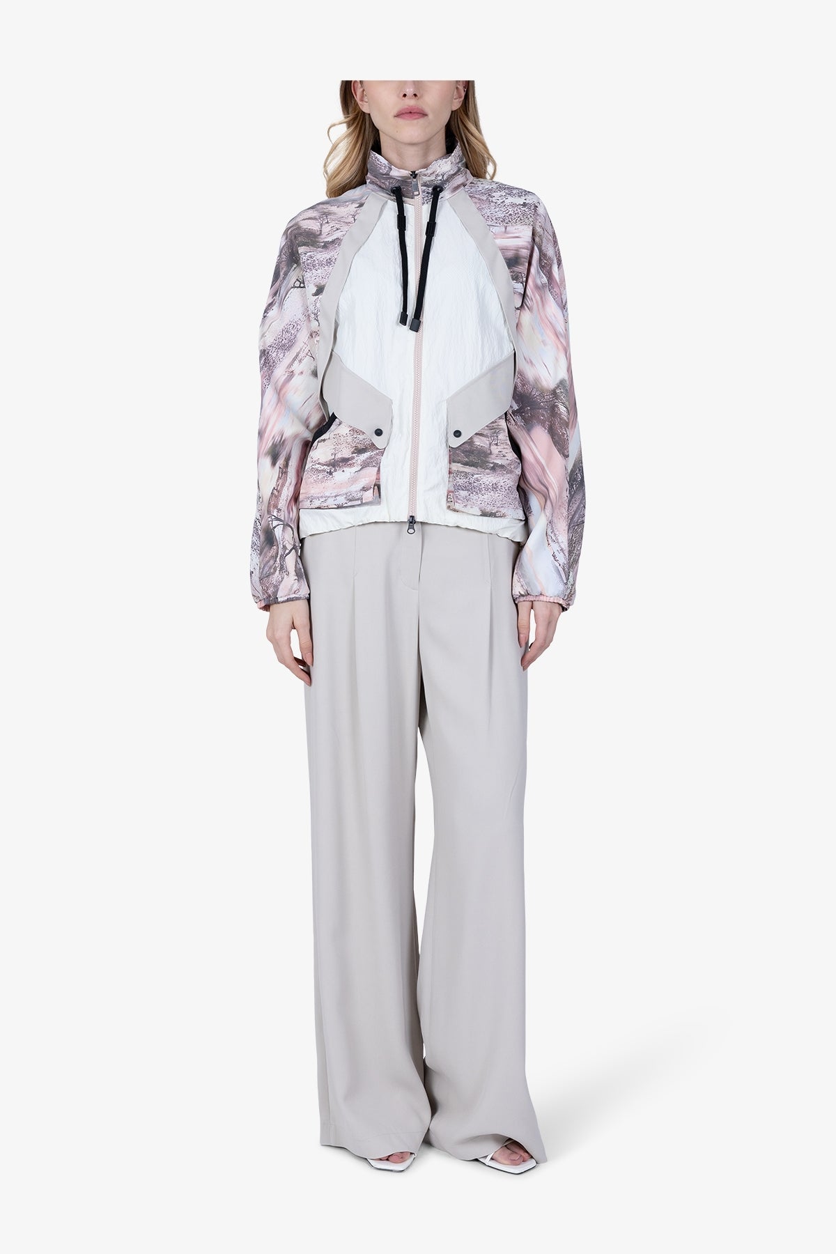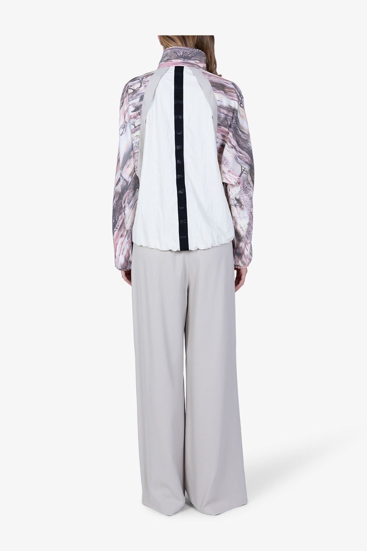 这款前卫夹克以其精致的廓形和独特的印花图案令人印象深刻。短款宽松版型,采用时下流行的oversize设计,为每套造型增添现代自信的气息。