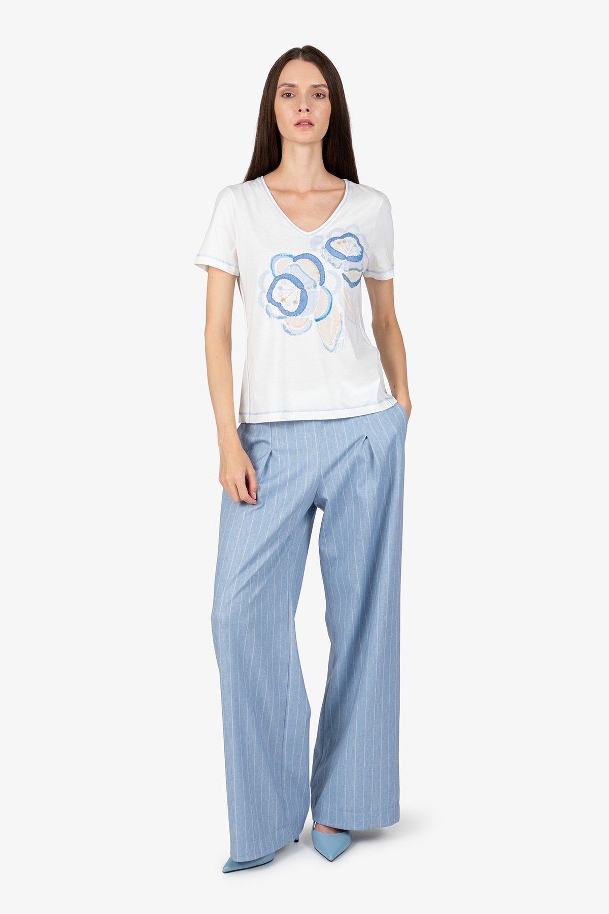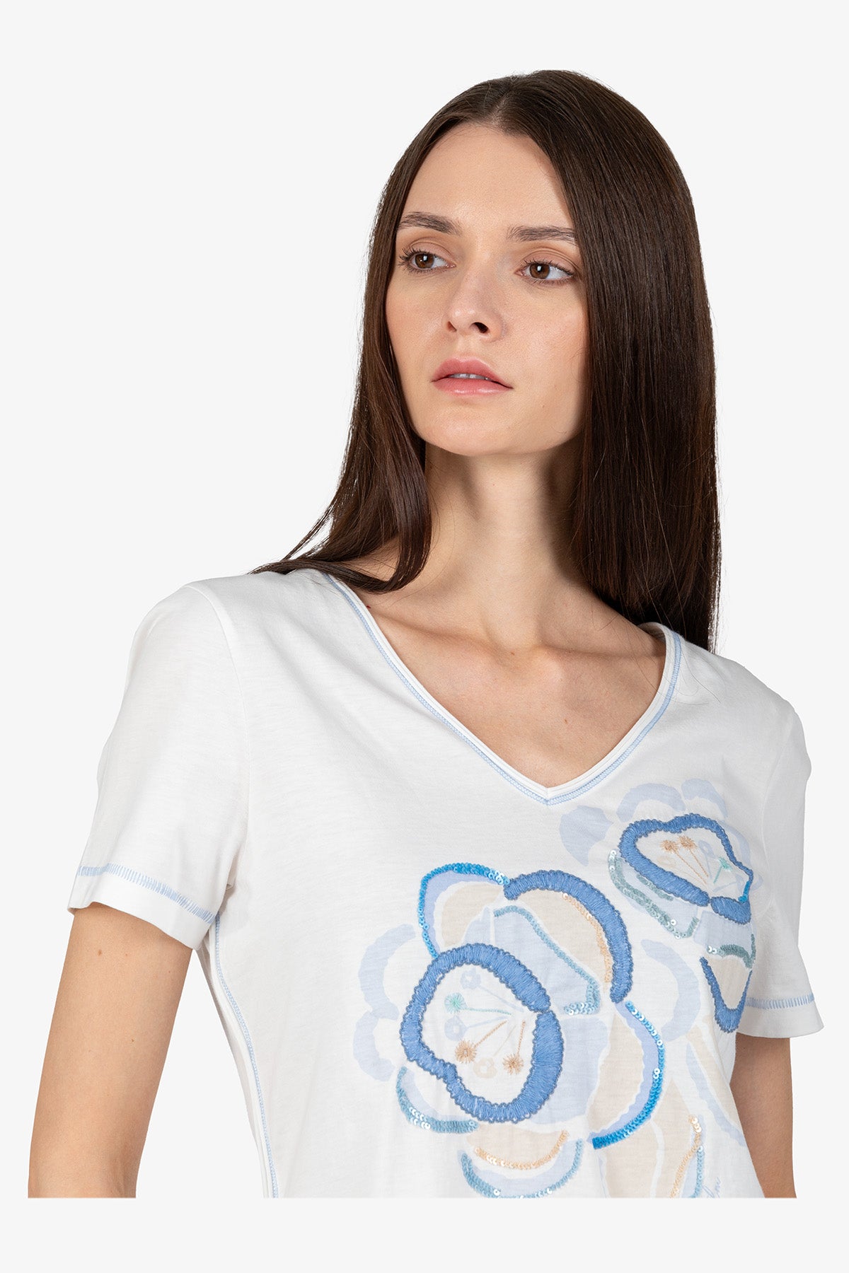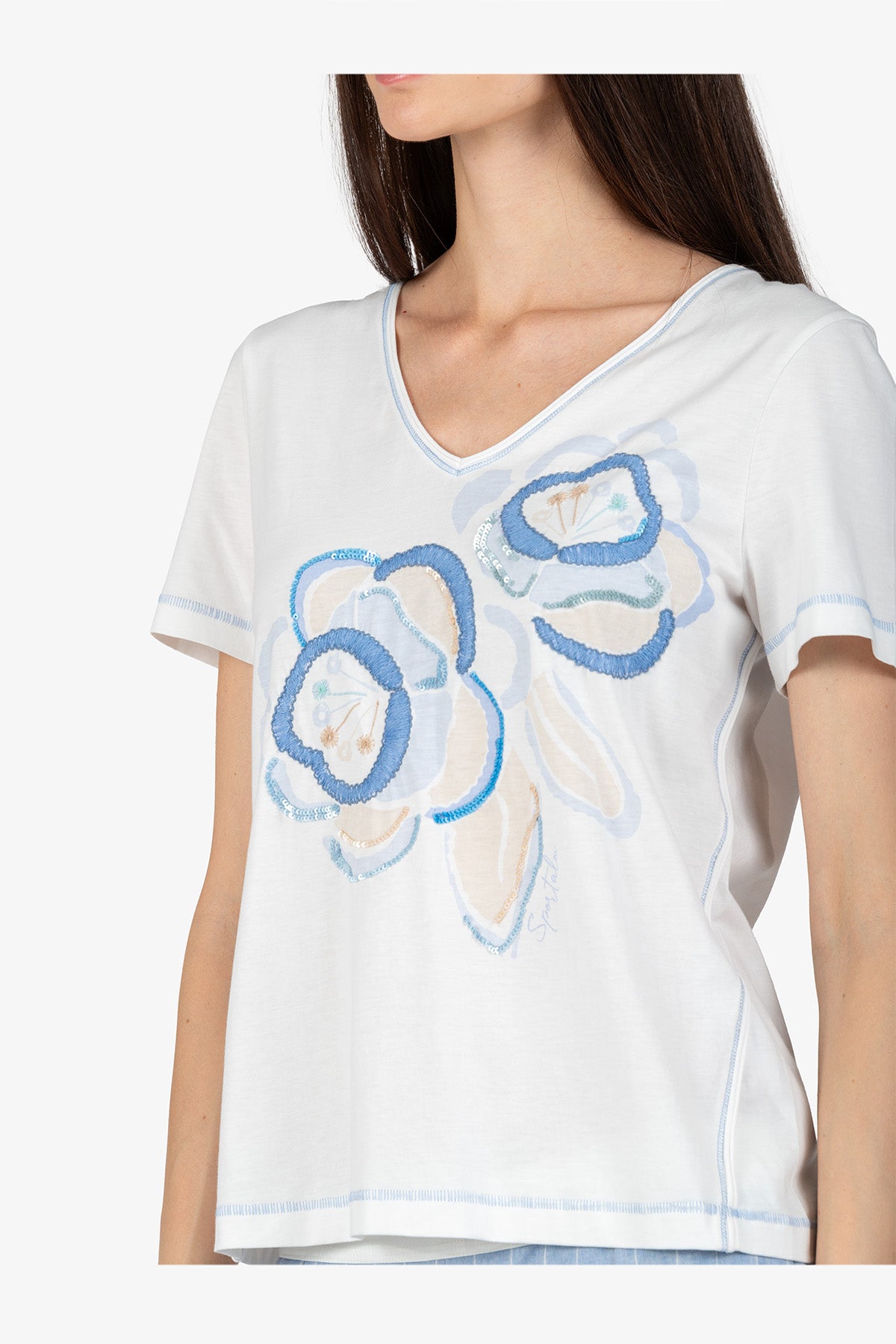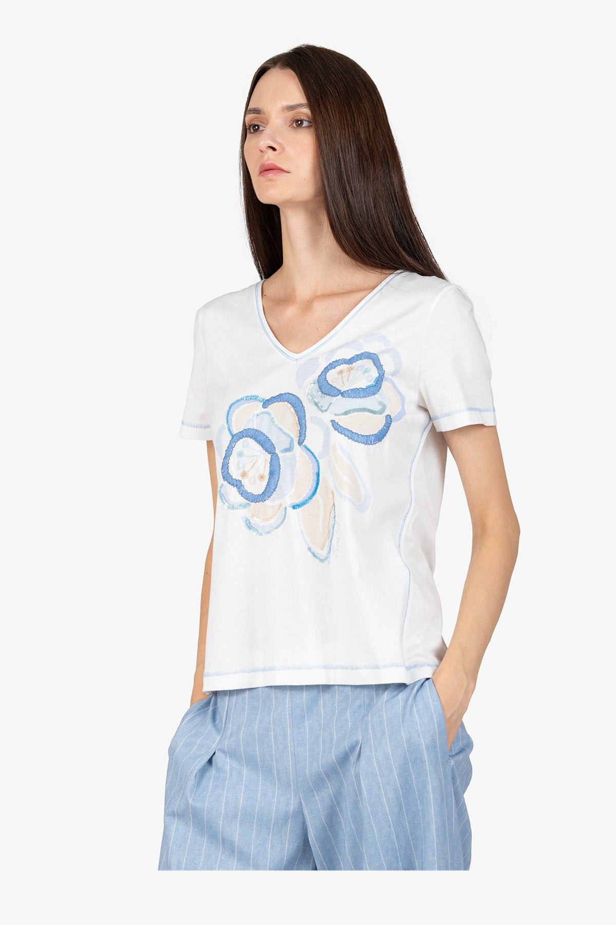 这款经典衬衫适合所有女性,正面饰有花卉图案,并点缀刺绣和亮片,令人印象深刻。它能为任何造型增添一抹女性优雅的气质。