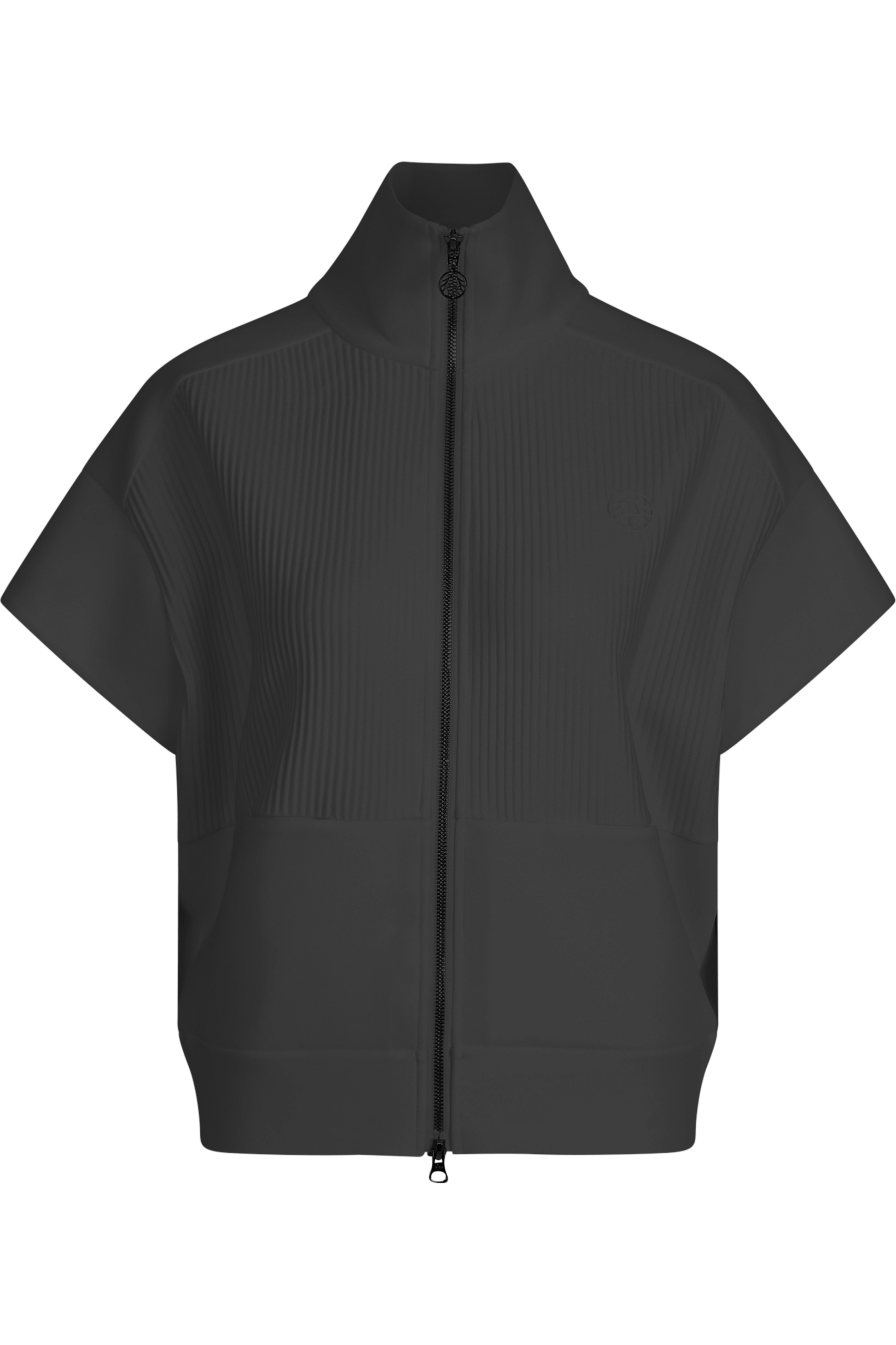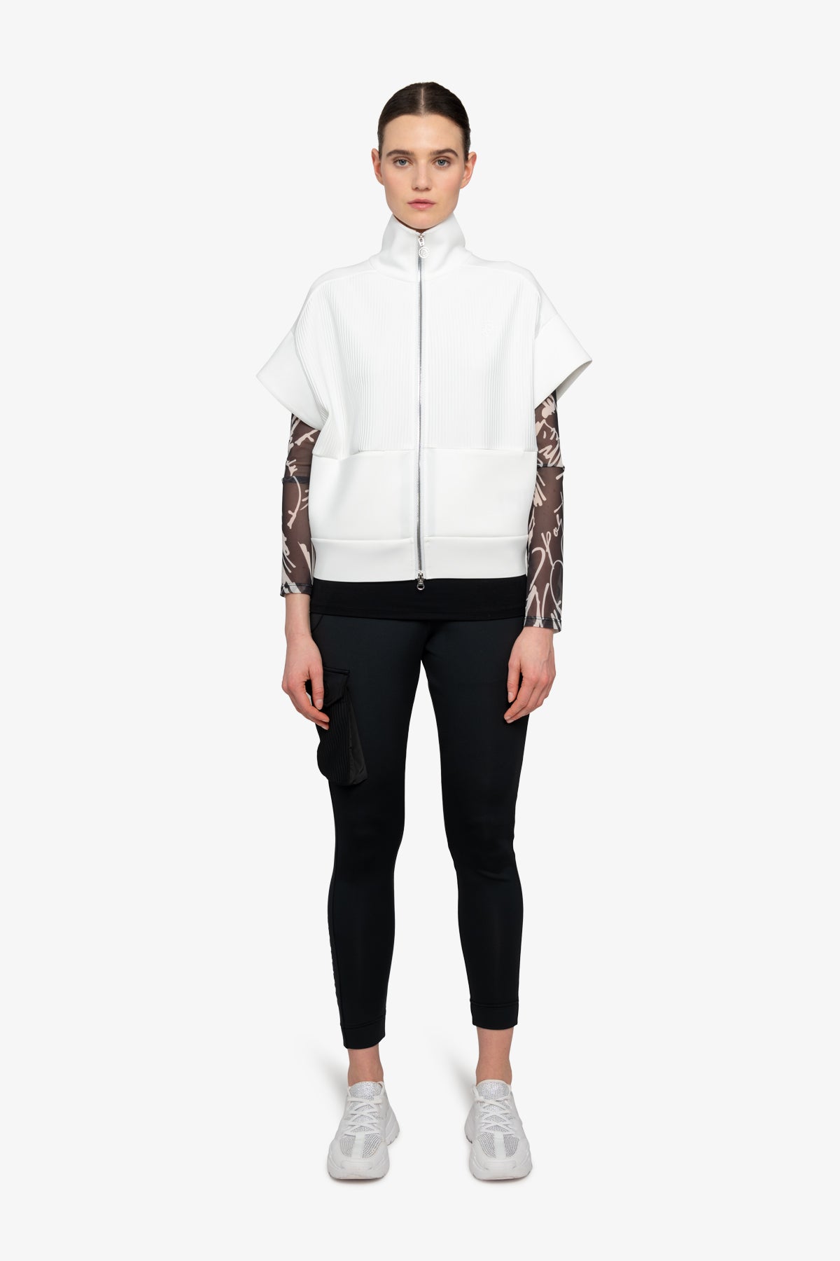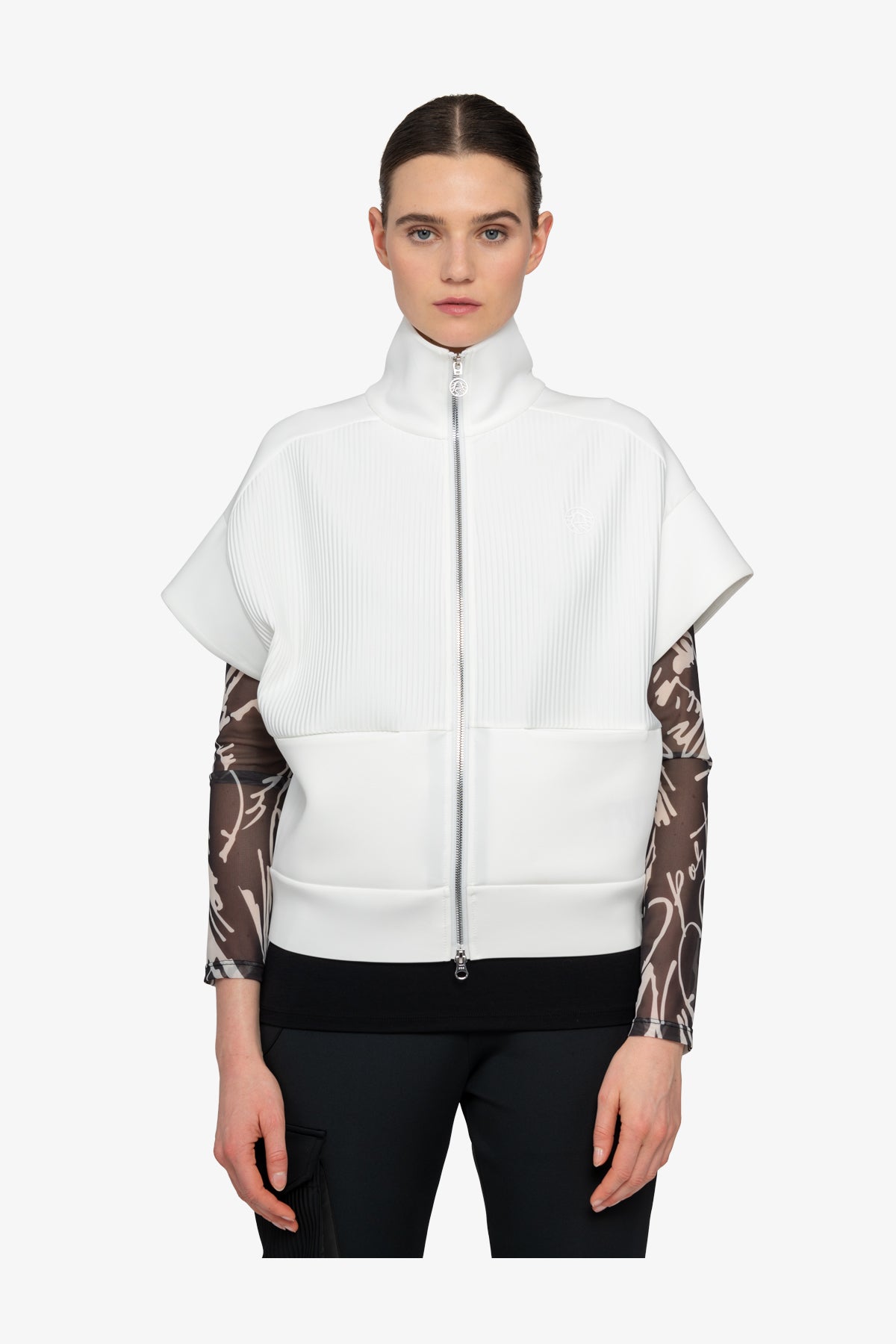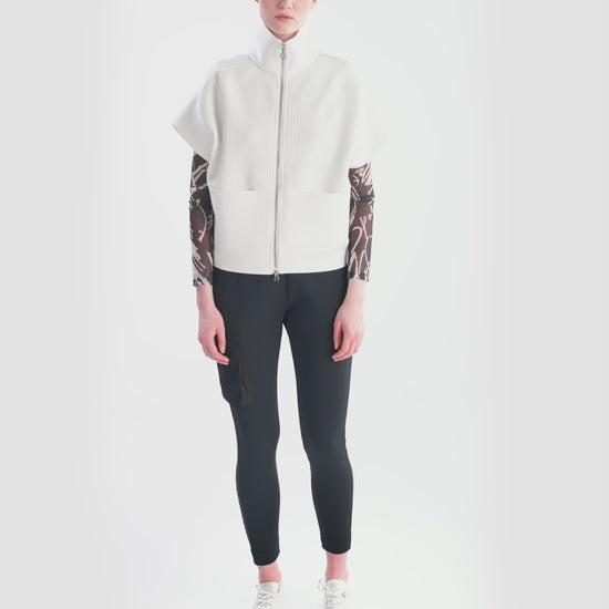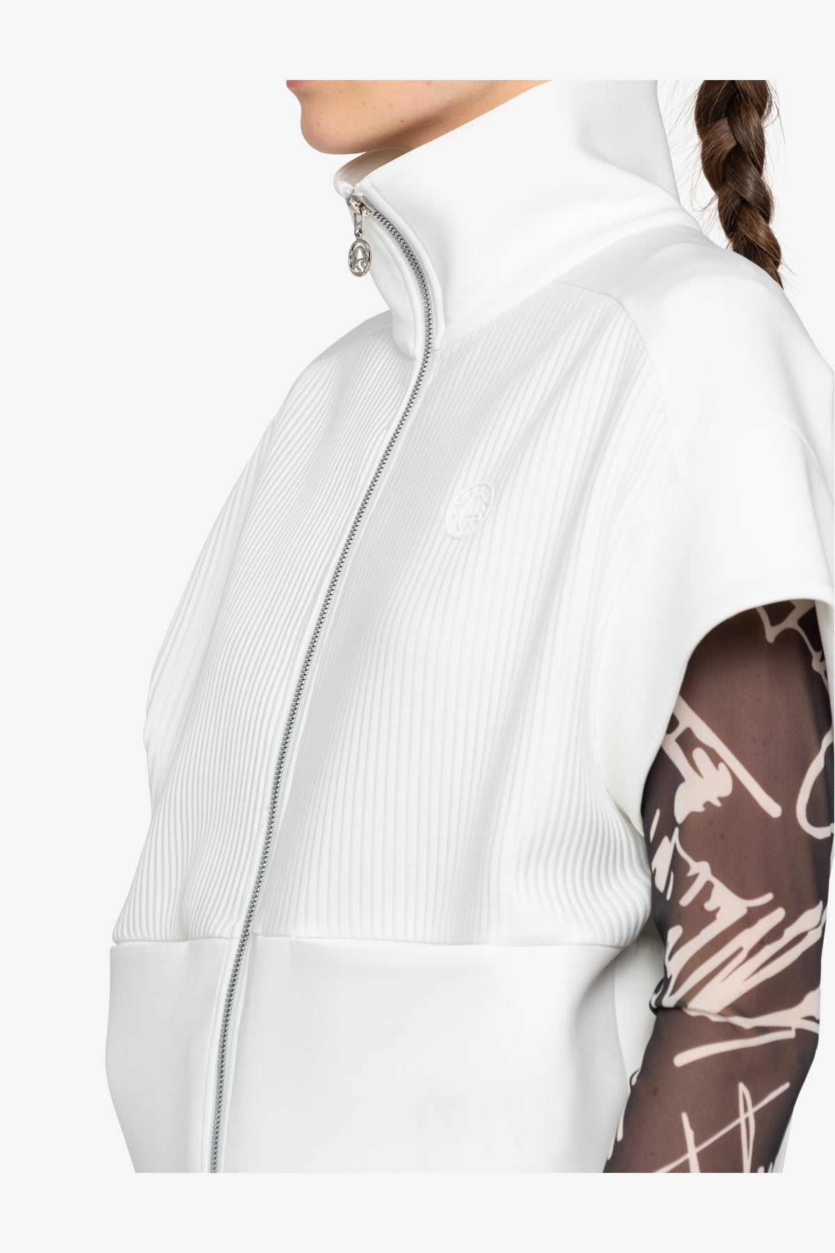 前部采用褶皱纹理针织面料,为背心增添了精致感。前部印有 3D 徽标,后部下摆饰有浮雕图案,为背心增添了醒目的亮点,使背心真正引人注目。