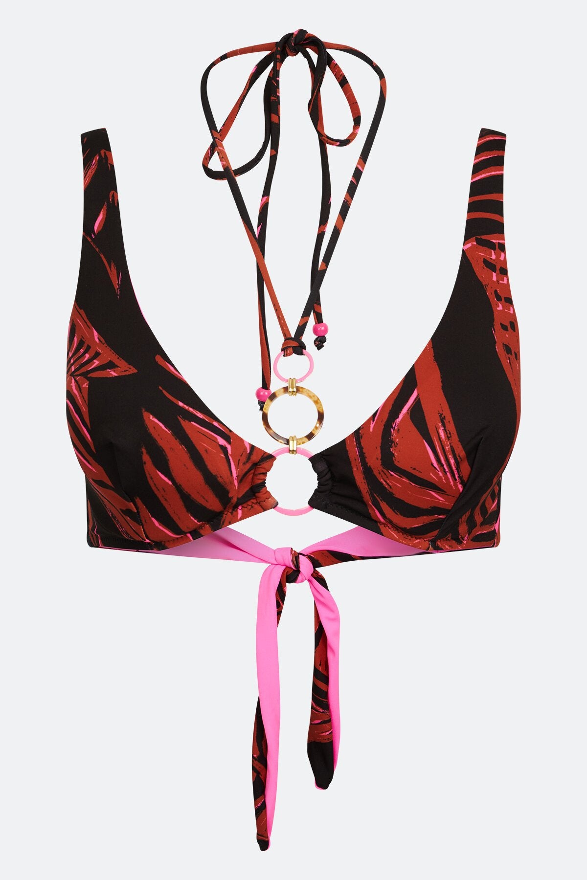 這款比基尼上衣採用印花比基尼面料製成,領口和頸部有裝飾性的鏈條細節。