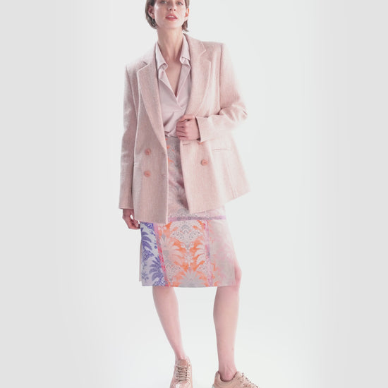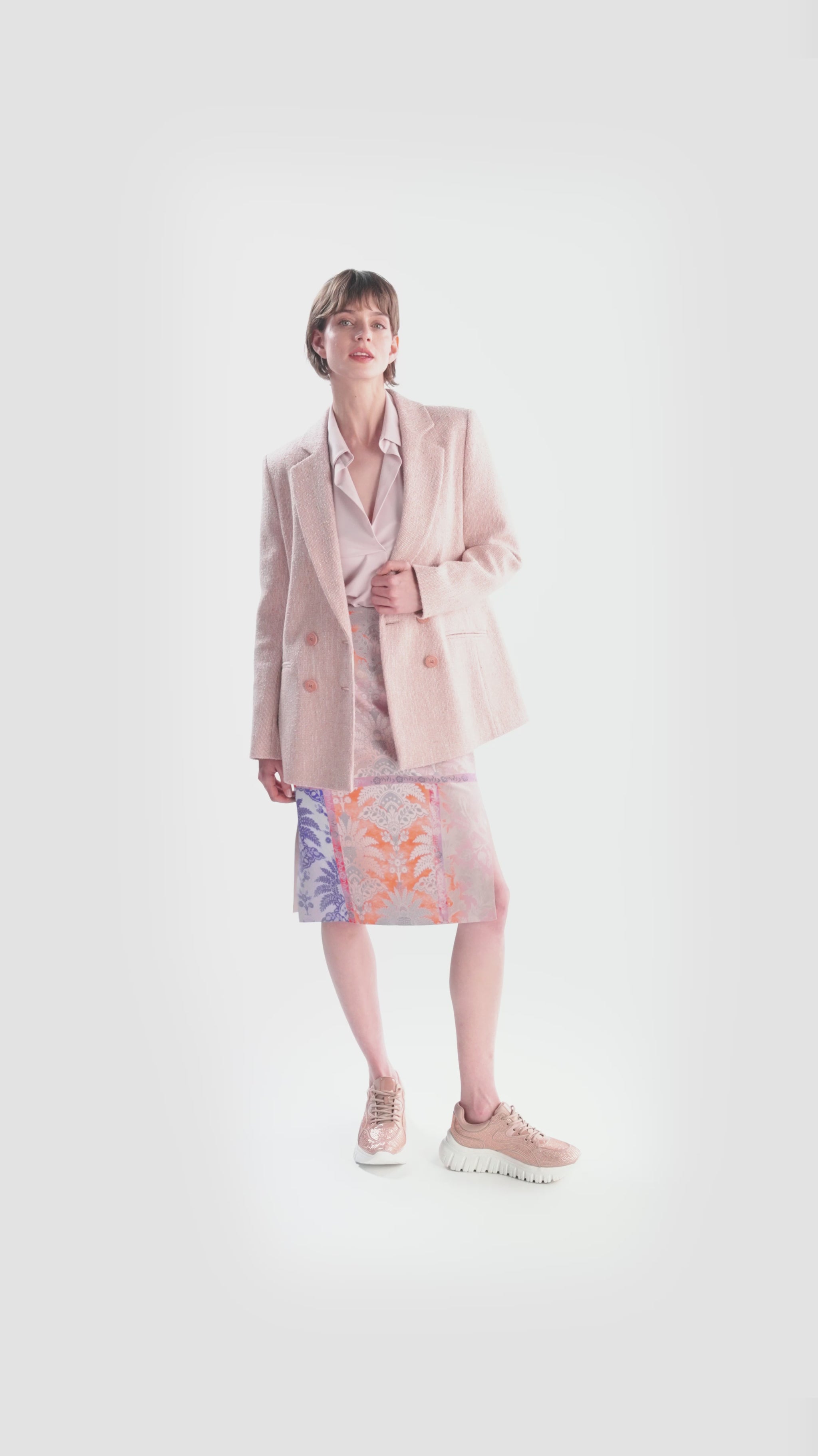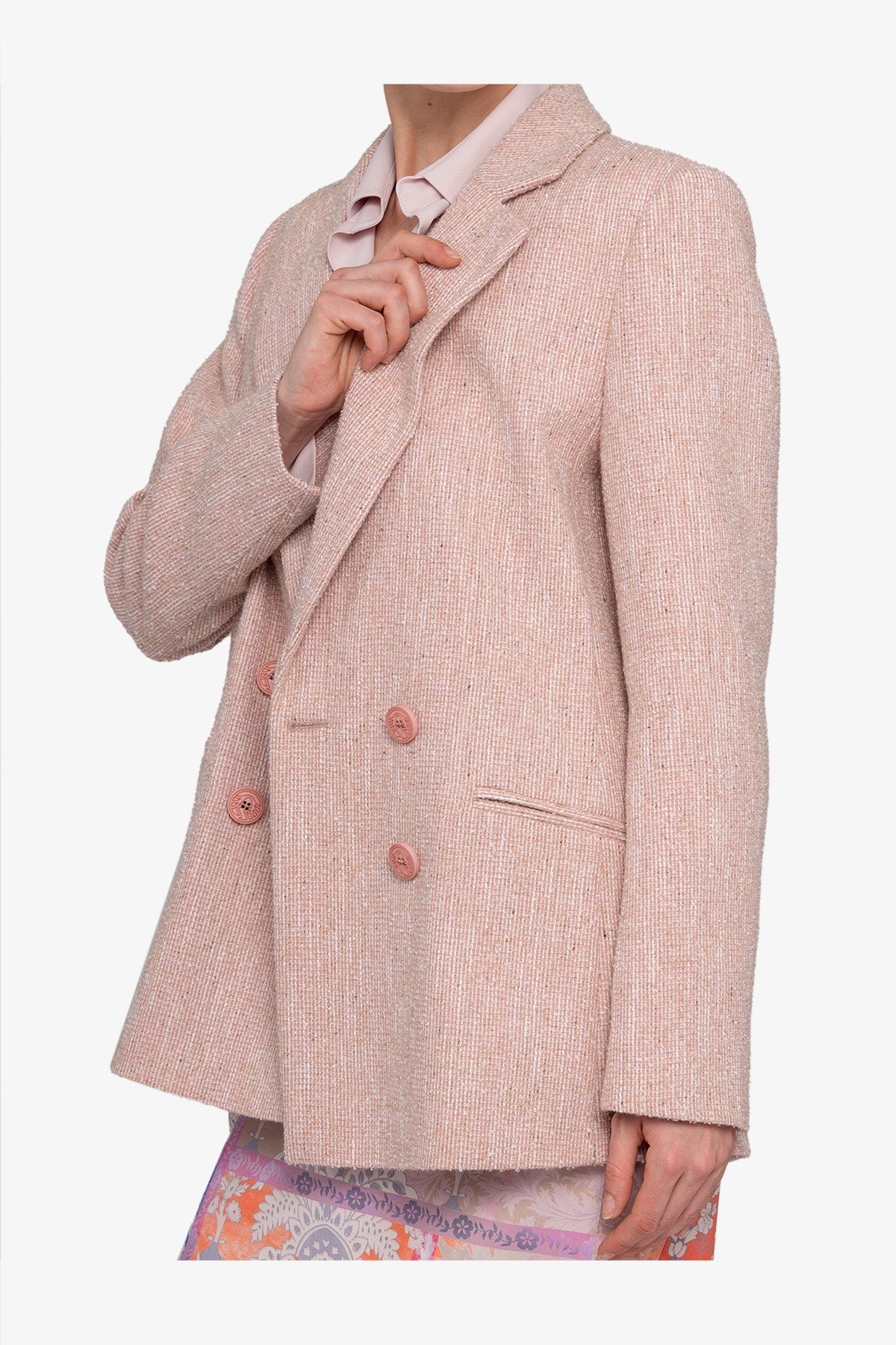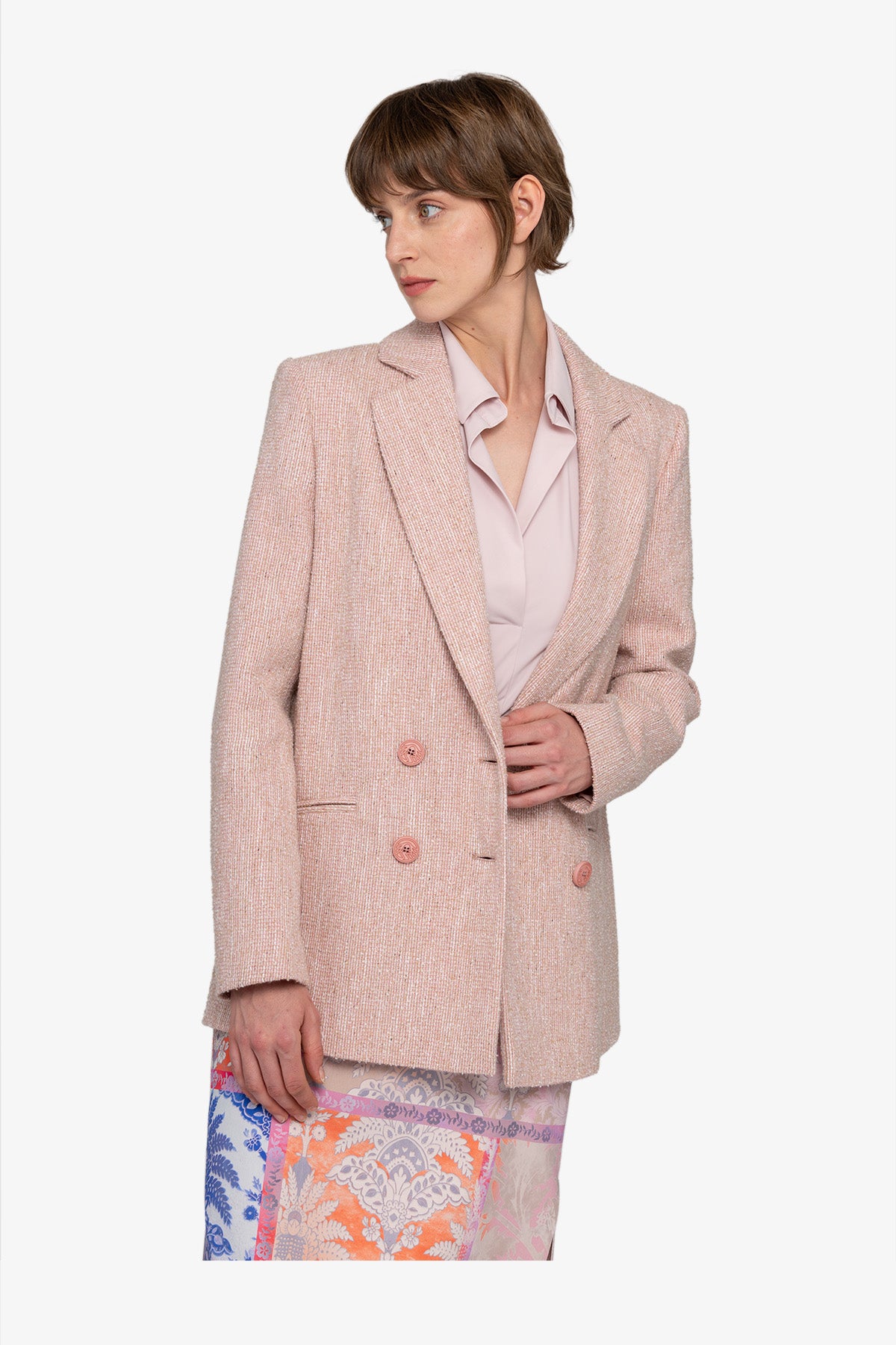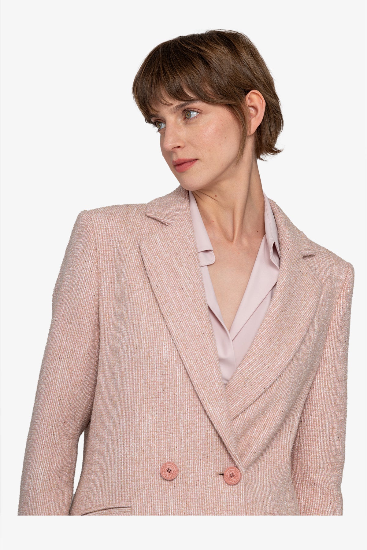 這款西裝外套既令人興奮又充滿女人味。它採用女性化花呢布料製成的長翻領。雙排扣開合,正面中央飾有標誌紐扣,增添獨特氣息。