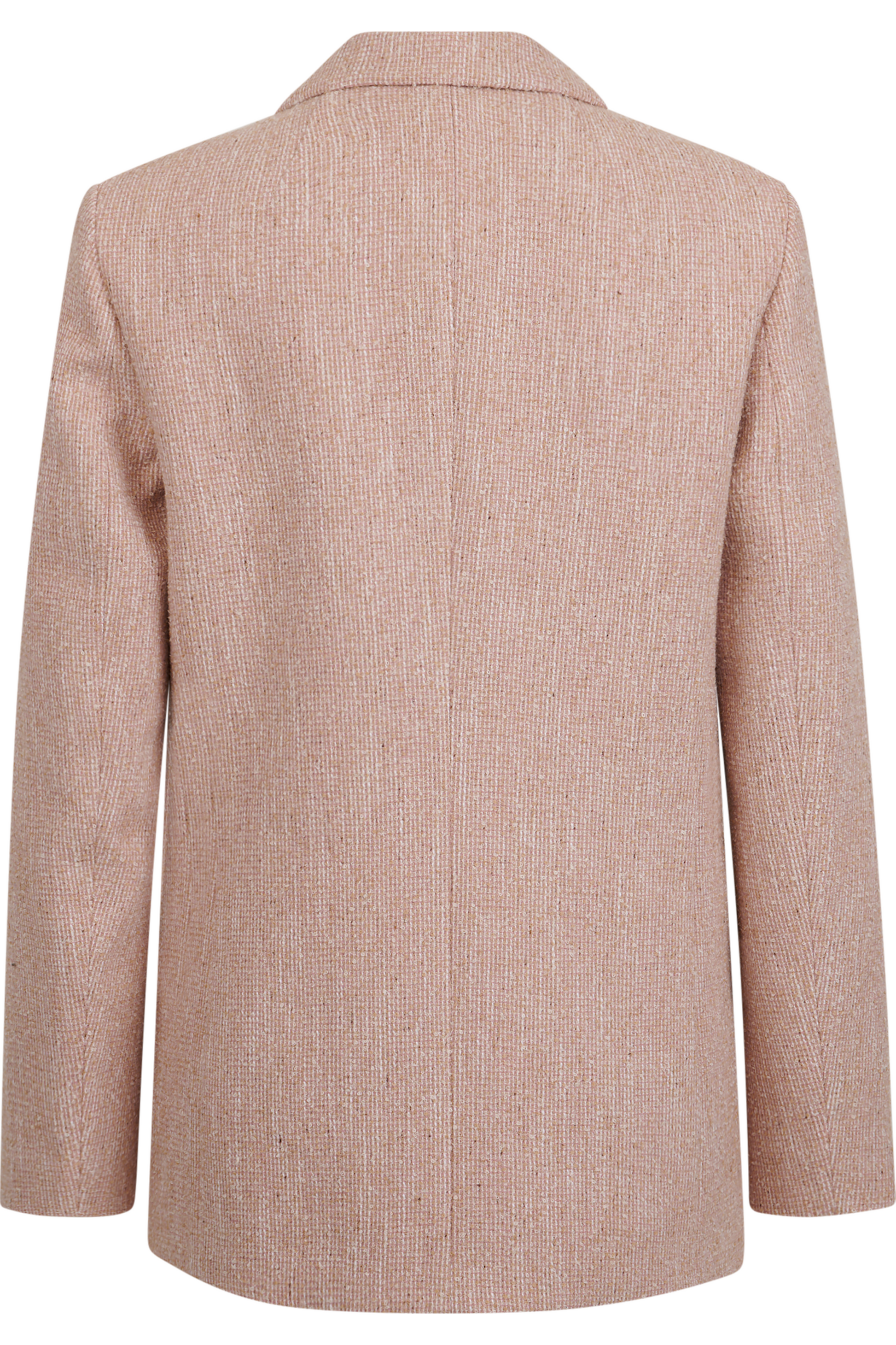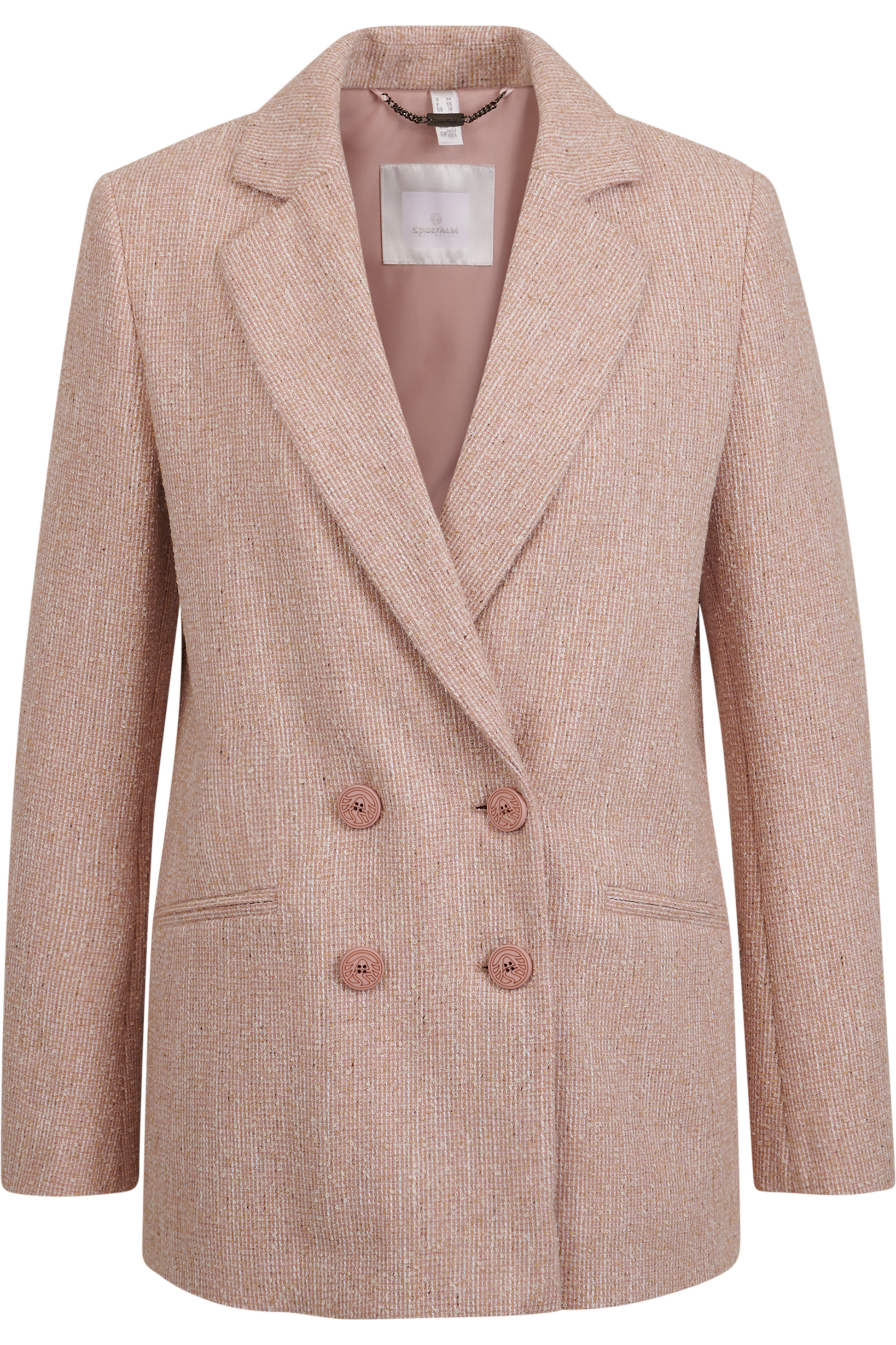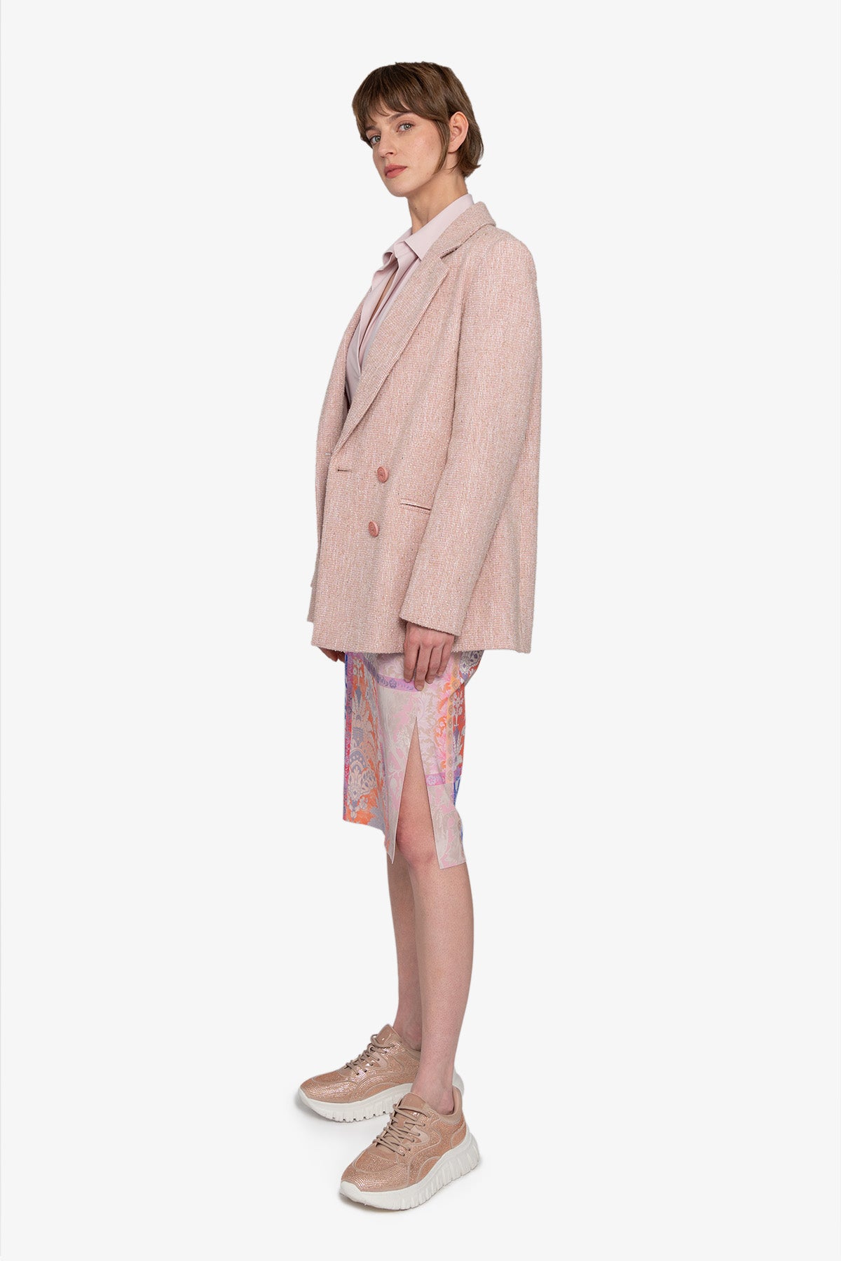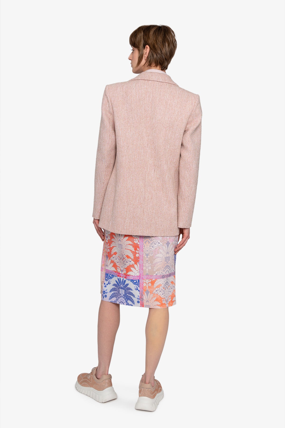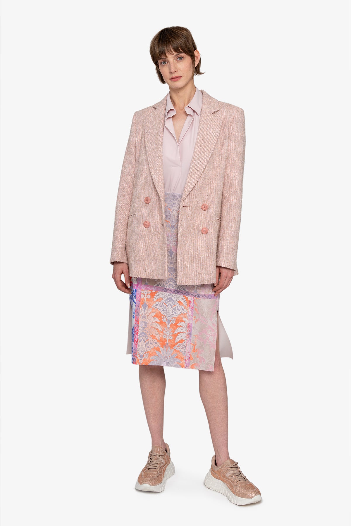 這款西裝外套既令人興奮又充滿女人味。它採用女性化花呢布料製成的長翻領。雙排扣開合,正面中央飾有標誌紐扣,增添獨特氣息。