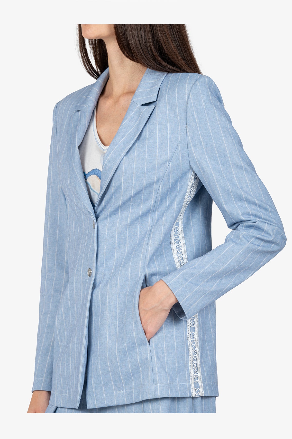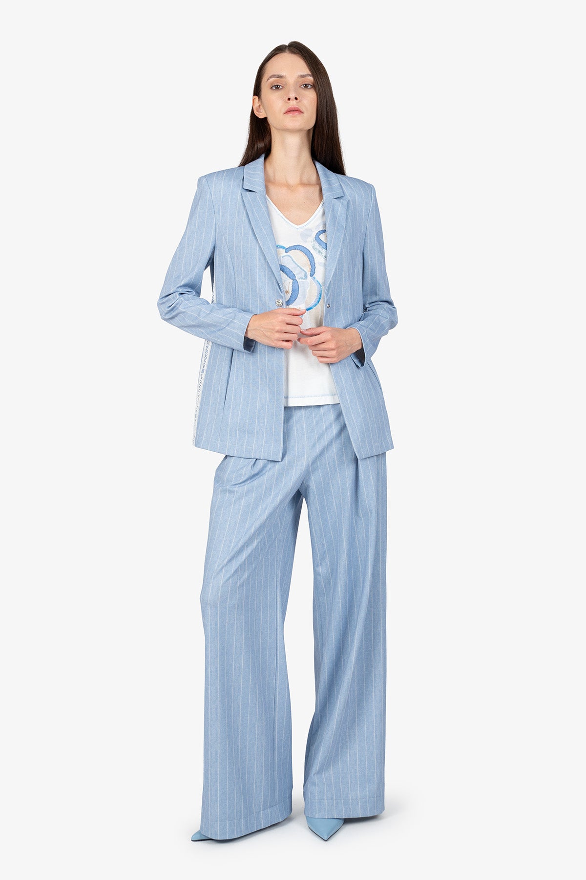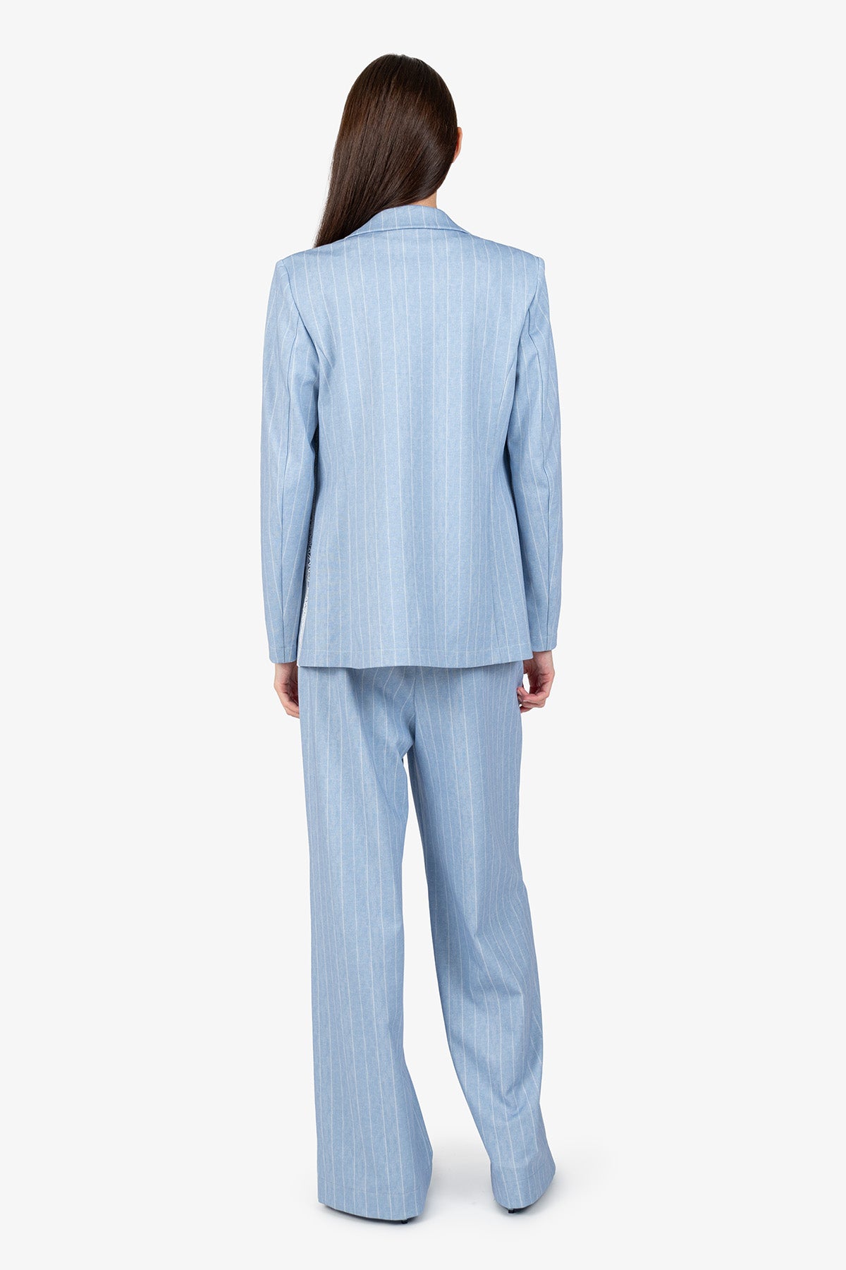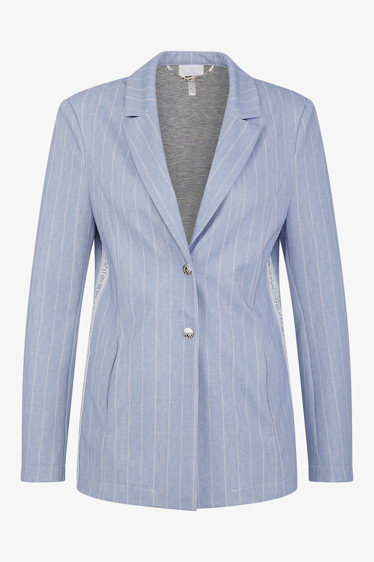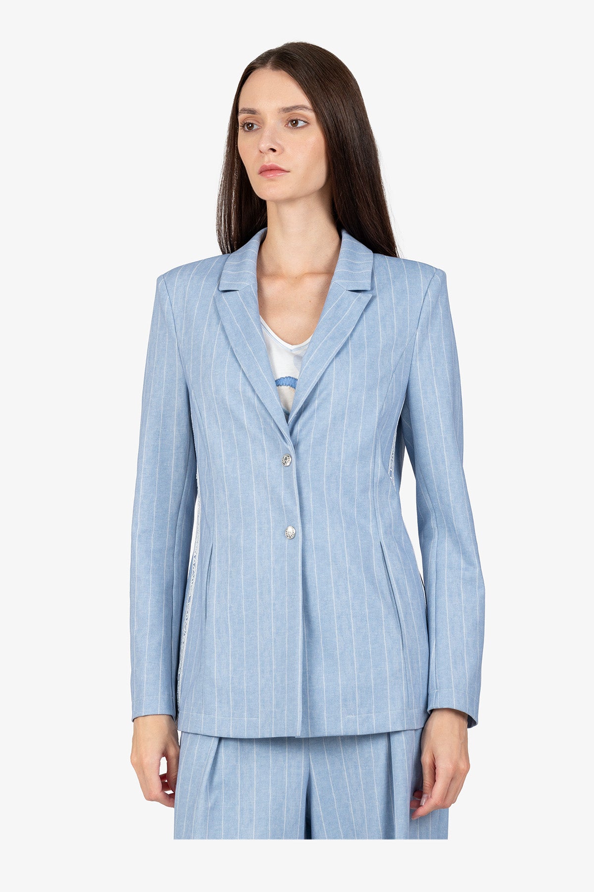 這款經典西裝外套採用翻領設計,由運動針織面料和細條紋製成,融合了現代與經典。完美結合時尚與舒適的多功能服飾。