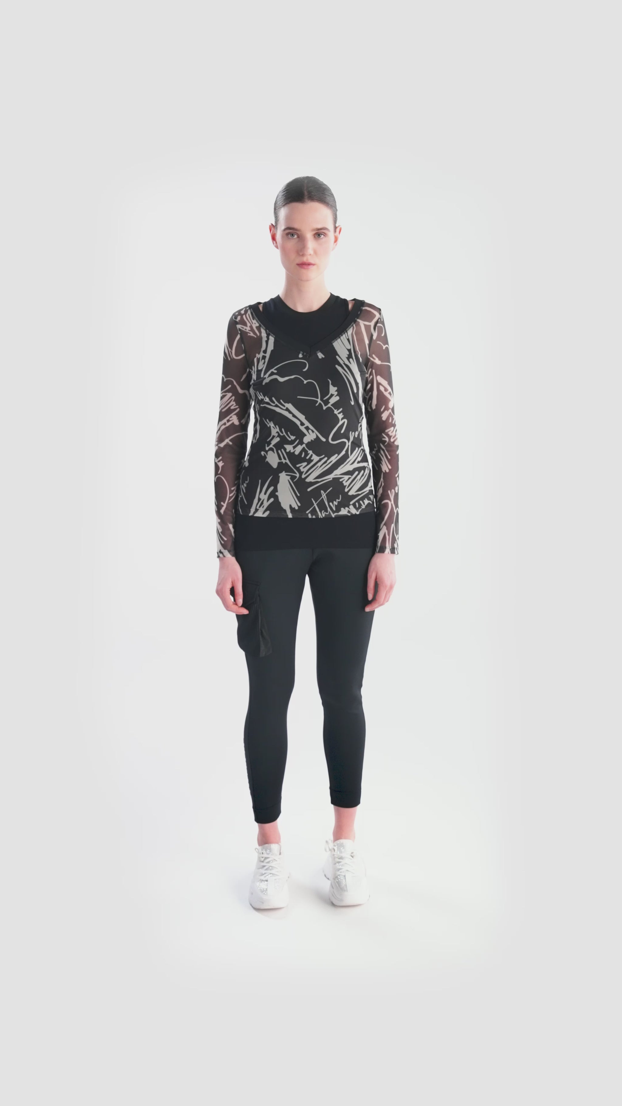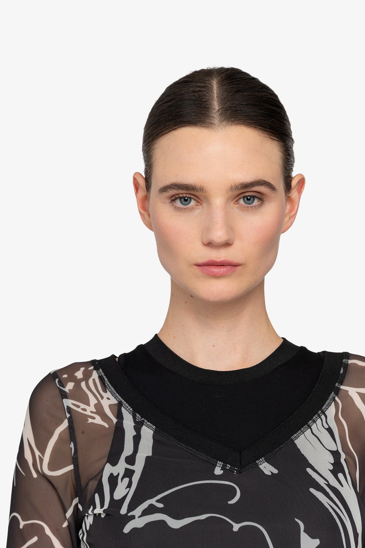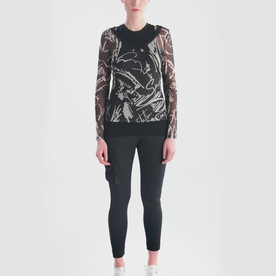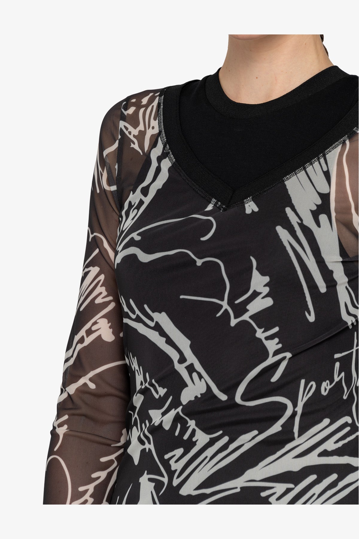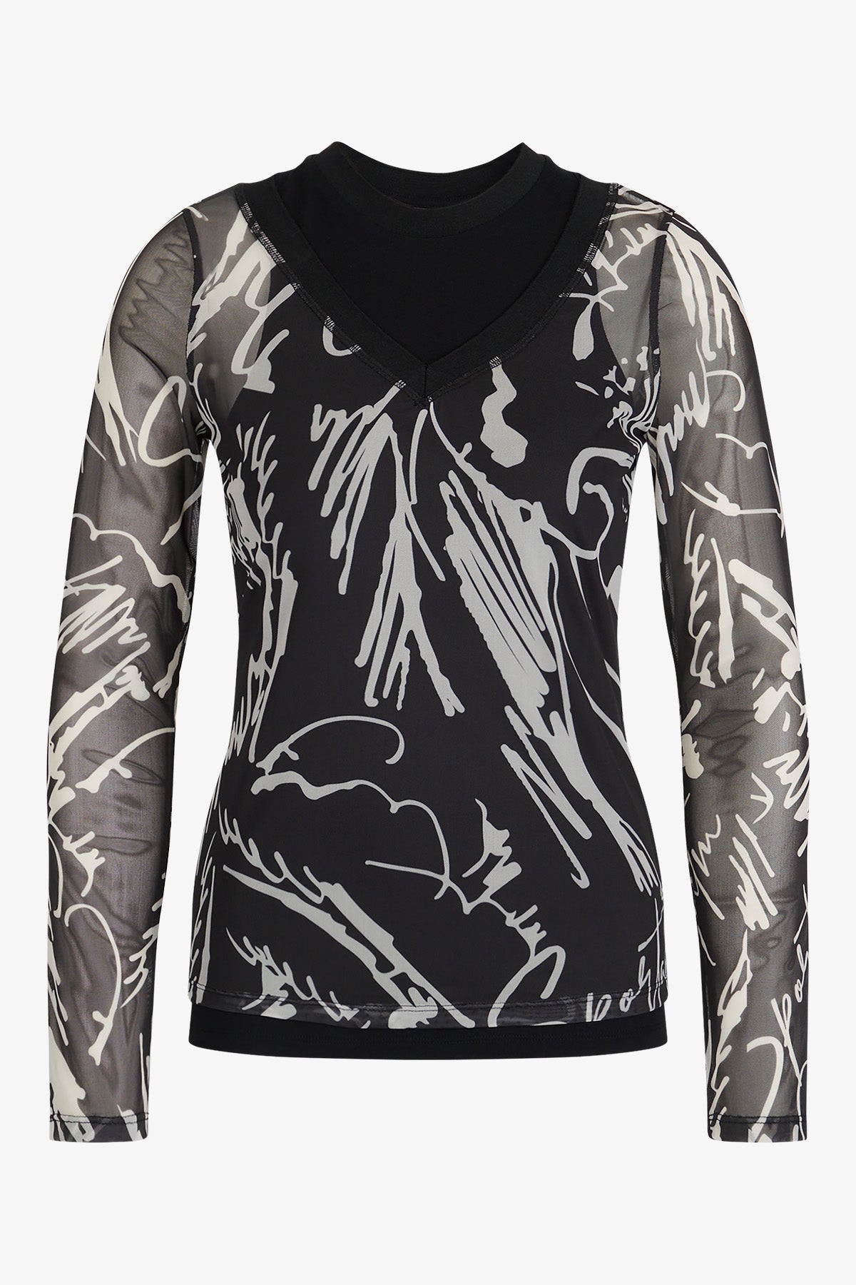 我們的雙層網狀襯衫採用寬 V 領和印花網狀材料,賦予其現代感。