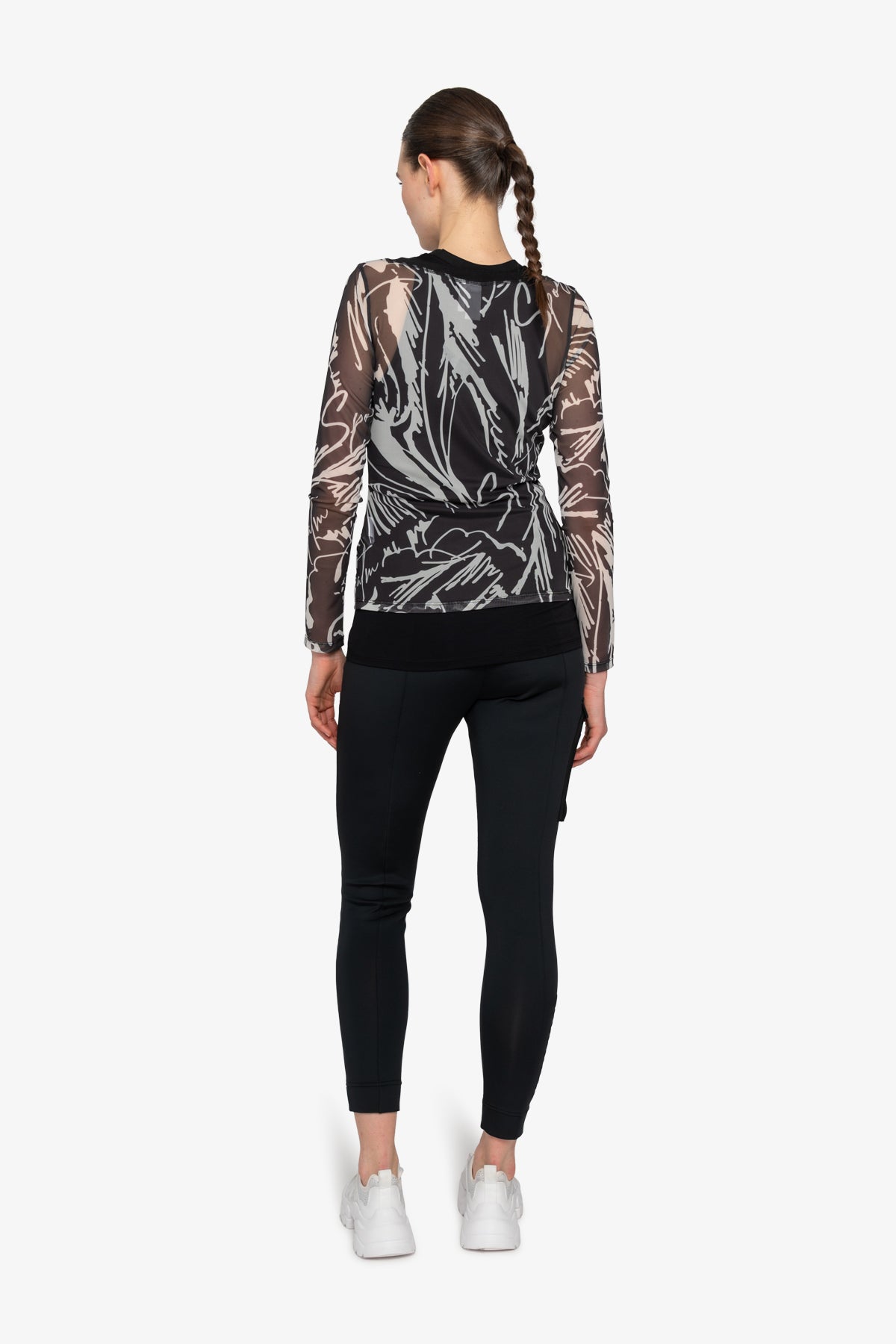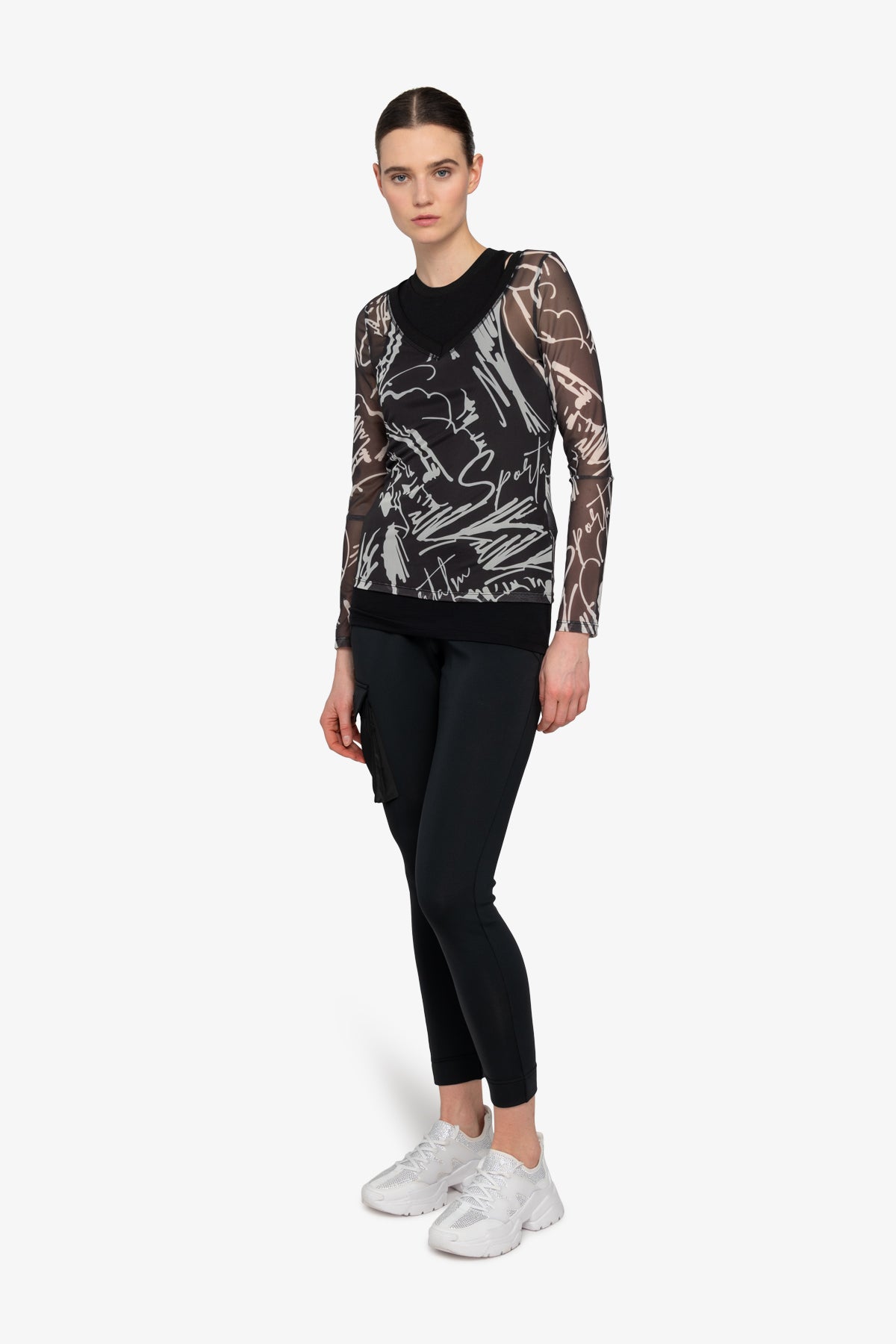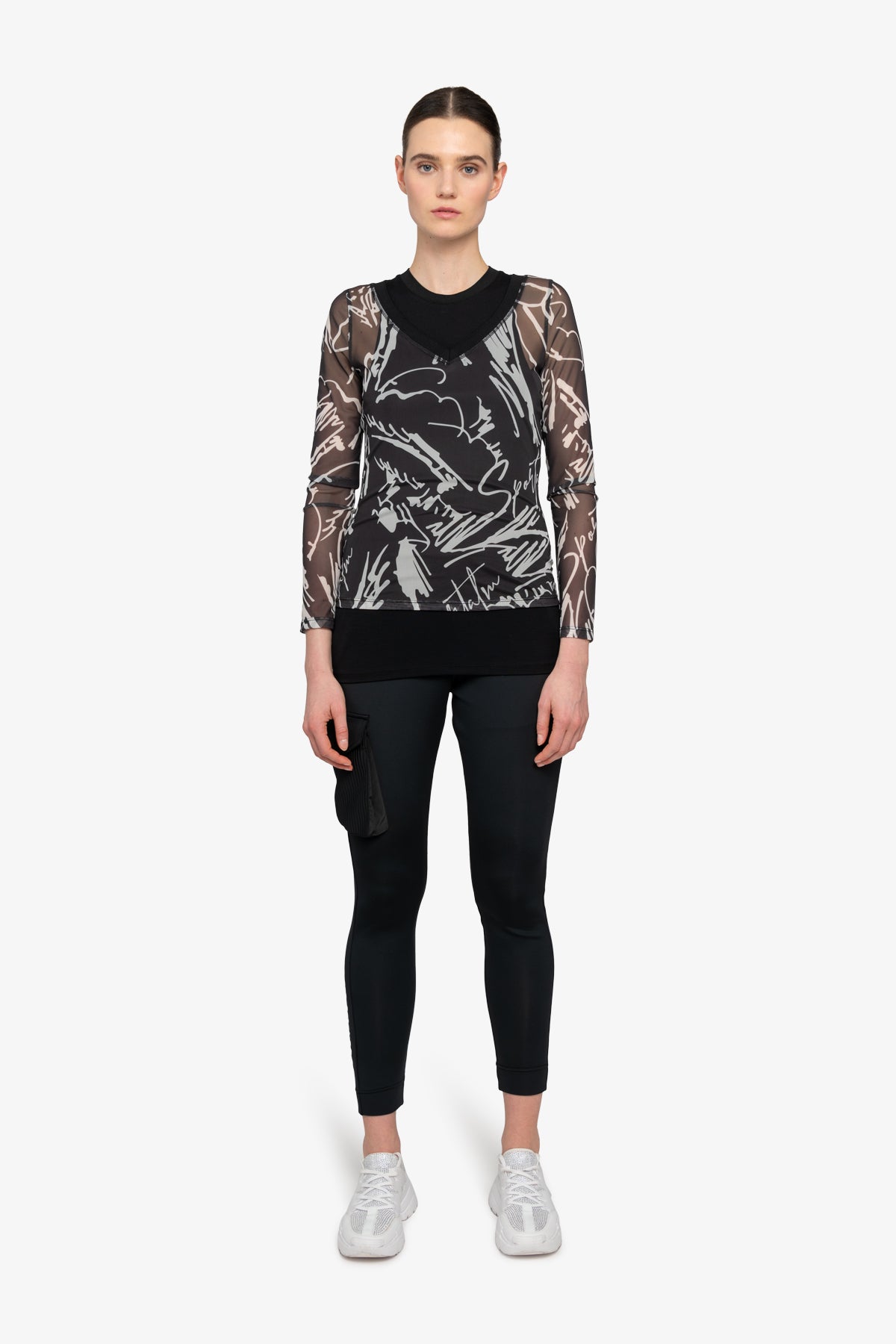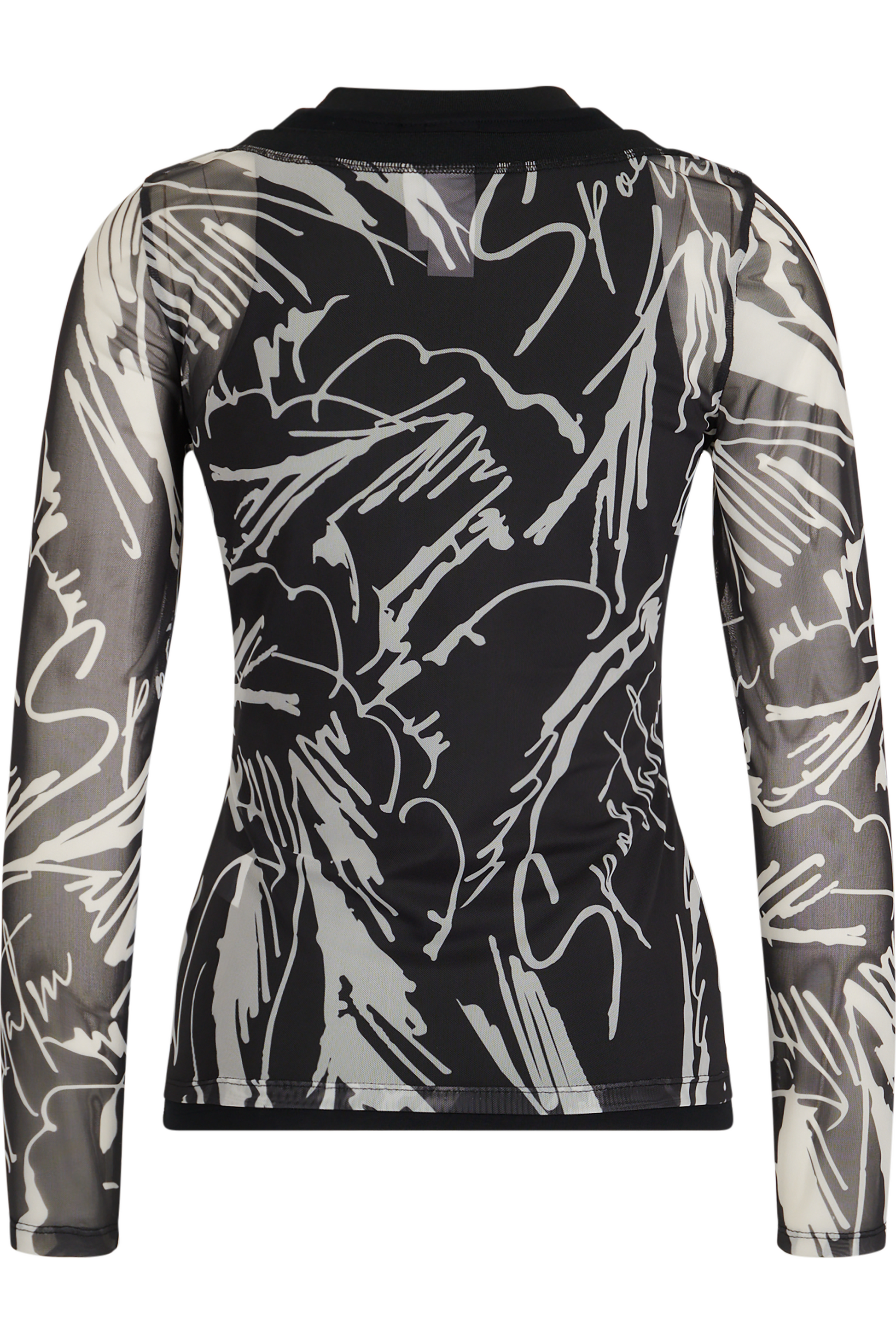 我們的雙層網狀襯衫採用寬 V 領和印花網狀材料,賦予其現代感。
