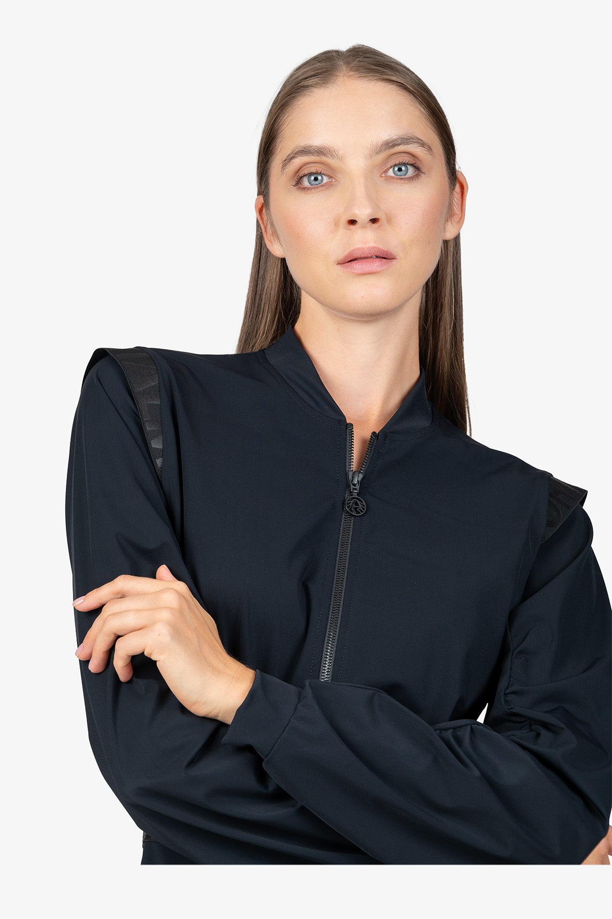 亮點:束腰式上衣,腰部配有鬆緊帶,正面中央開衩,下擺和開衩採用毛邊效果,下擺帶有字標轉印印花
