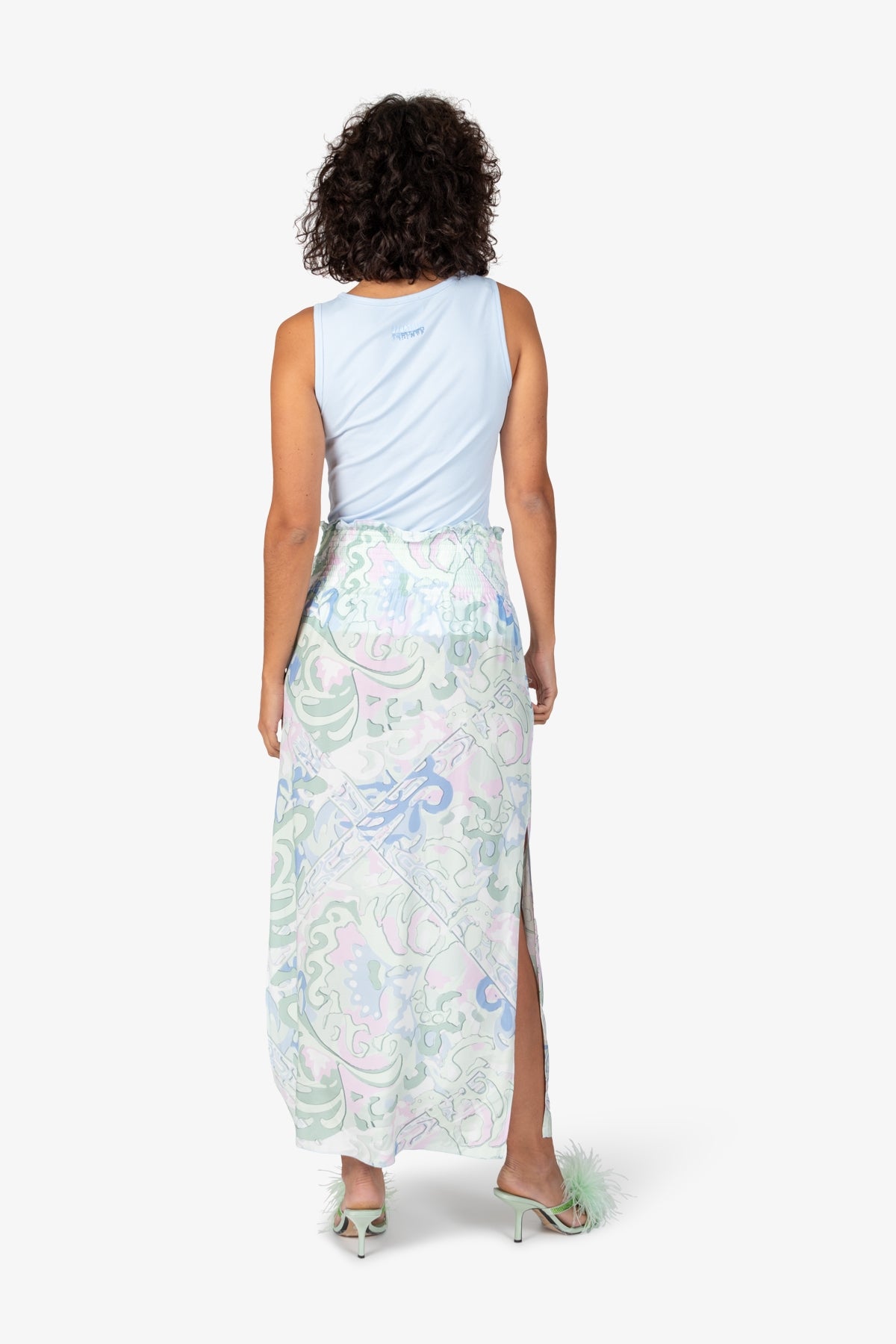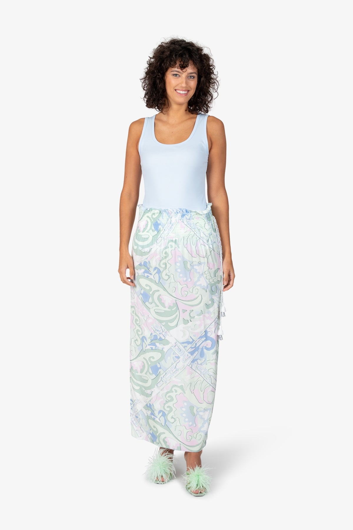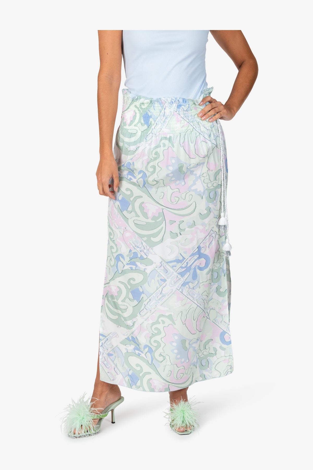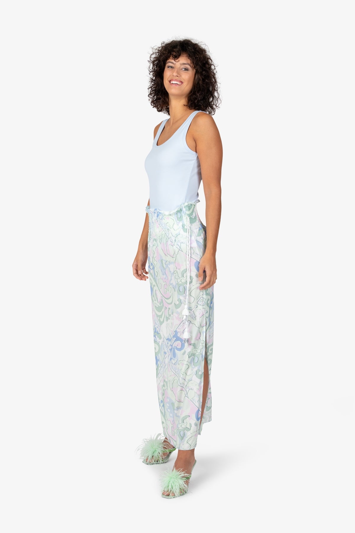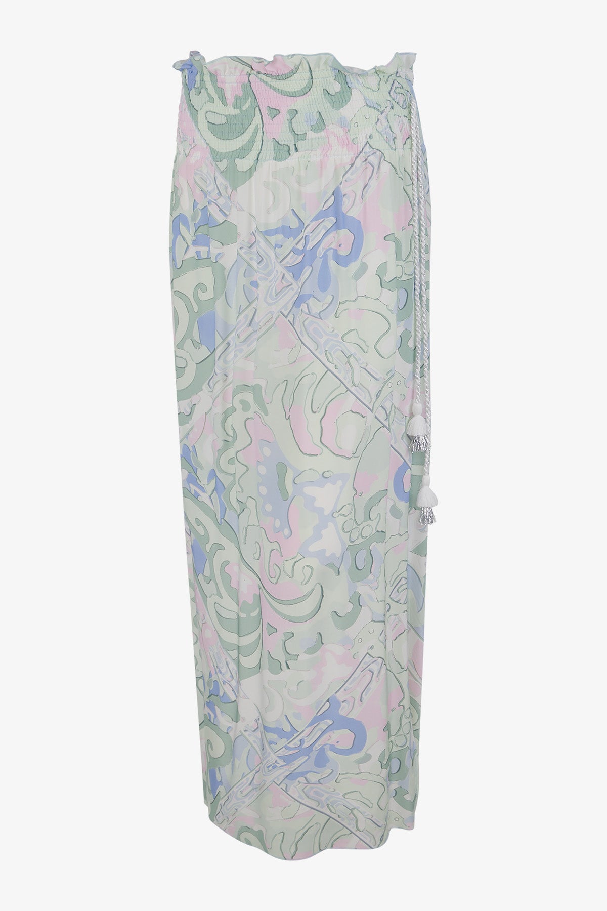 亮點:側腰帶縫有休閒繩,側開衩較高,腰帶和下擺邊緣採用 Babylock 包縫36 碼裙長:106.0 厘米