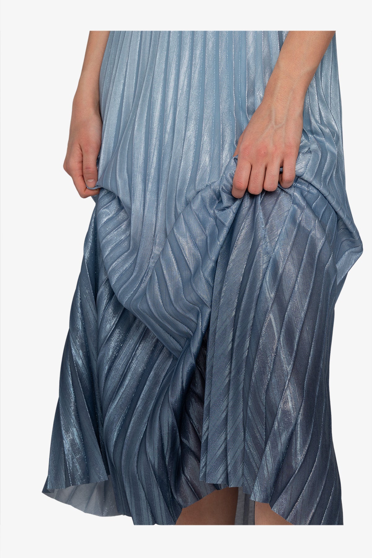 閃亮的面料與藝術性的褶皺設計相結合,賦予這款裙子時尚又時尚的外觀。