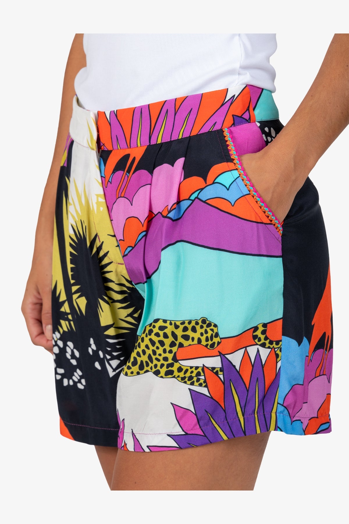 這些帶有彩色印花的短褲非常適合炎熱的夏天。它們輕盈舒適,其鮮豔的設計為您帶來清新、時尚的外觀。非常適合輕鬆休閒活動。