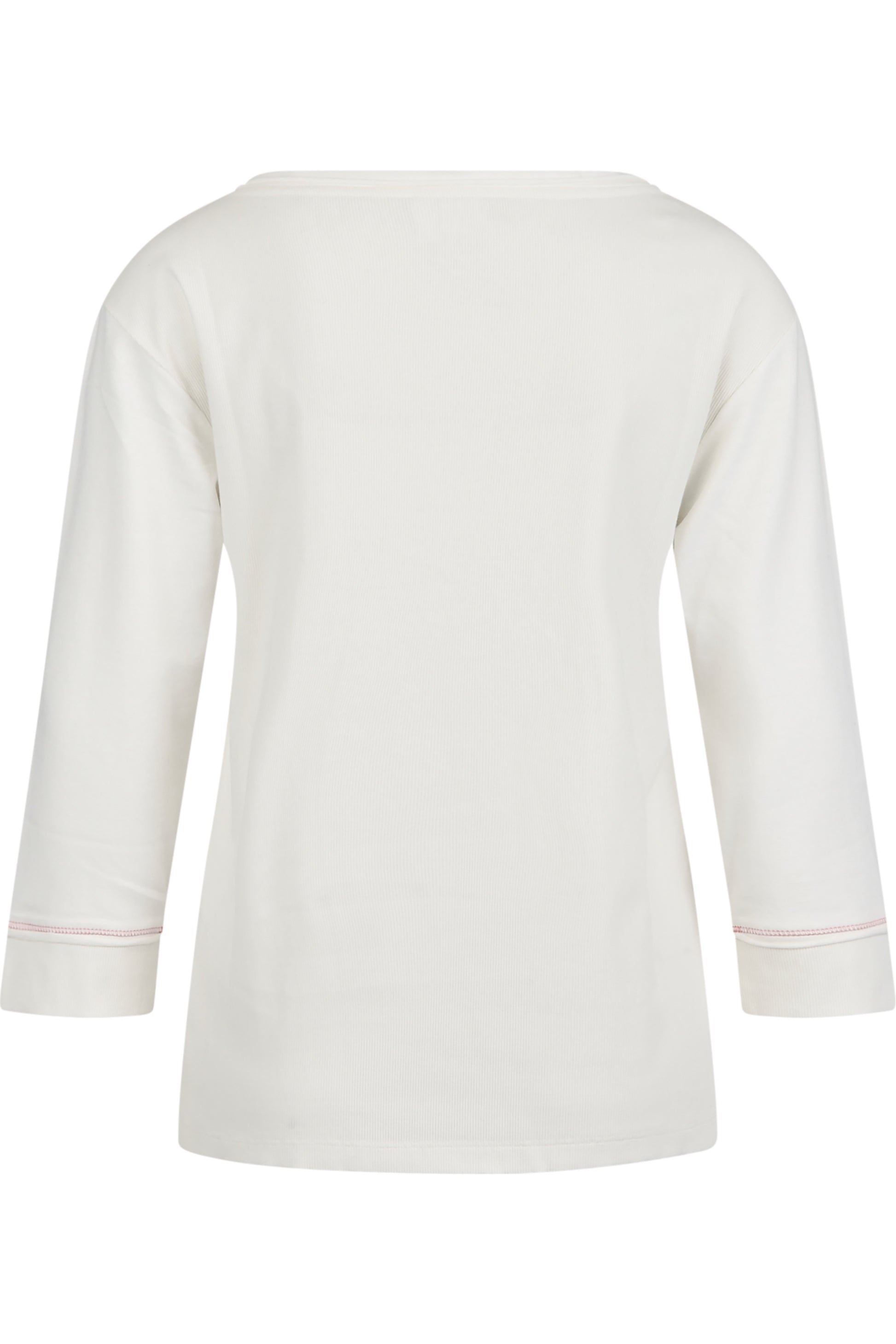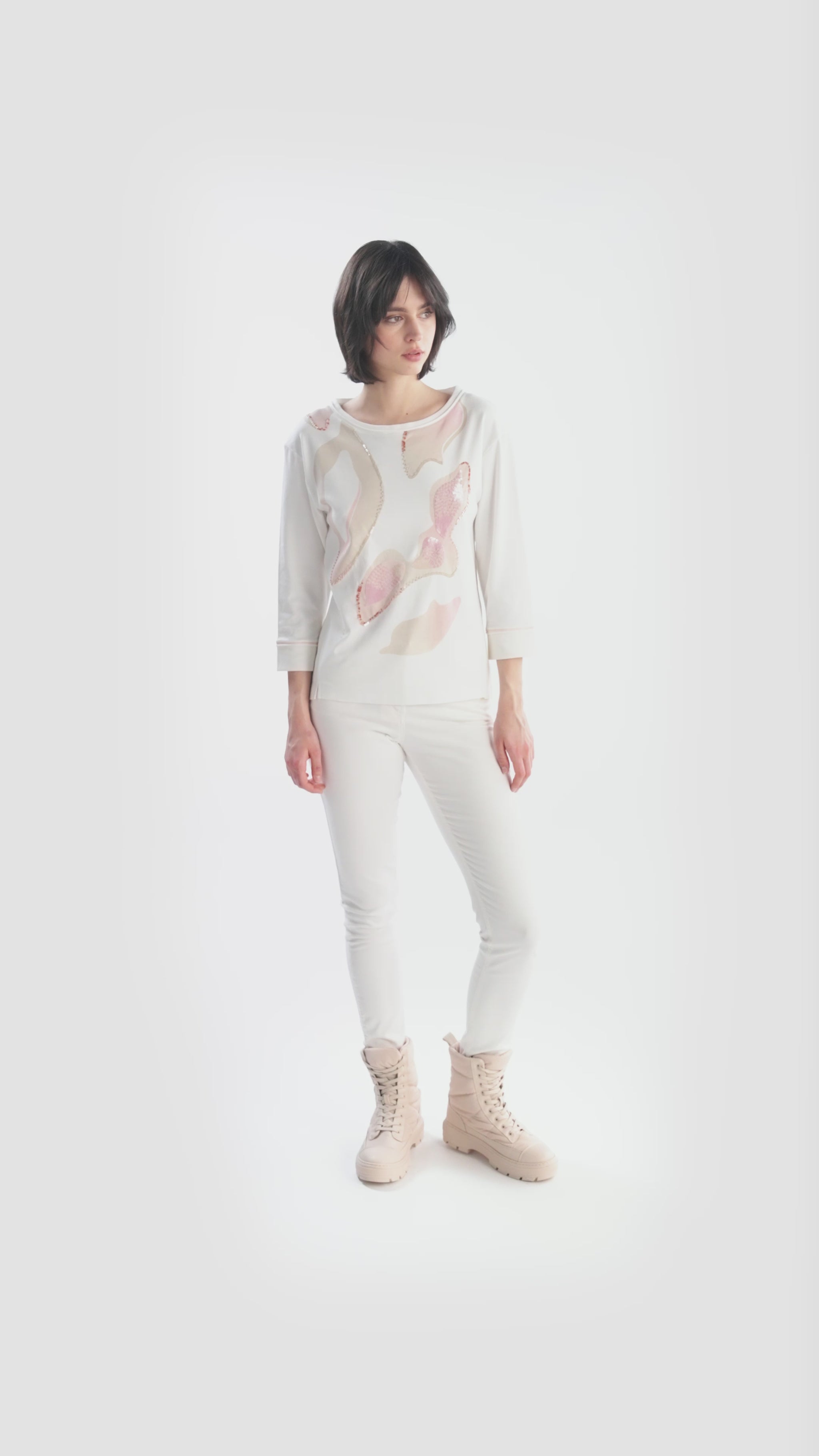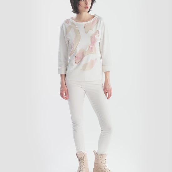 圓領襯衫呈現出令人愉悅的平紋針織品質,結合運動型羅紋面料和 3/4 長度的袖子。稍微向前的側縫以短開衩結束,而正面飾有華麗的柔和色彩刺繡、裝飾性亮片和珍珠。