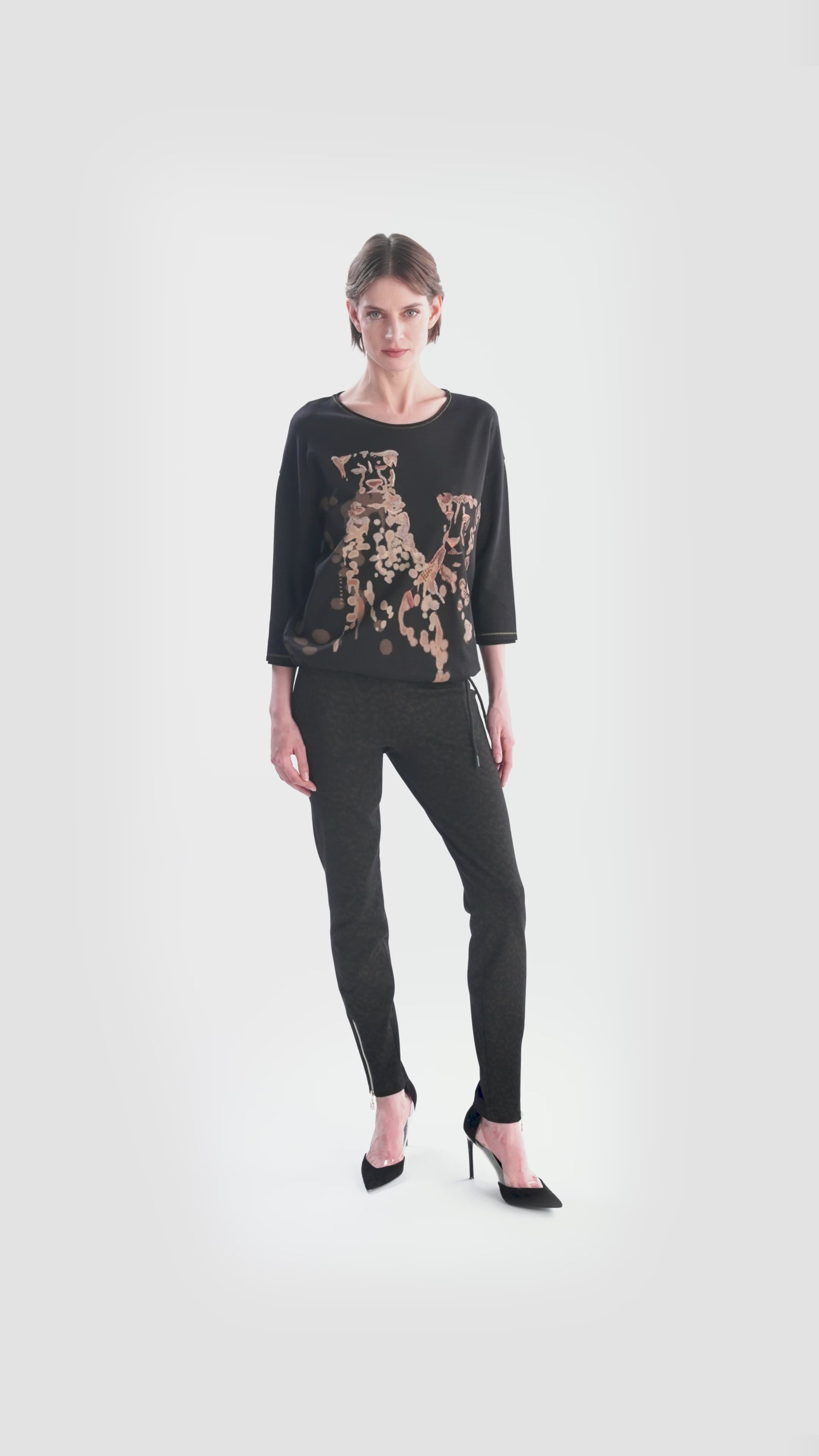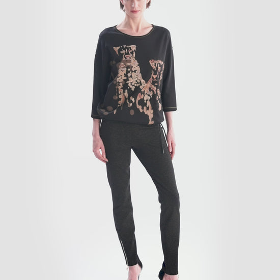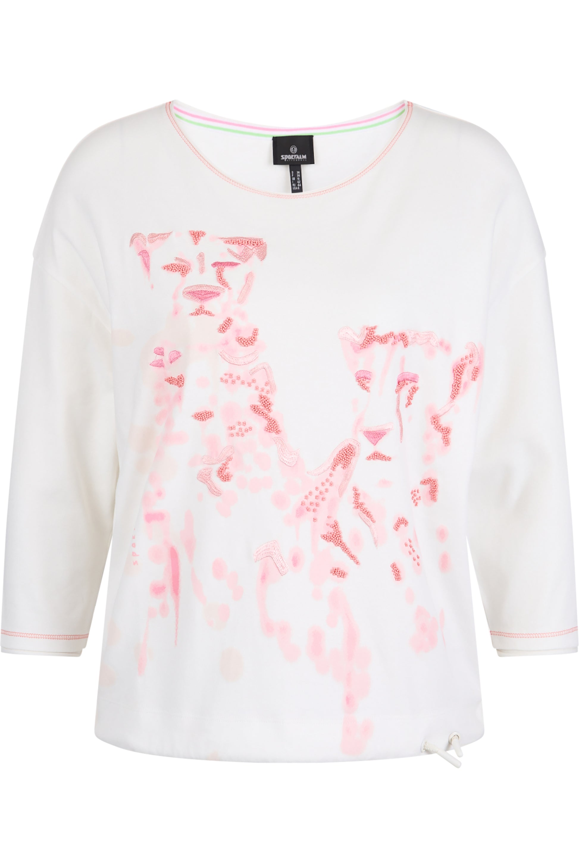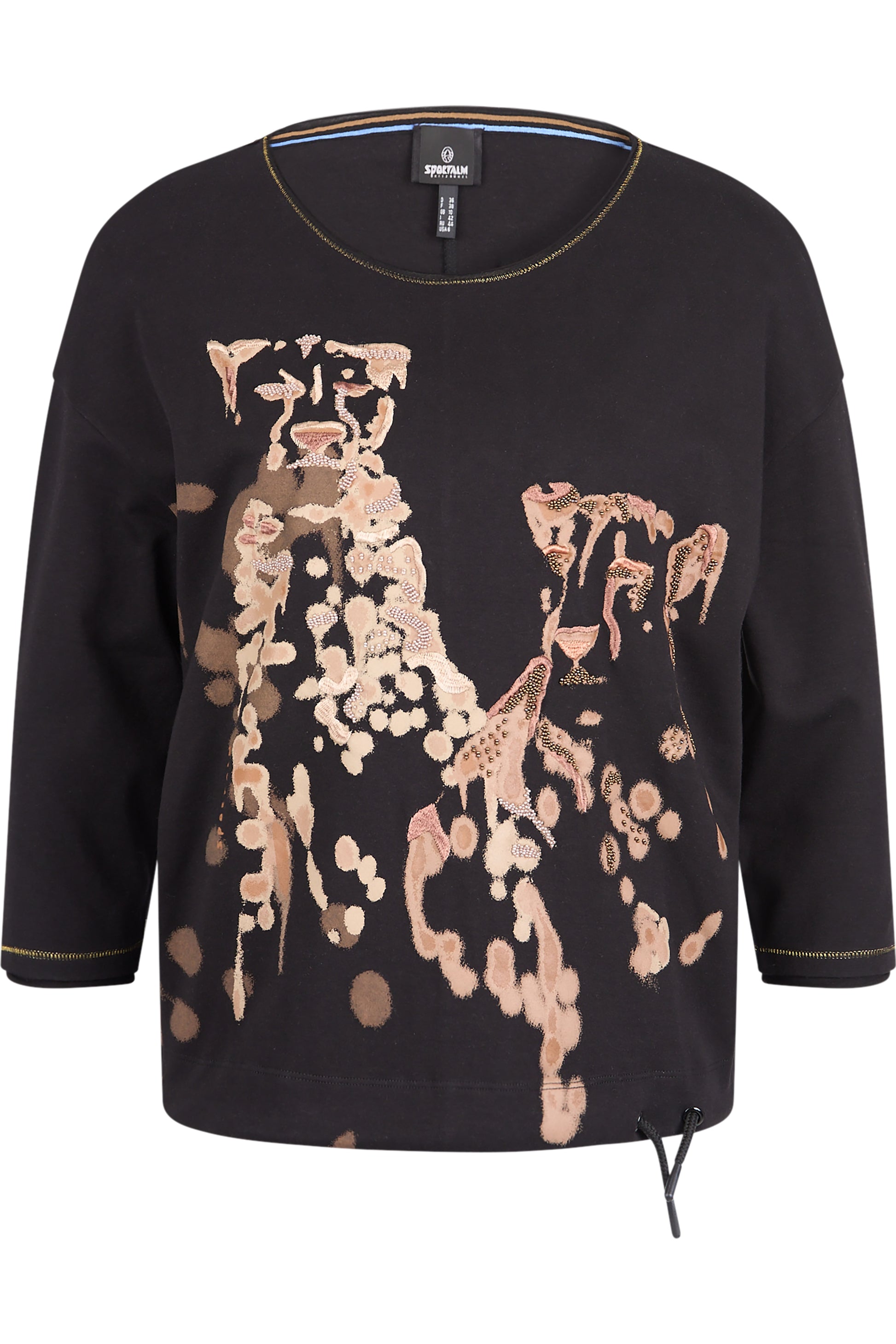 這款棉質平紋針織襯衫採用船領和開放式捲邊設計。下擺配有同色抽繩,可單獨調整寬度。這件襯衫的亮點是正面的柔和豹紋印花,配上裝飾性刺繡和亮片裝飾。
