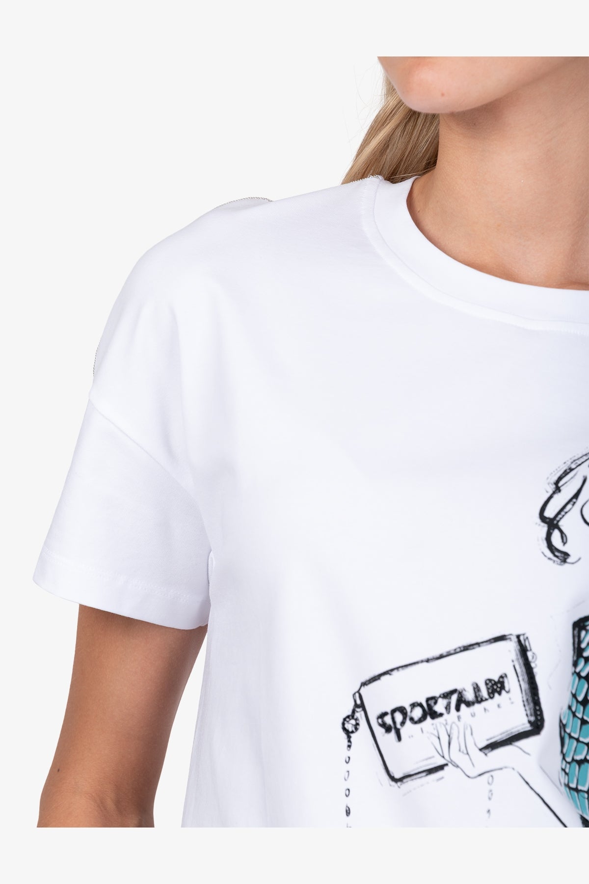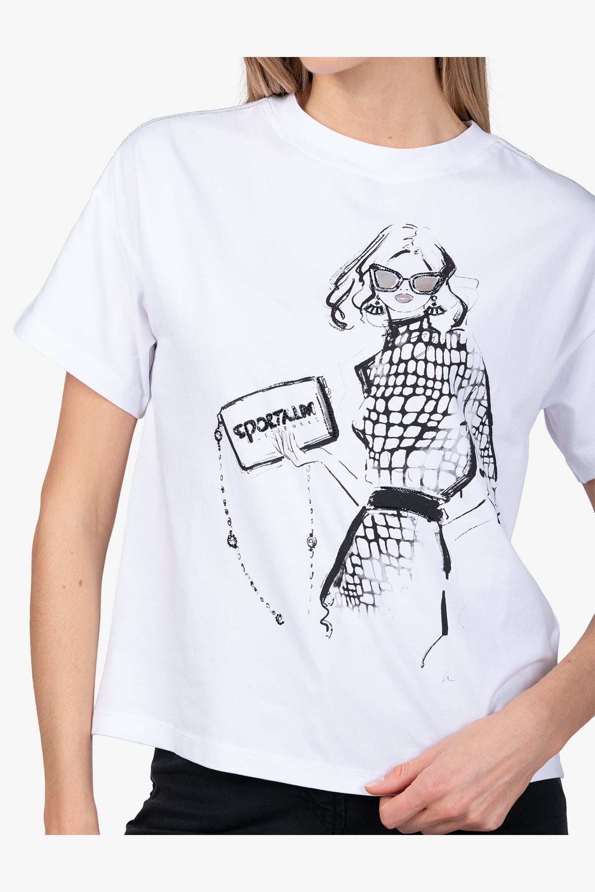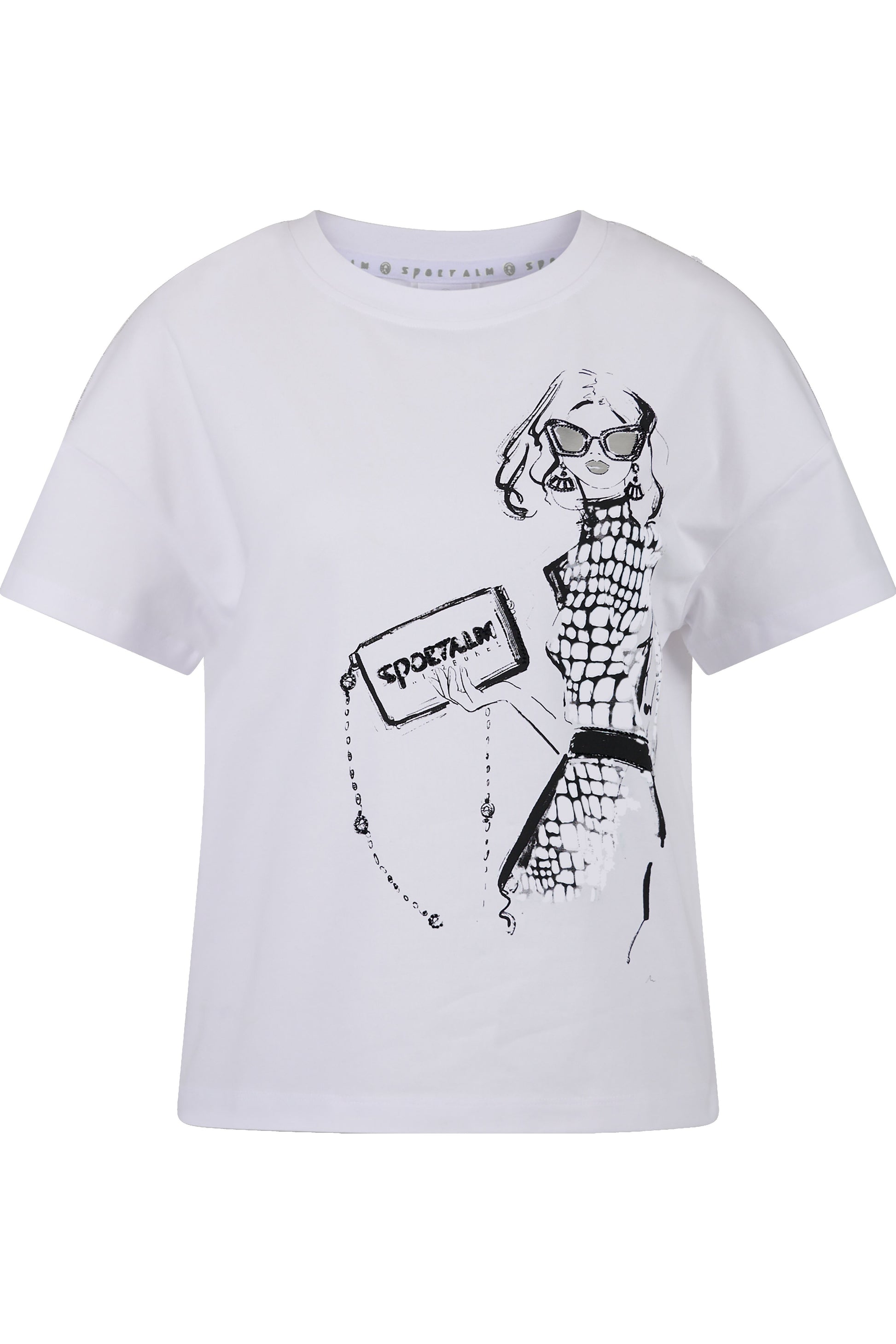 亮點:正面印有時尚插畫,飾有金箔印花和水鑽,肩縫處飾有球鏈,側縫處有小開衩36 碼後長:58.0 厘米