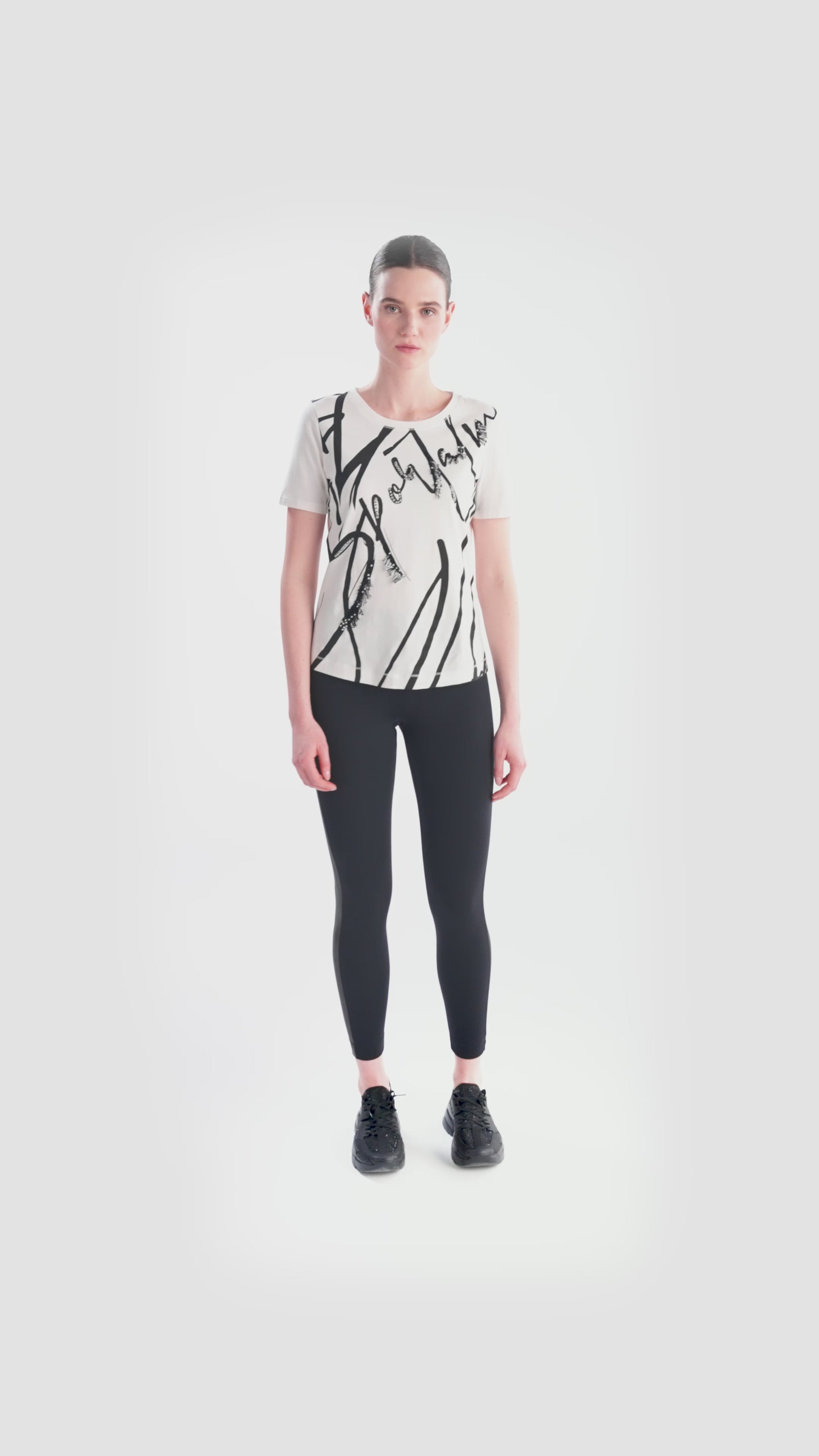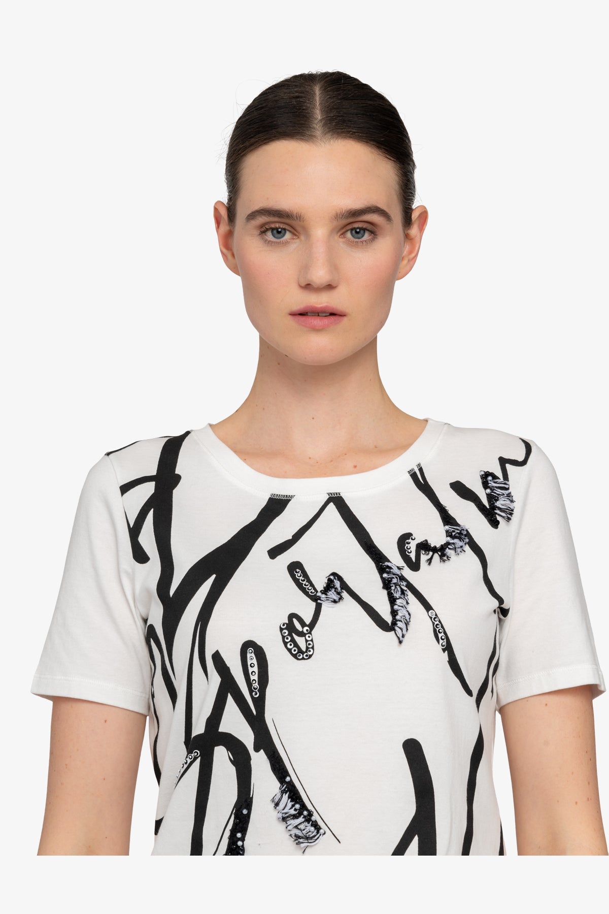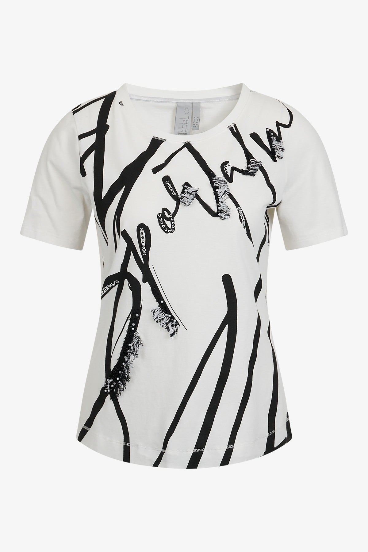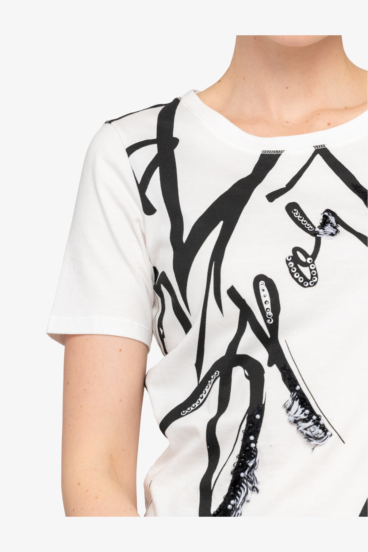 這款襯衫採用柔軟棉質布料製成,採用經典圓領和短袖設計。正面飾有裝飾珠、亮片和流蘇。