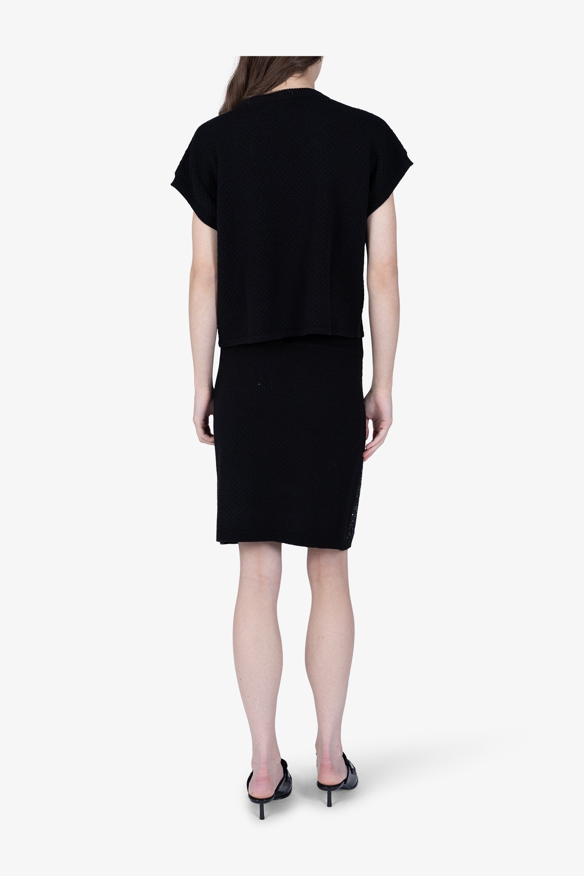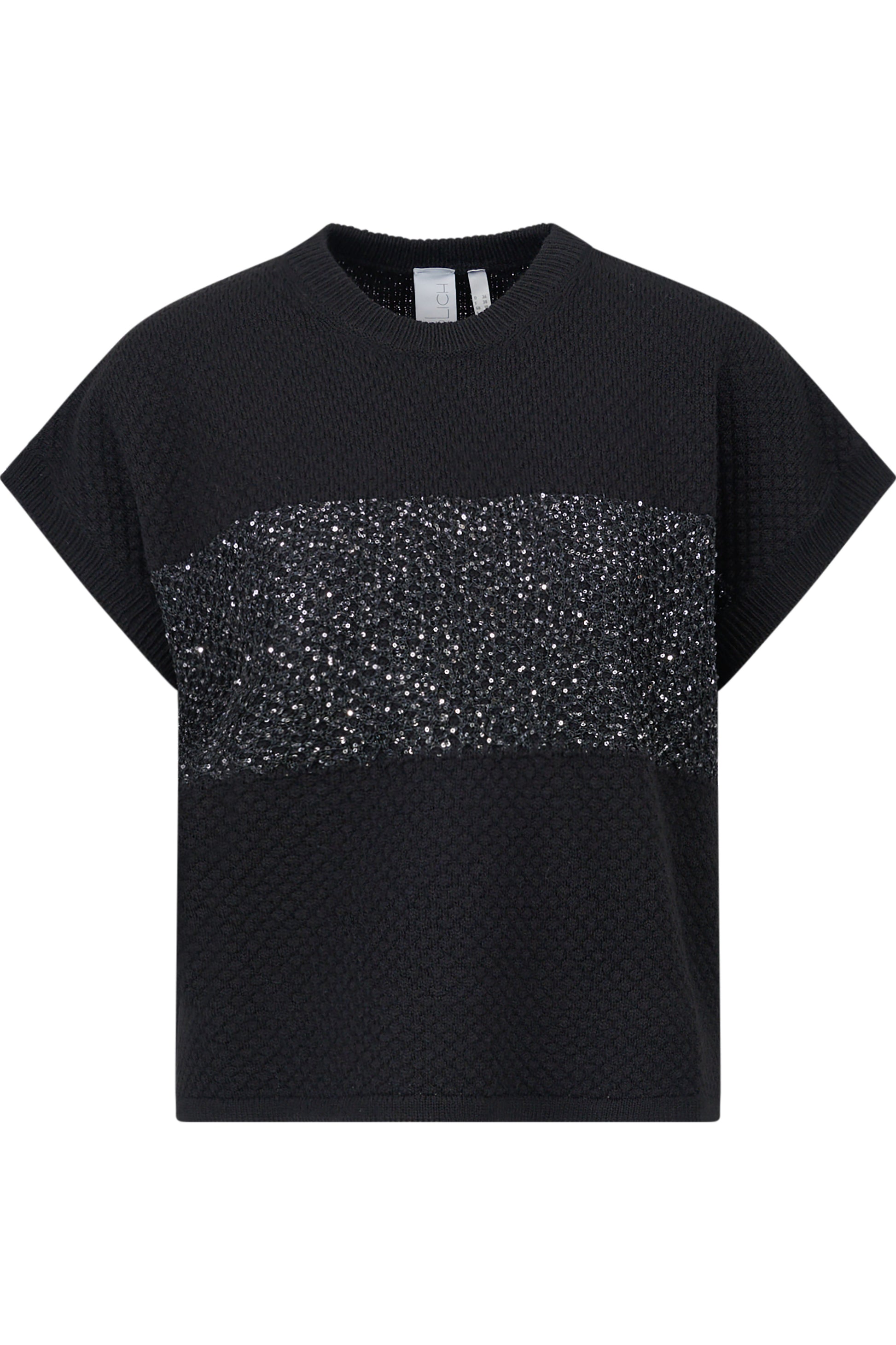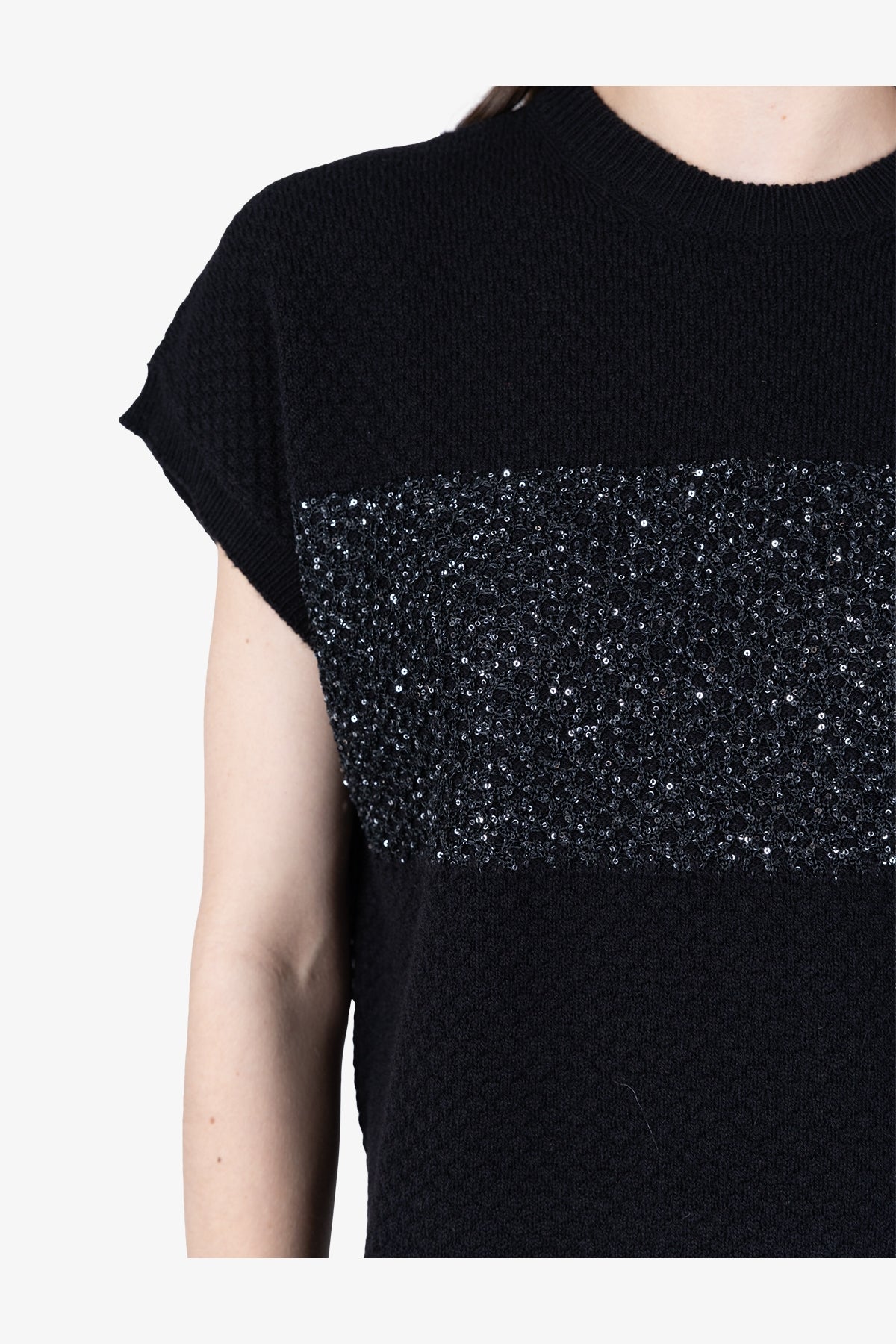 這款優雅套頭衫以其時尚的方形輪廓和前襟閃亮的亮片裝飾令人印象深刻。是特殊場合的時尚亮點!