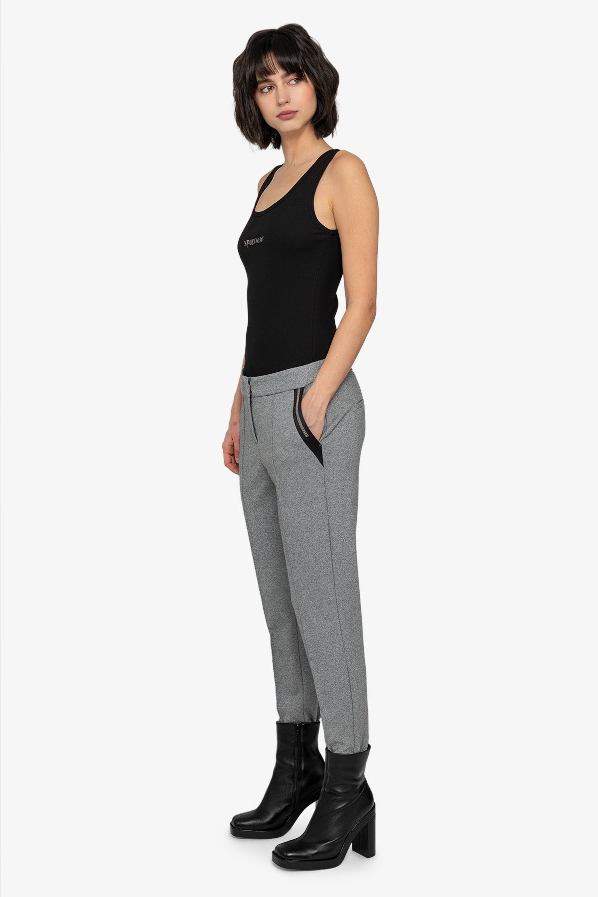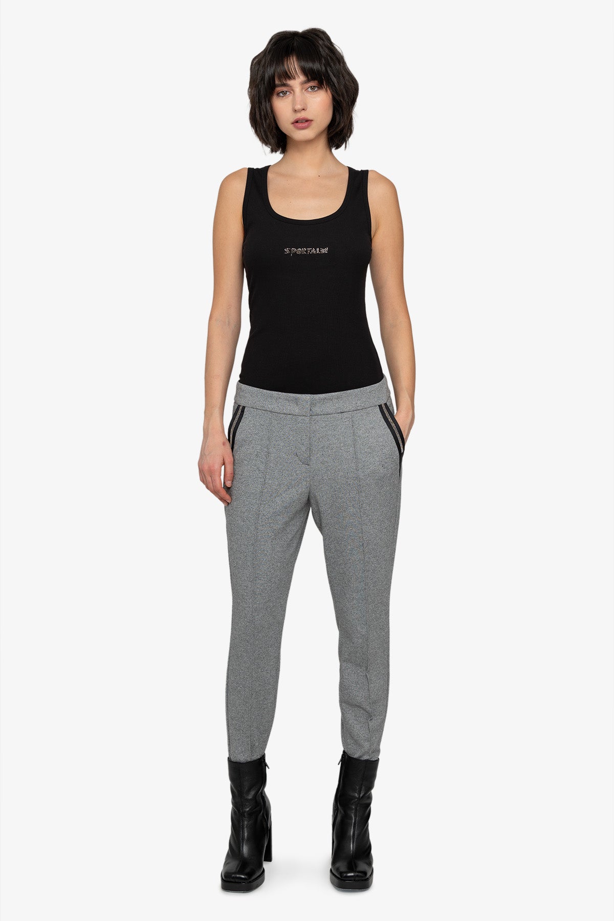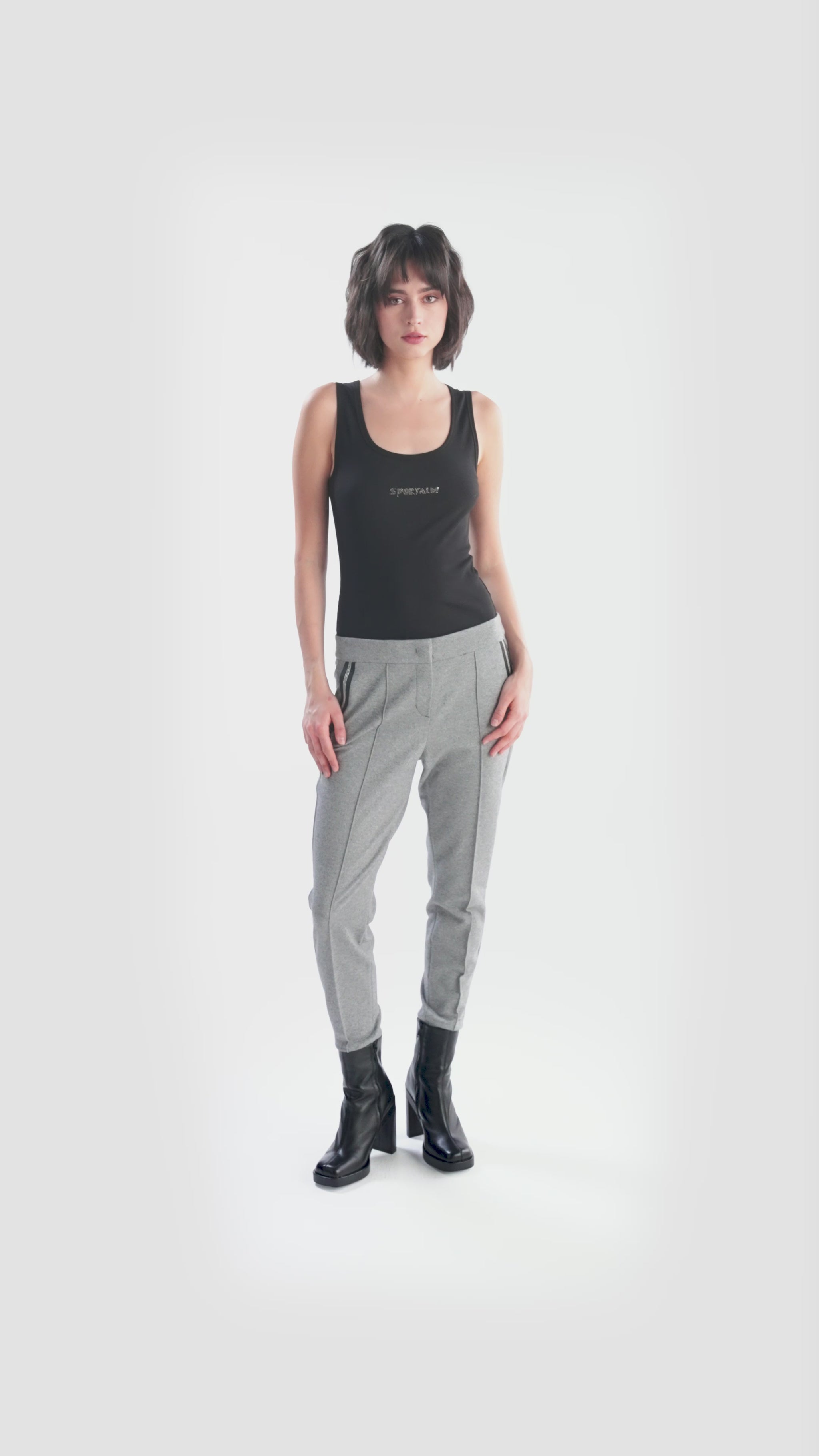 這款法蘭絨平紋針織慢跑褲時尚運動,是打造休閒造型的百搭服裝。附有拉鍊和盲帶鉤,方便穿脫。側袋飾有羅緞絲帶和鏈條細節,為褲子帶來現代氣息。