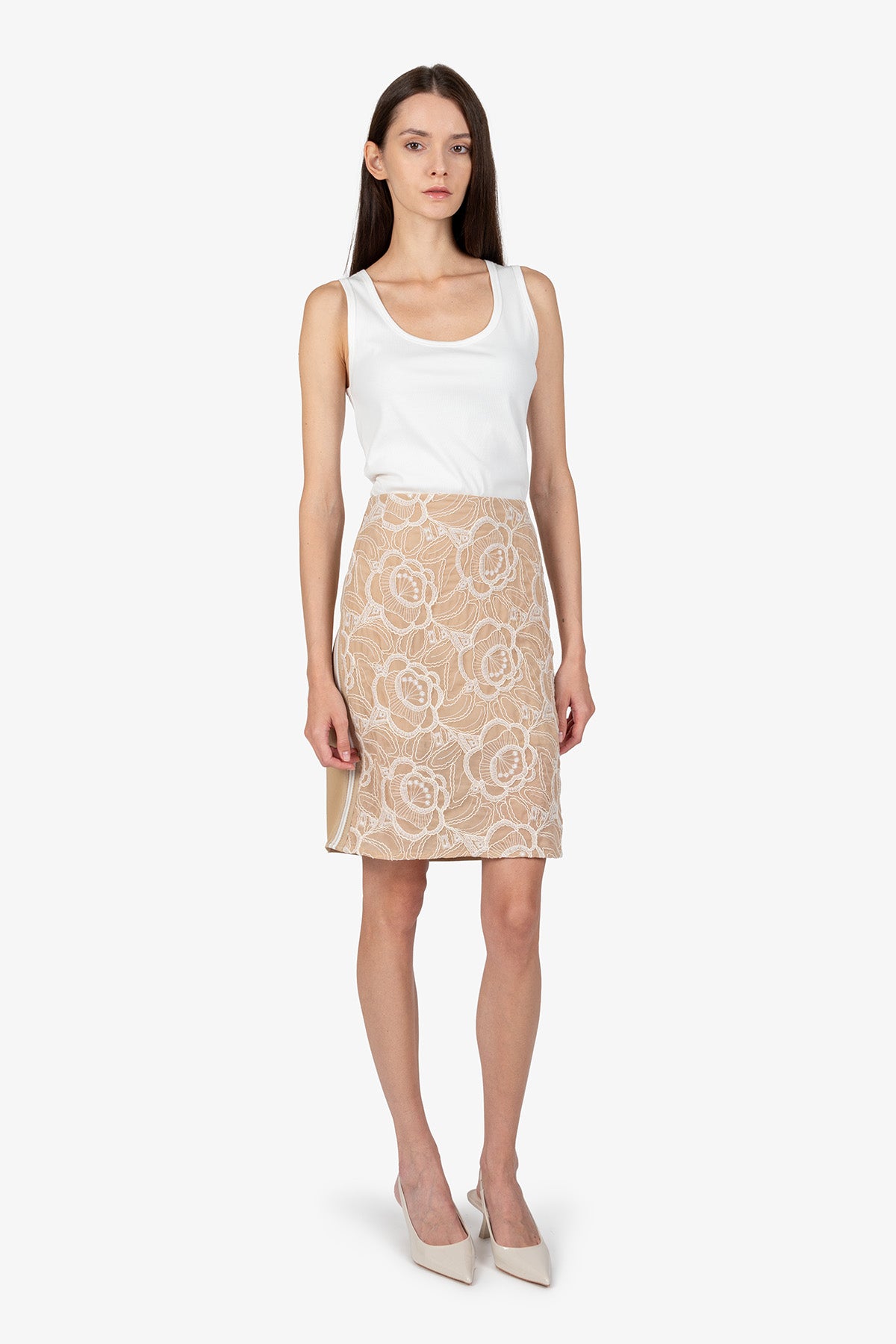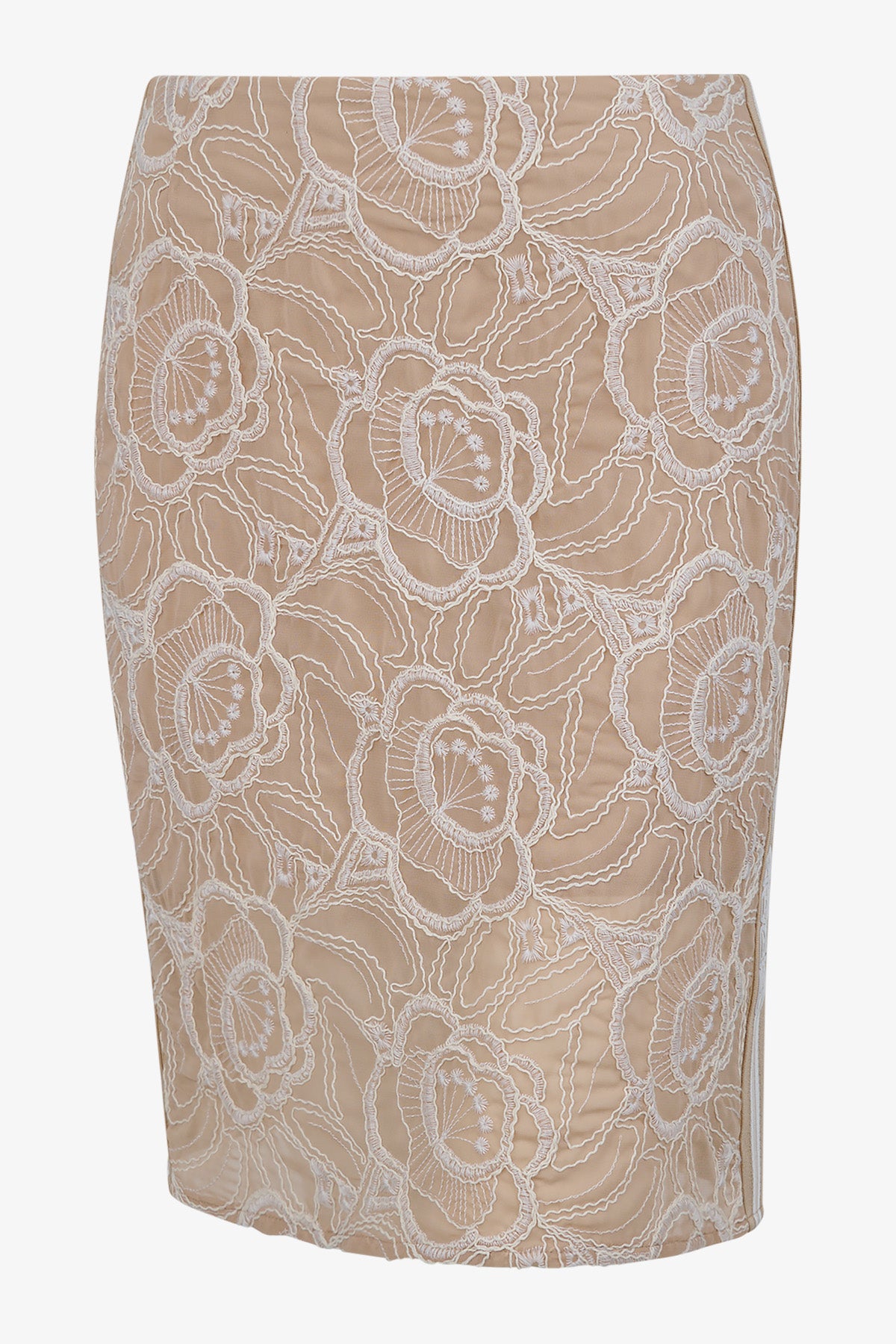 這款優雅的裙子正面飾有刺繡蕾絲,側縫處飾有運動針織帶,令人印象深刻。它將優雅的細節與現代風格融為一體,為您的服裝增添時尚氣息。