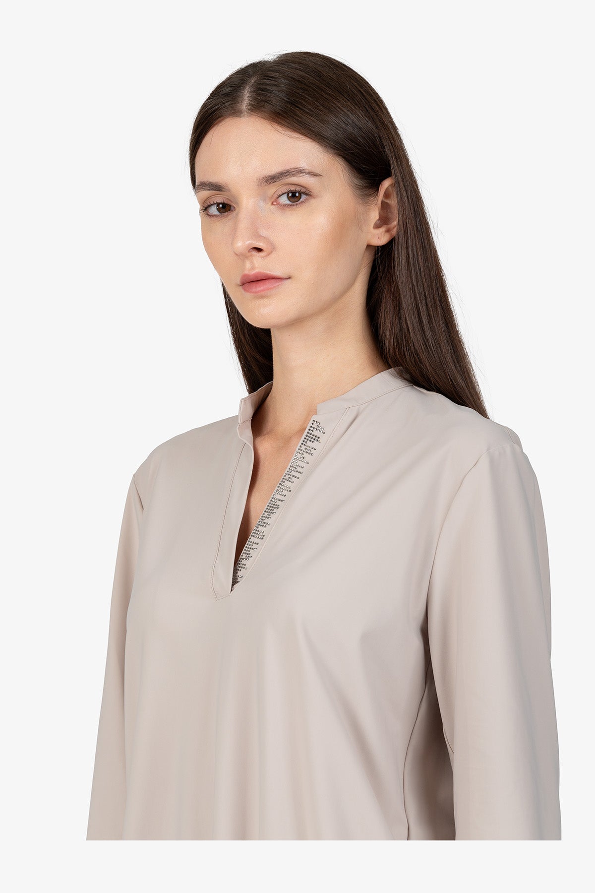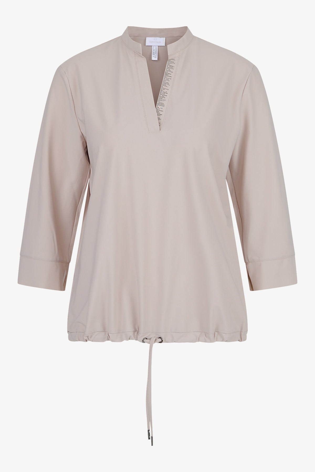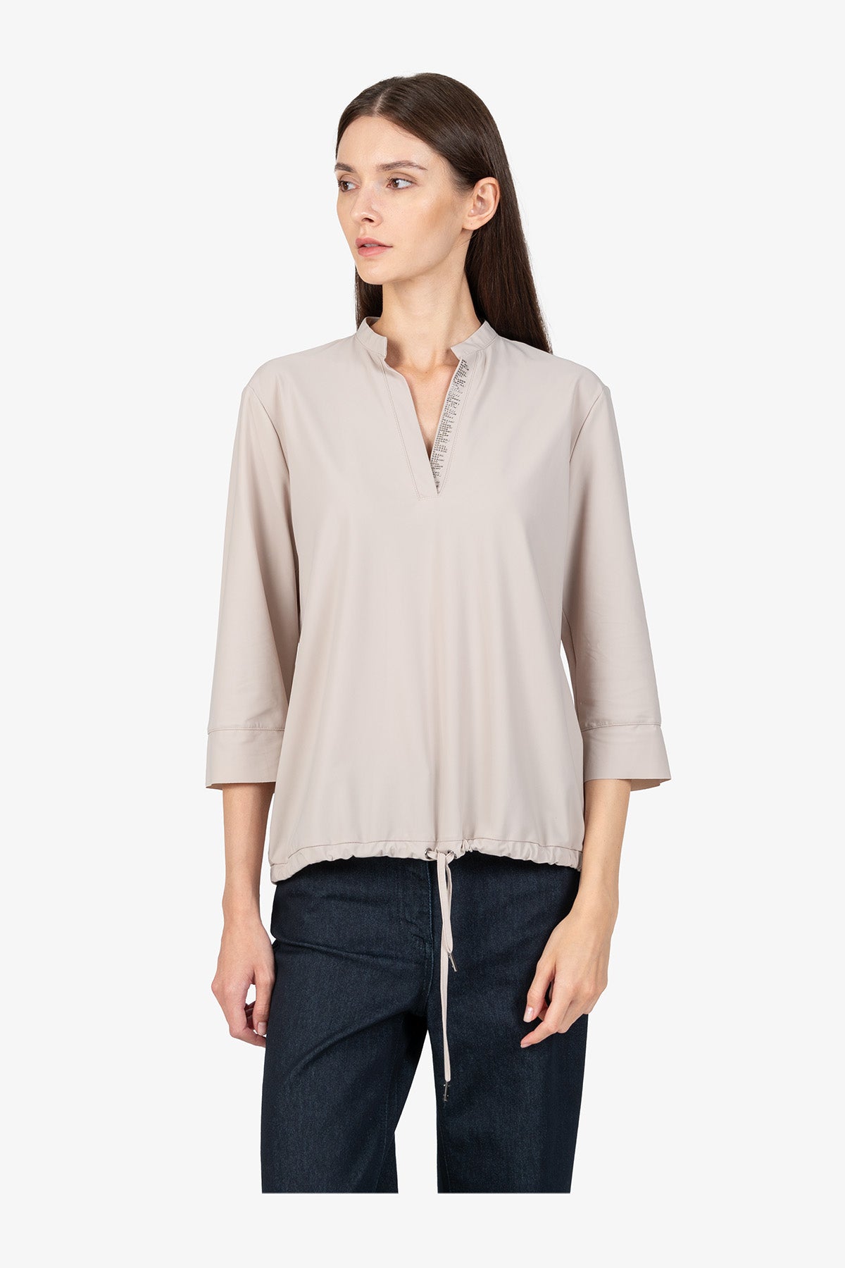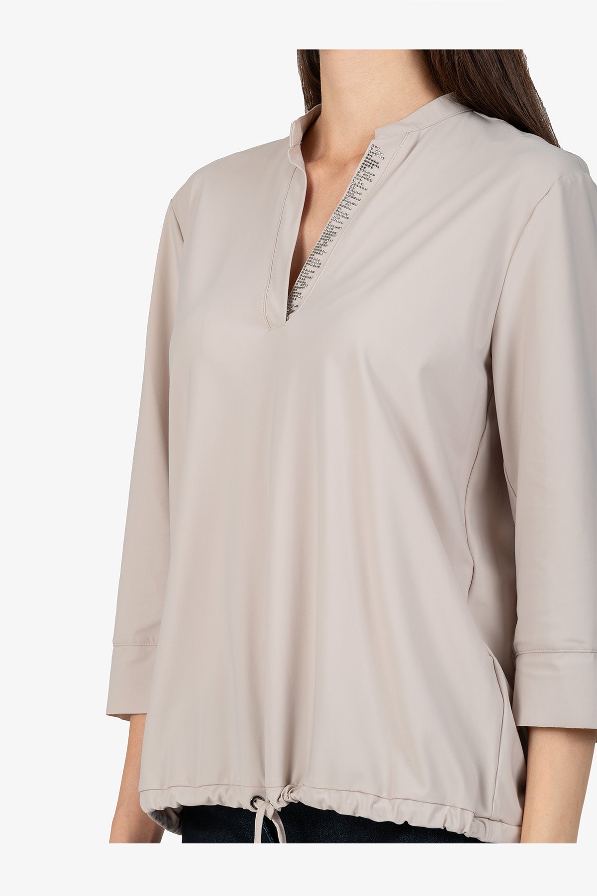 亮點:V領處別緻的水鑽細節、下擺處的隧道可調節寬度、袖子下擺的開邊效果