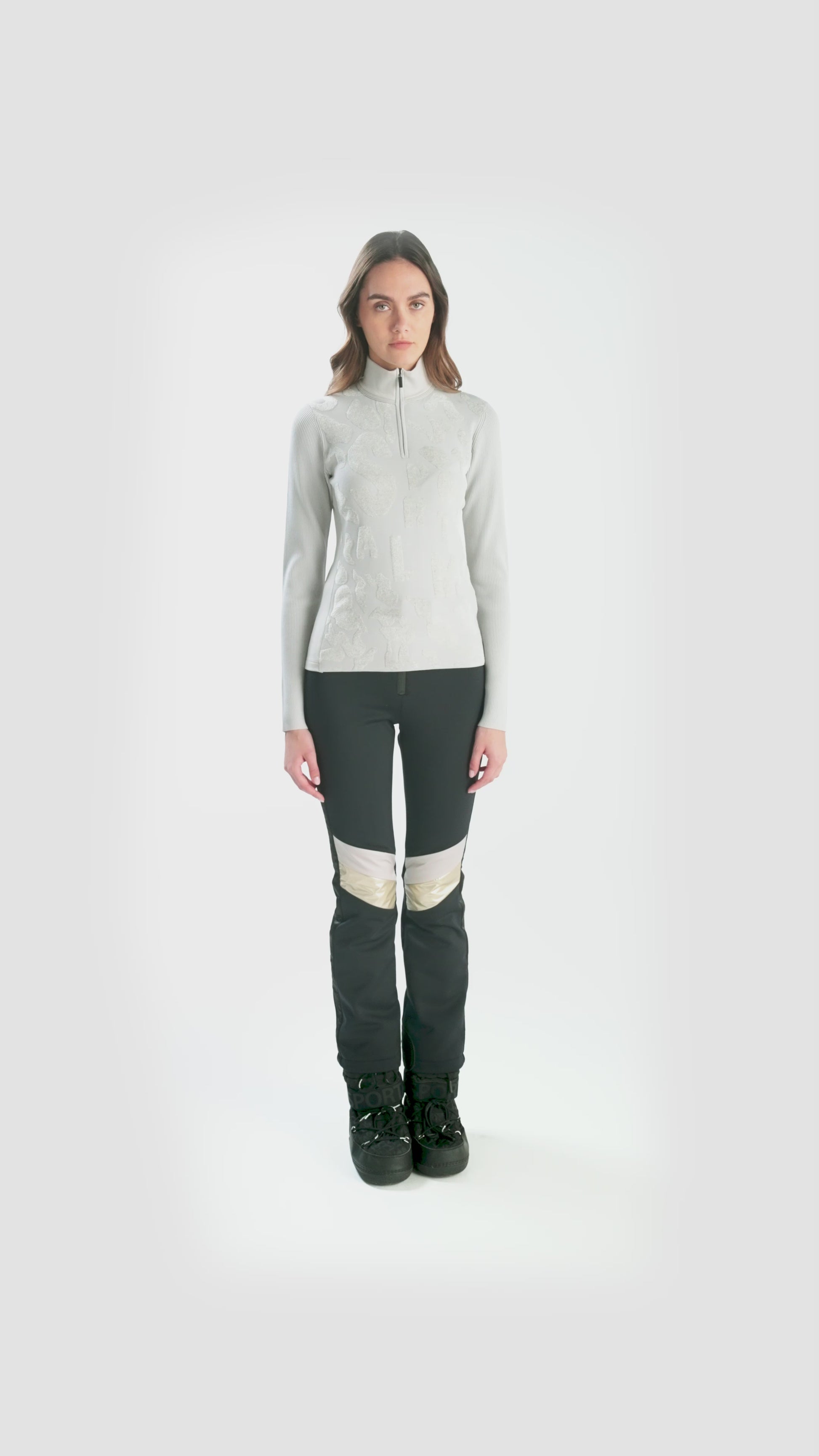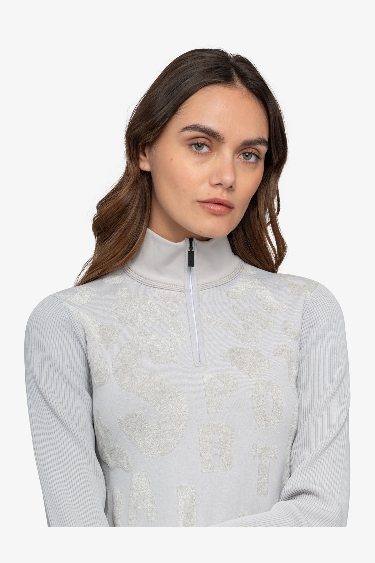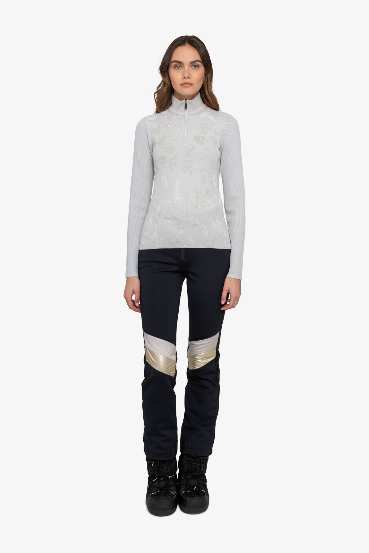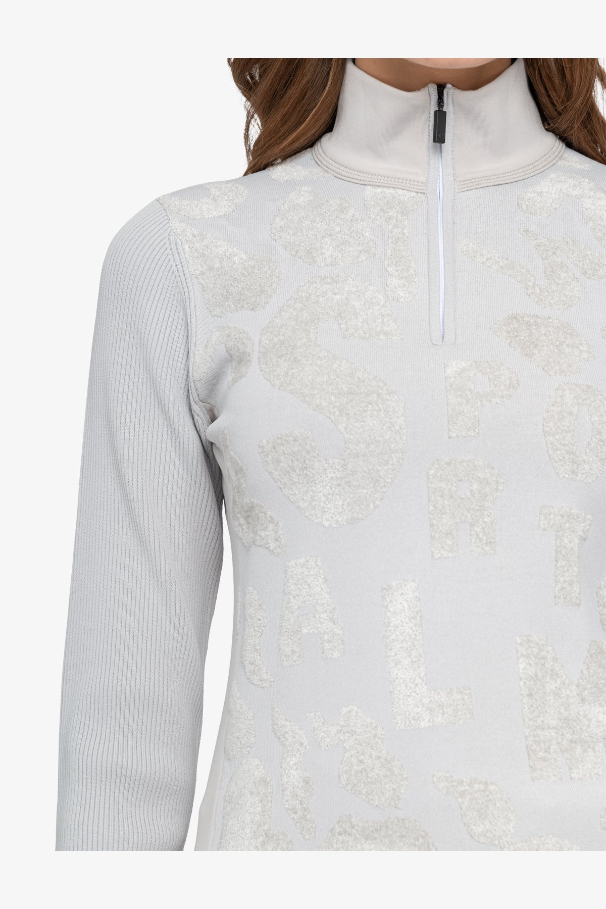 這款毛衣採用剪裁剪裁和立領,配有精美拉鍊。正面飾有採用特殊高低技術的豹紋提花,凸顯大型 Sportalm 字樣。