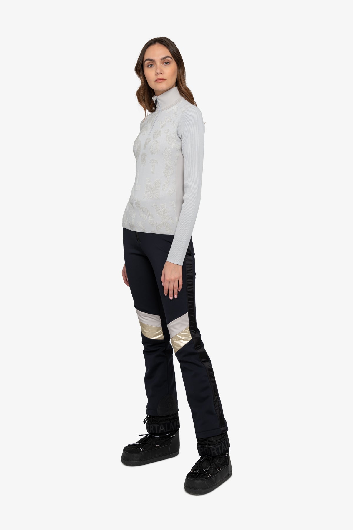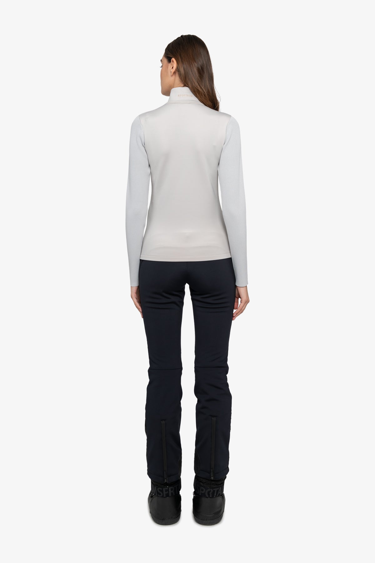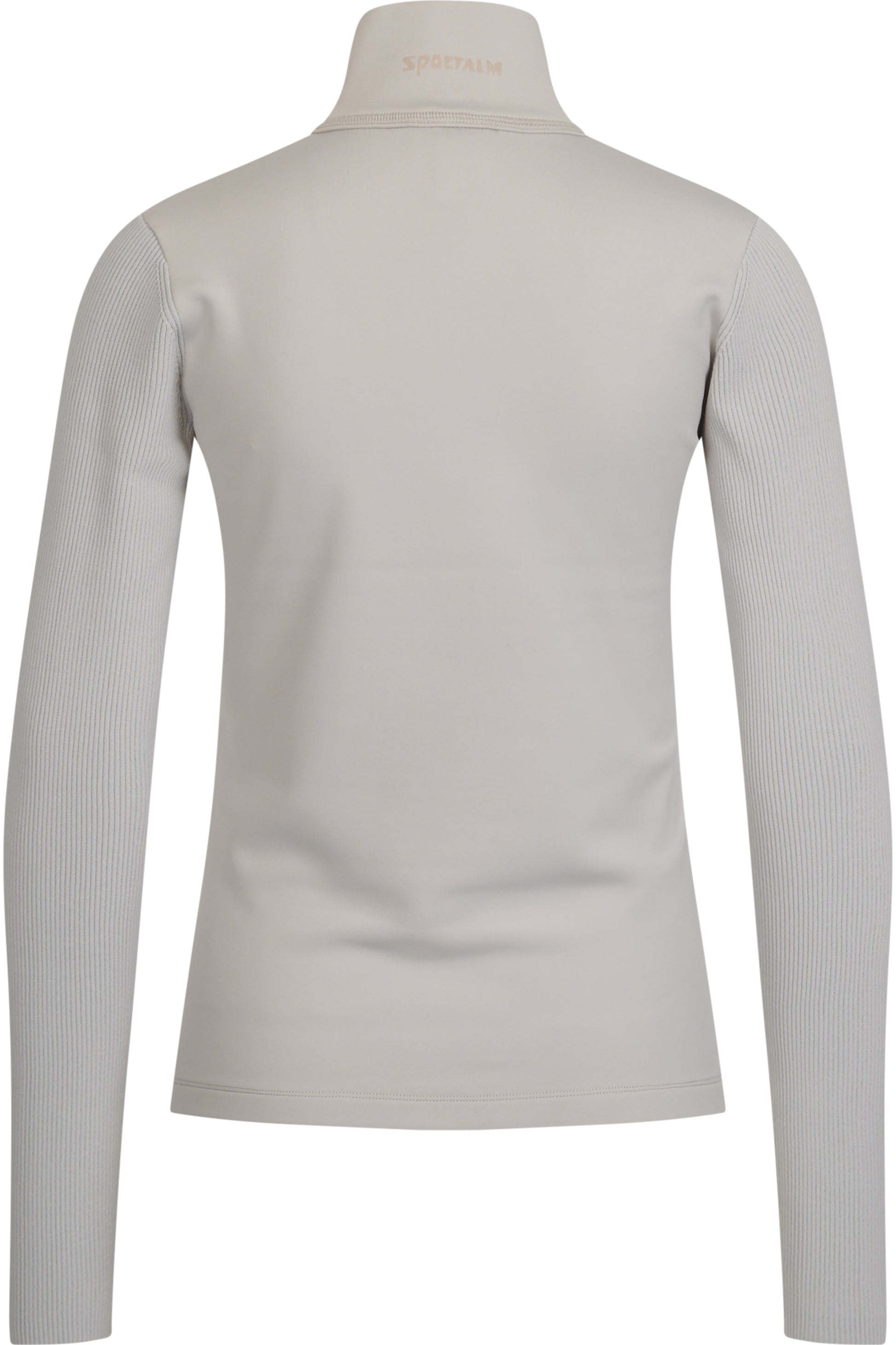 背面採用單色外觀的技術平紋針織布料,袖子採用柔軟針織品質的羅紋布料。科技平紋針織立領背面飾有 Sportalm 字樣轉印圖案。