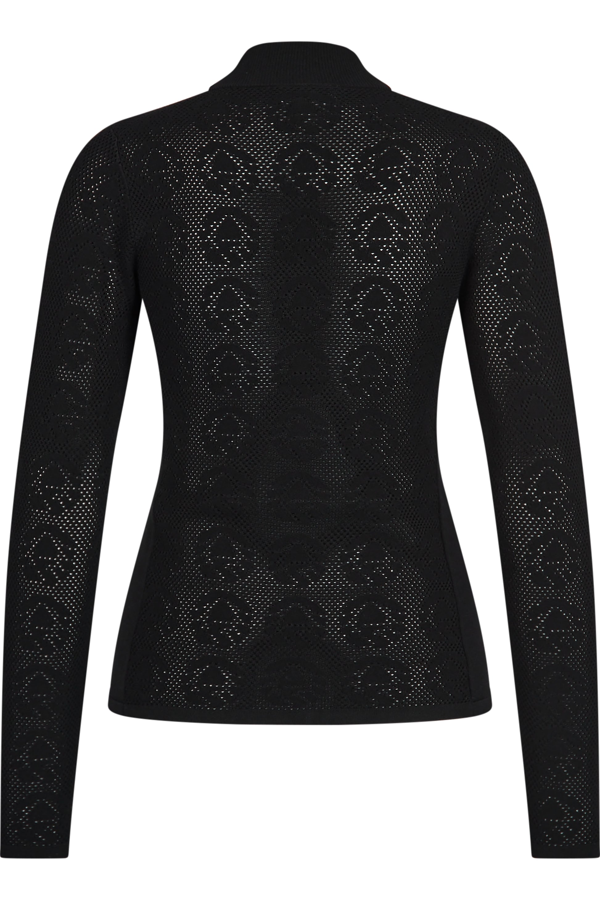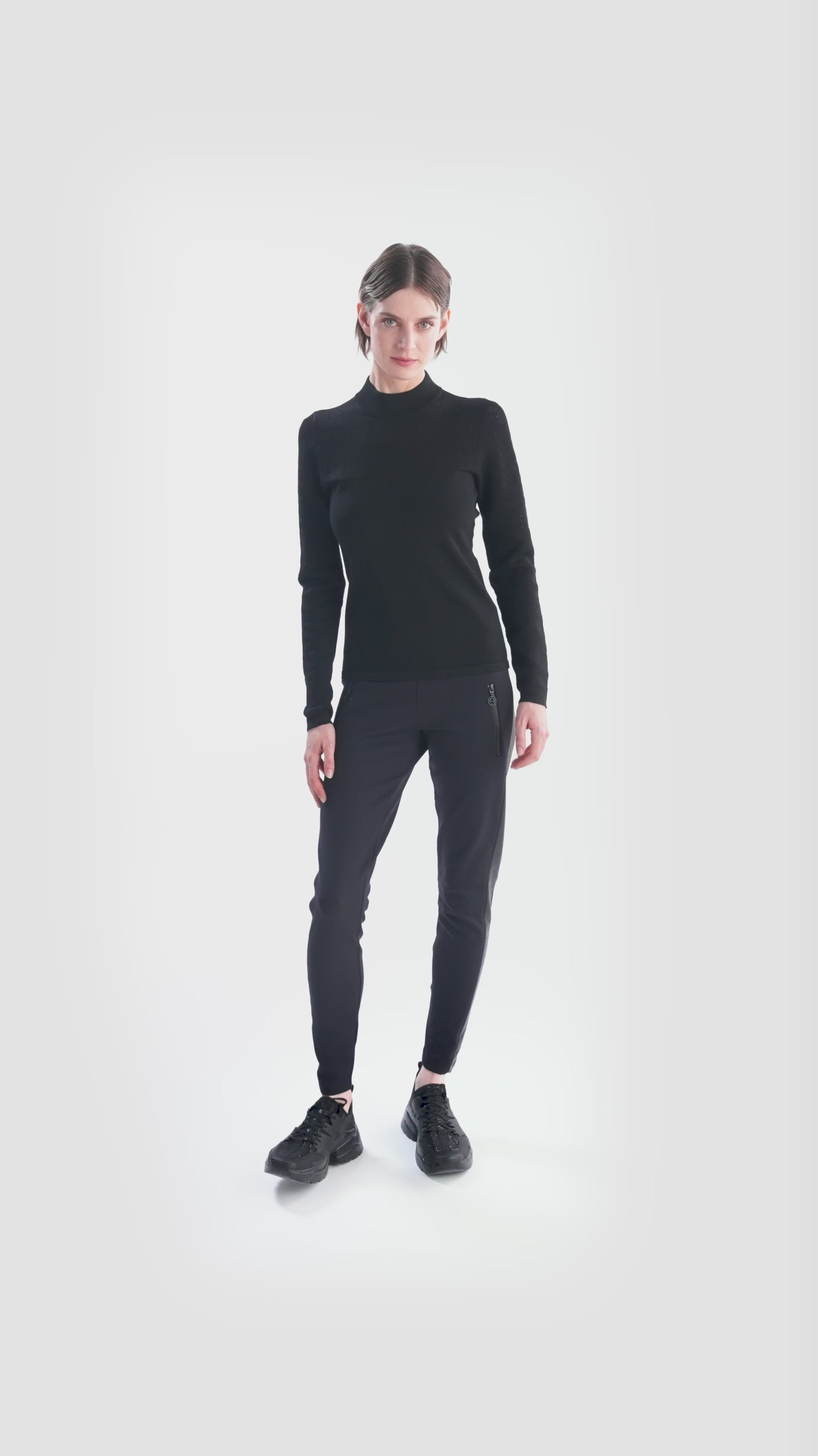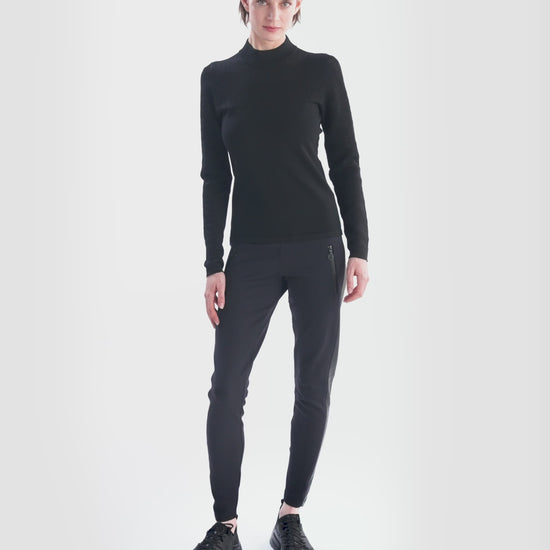 這款立領毛衣採用優質霧面粘膠-彈性纖維混紡面料與閃亮的粘膠-彈性纖維混紡面料製成。前部至胸部以上的部分採用平滑的右側針織,而側縫則巧妙地放置在背面。