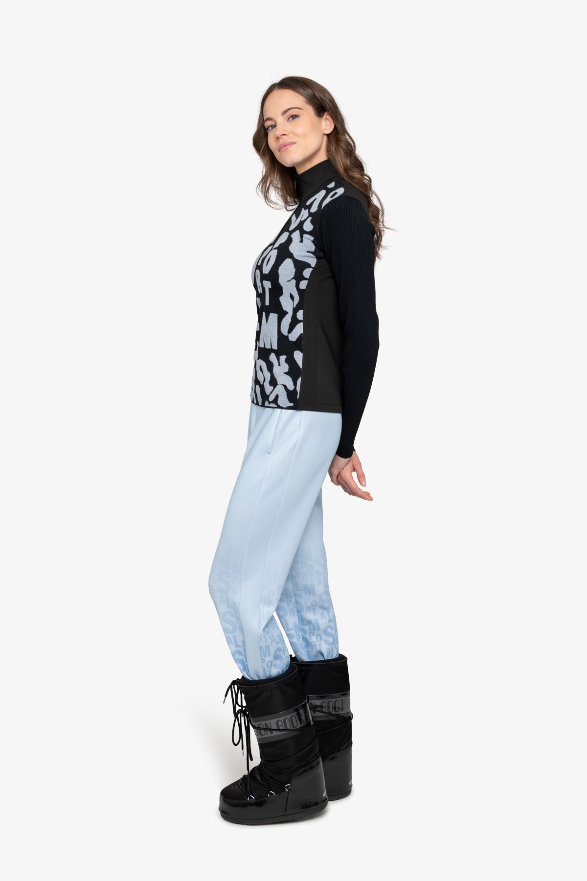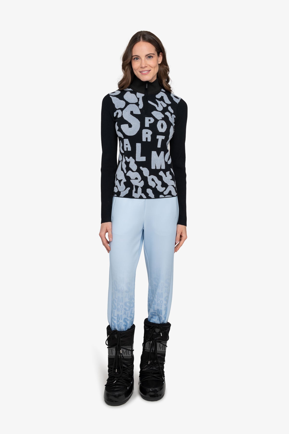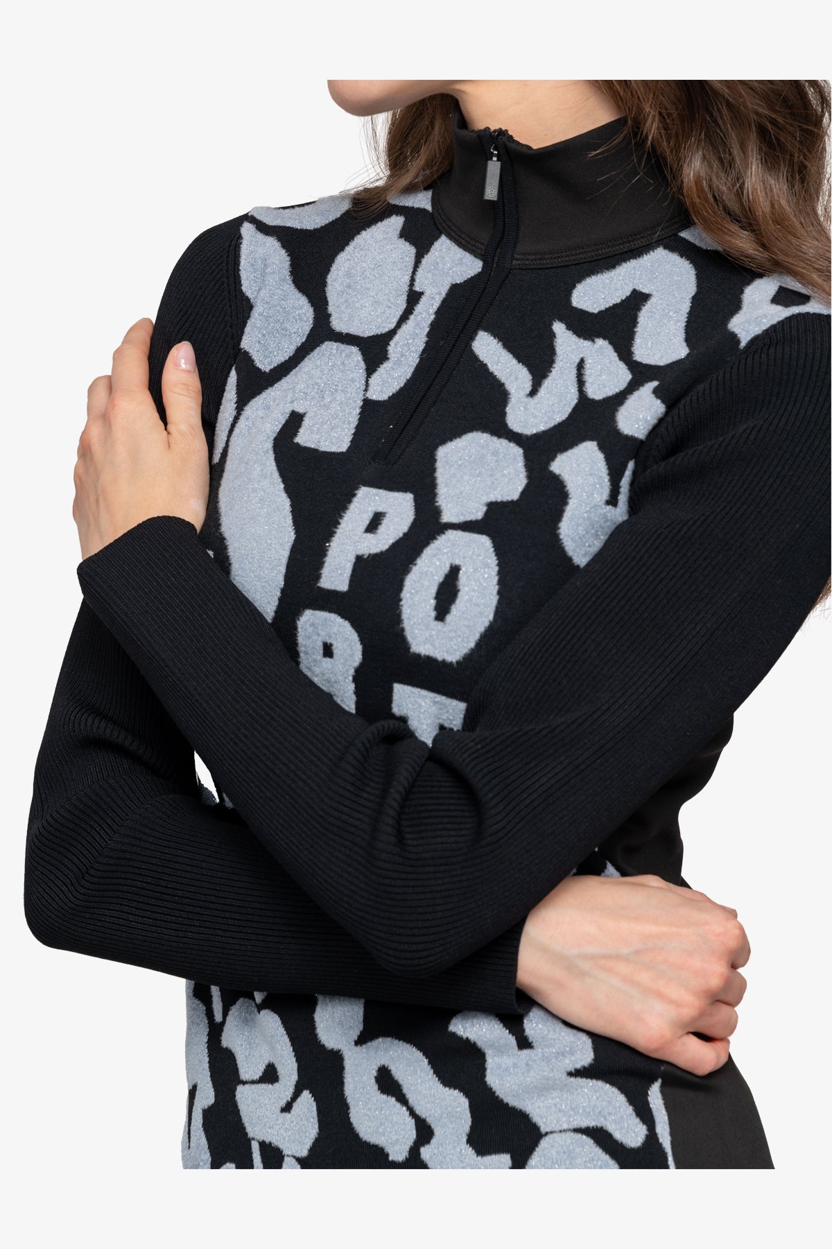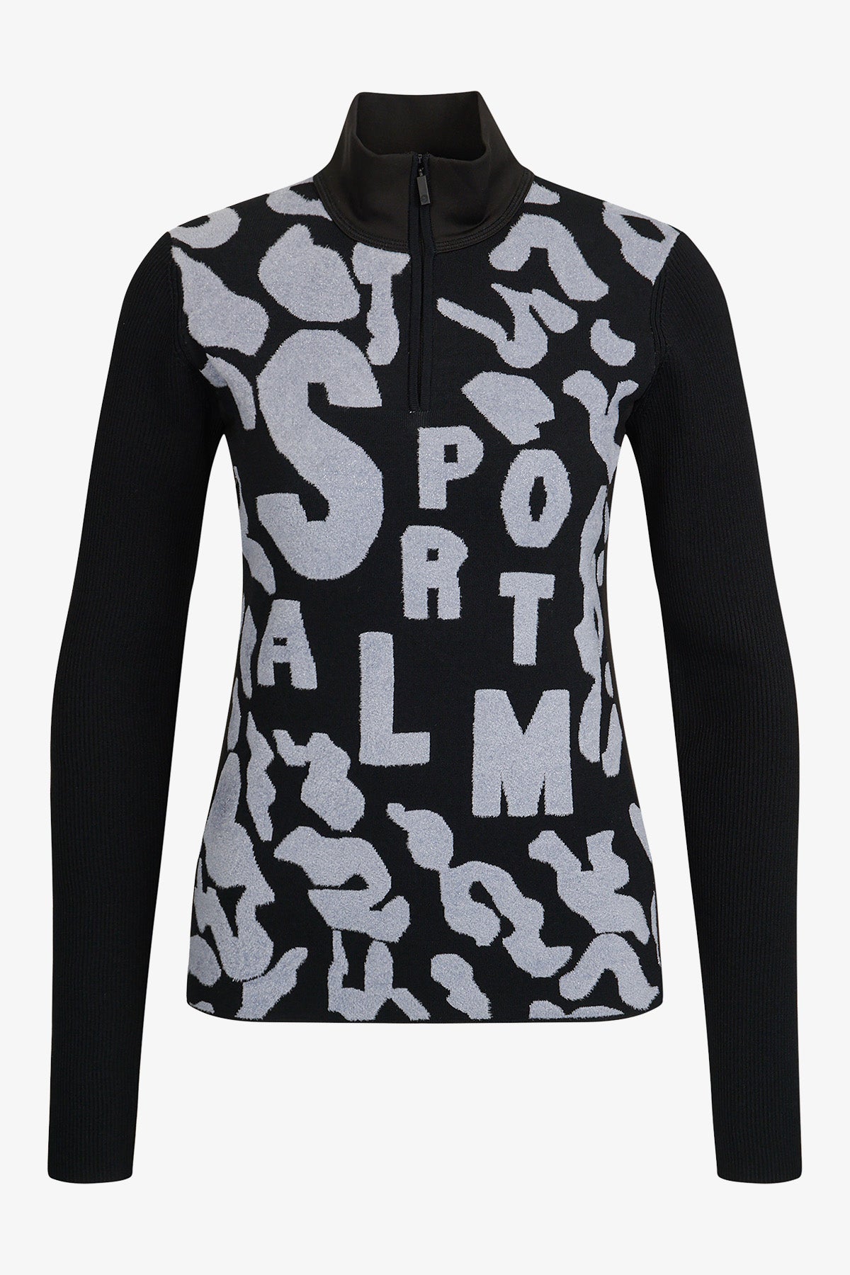 這款毛衣採用剪裁剪裁和立領,配有精美拉鍊。正面飾有採用特殊高低技術的豹紋提花,凸顯大型 Sportalm 字樣。