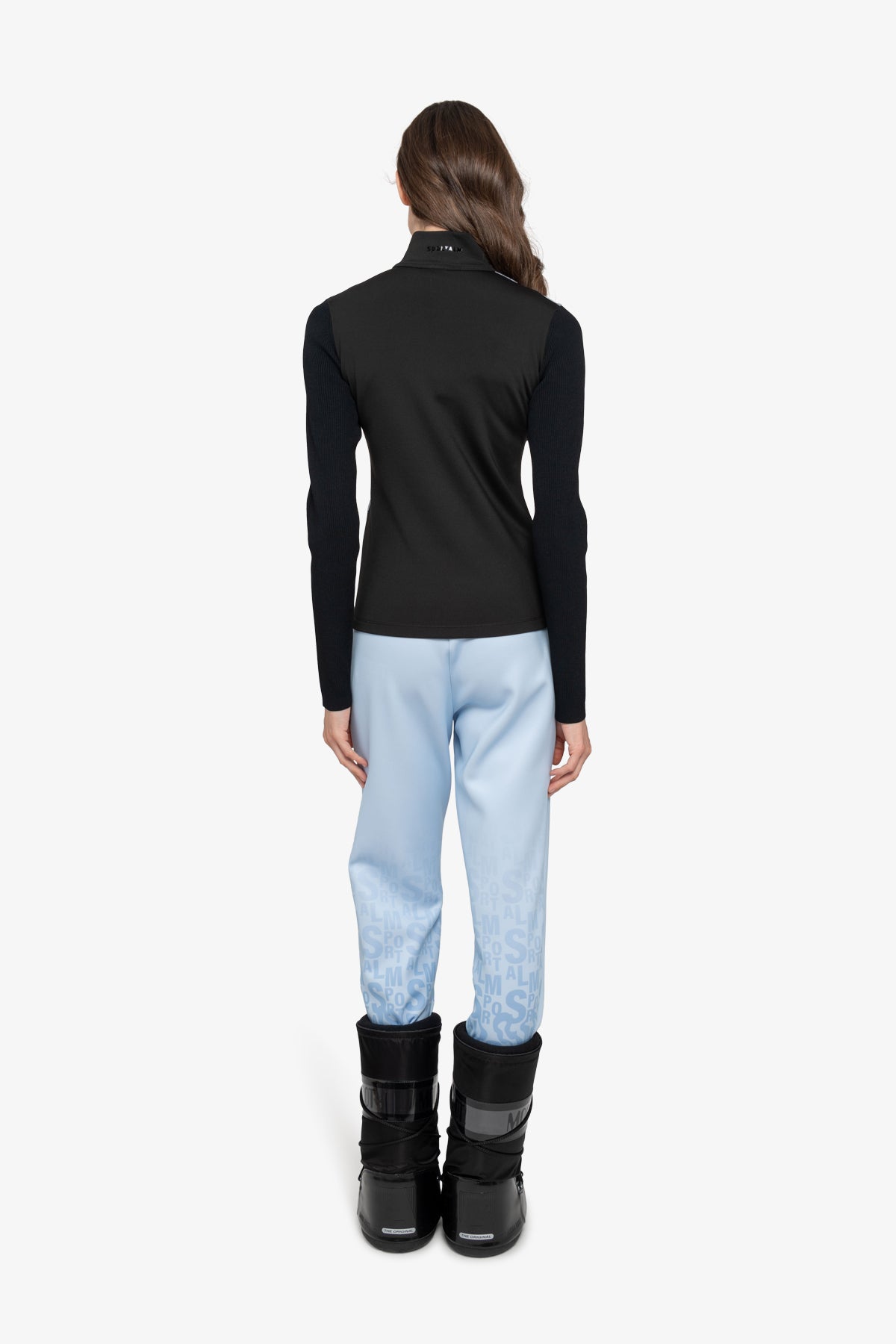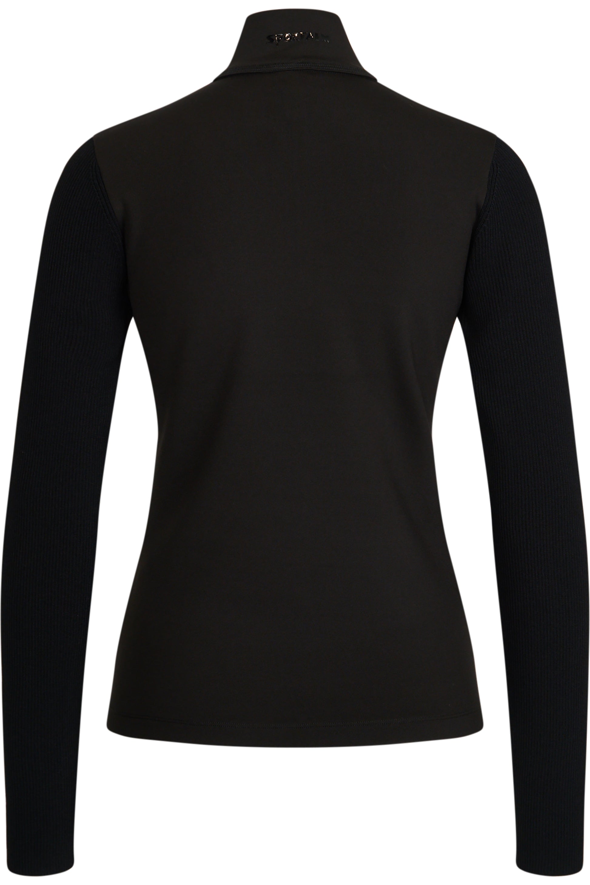 背面採用單色外觀的技術平紋針織布料,袖子採用柔軟針織品質的羅紋布料。科技平紋針織立領背面飾有 Sportalm 字樣轉印圖案。
