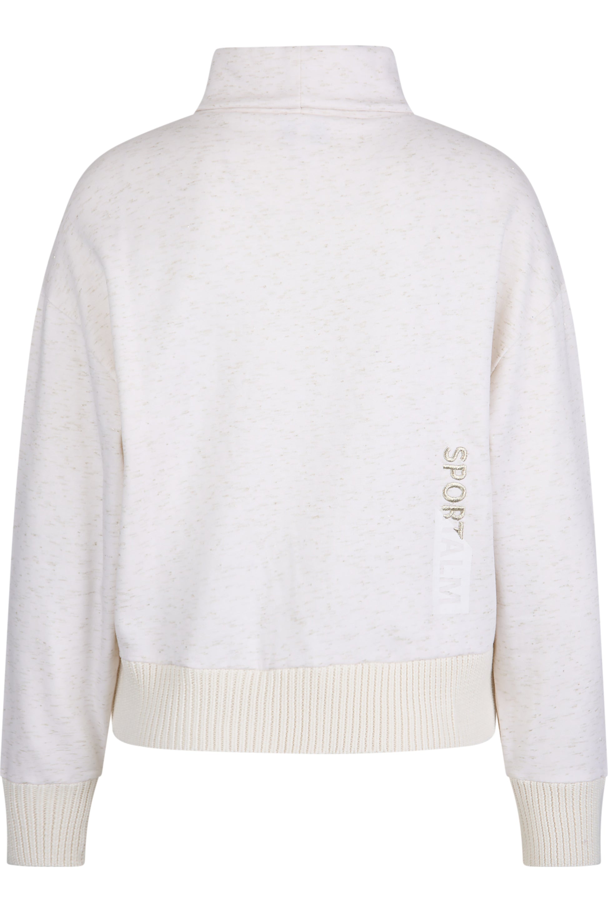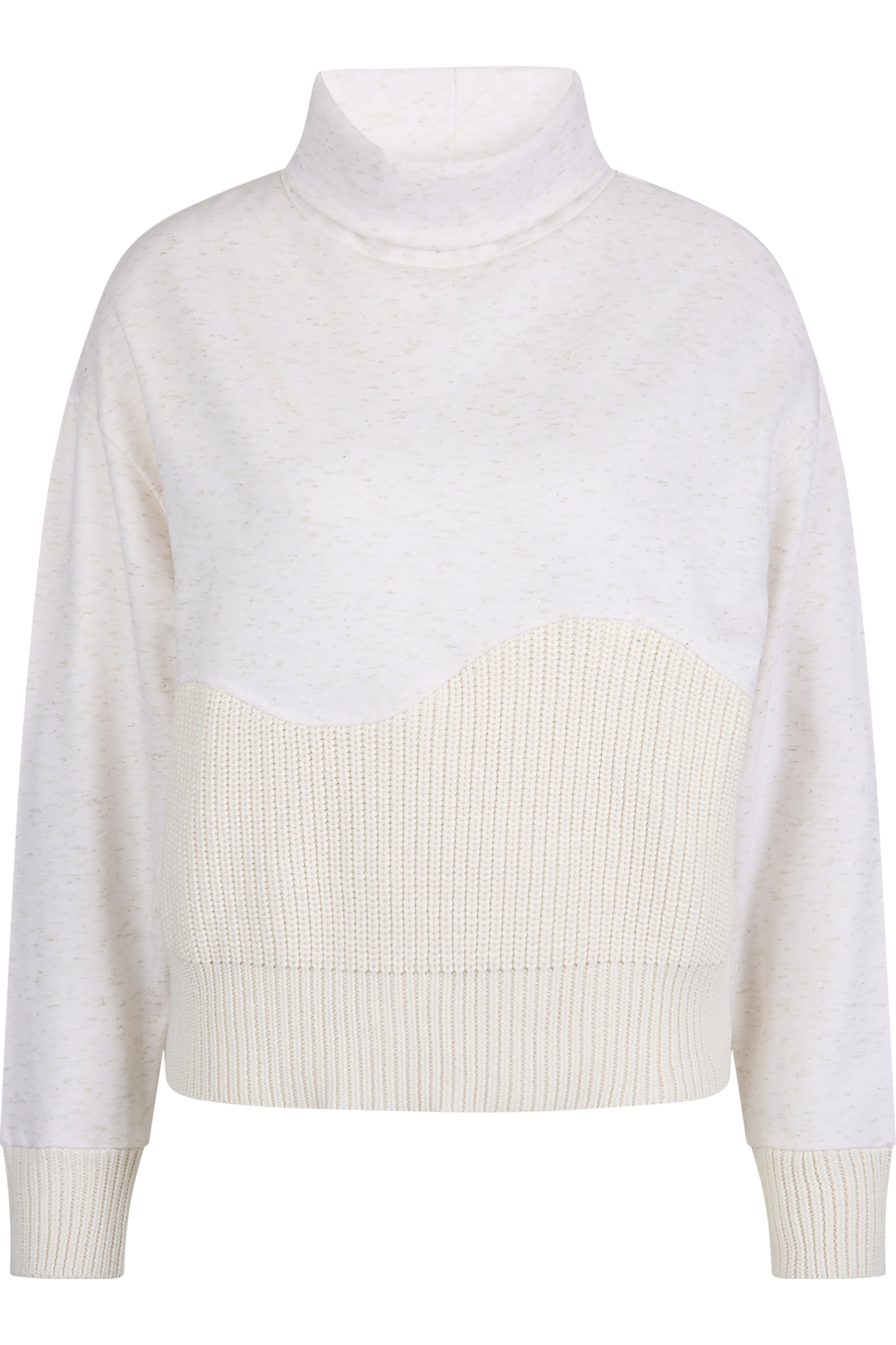 這款立領運動衫呈現舒適的運動衫風格,內部經過粗糙處理,並採用淺金色金屬紗線製成。正面採用針織材質,優雅地結合在一起,背面的袖子和下擺採用針織袖口完成。