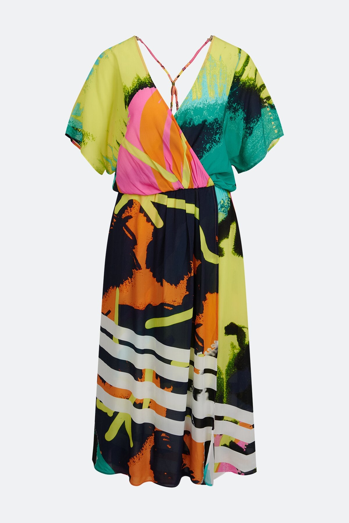 這件印花人造絲連衣裙採用深V領和半長度袖子,具有獨家全身印花。